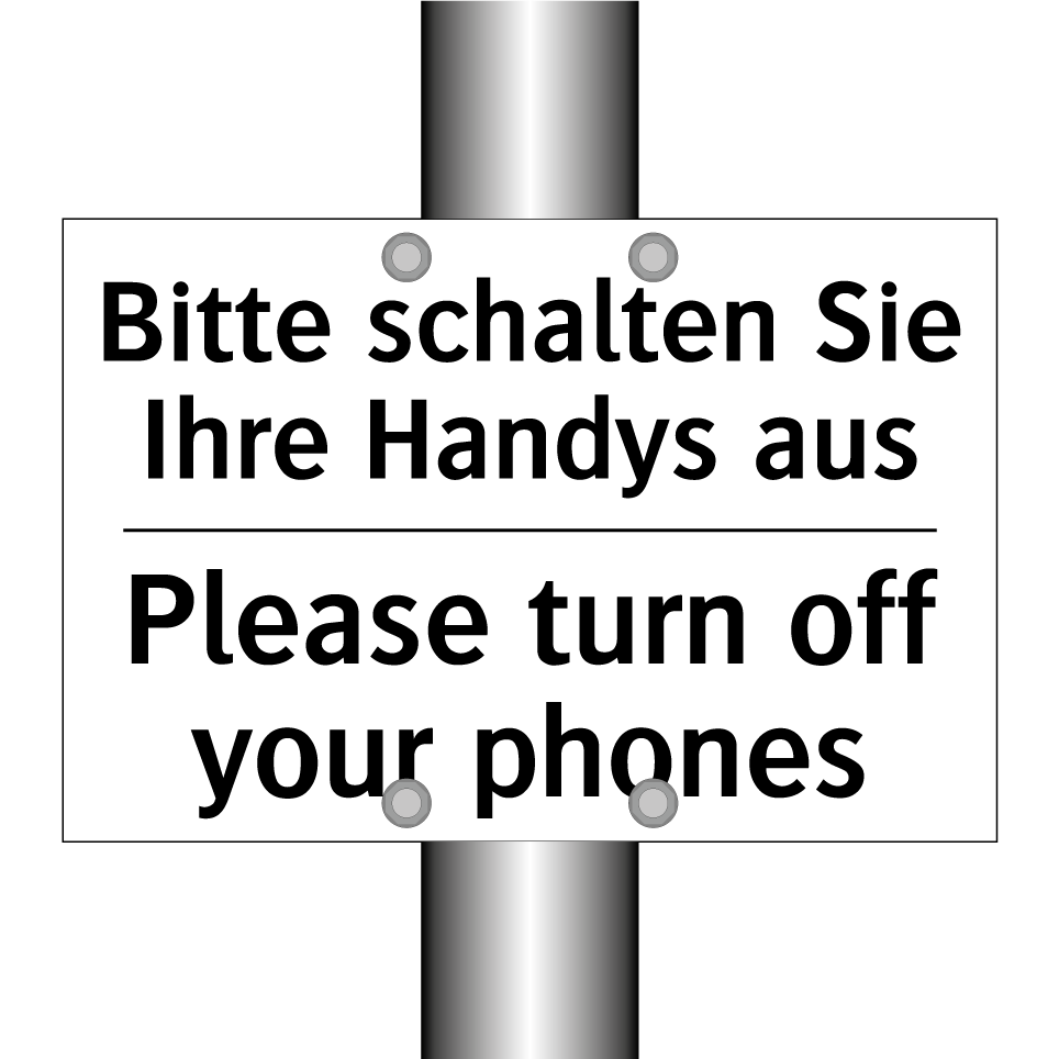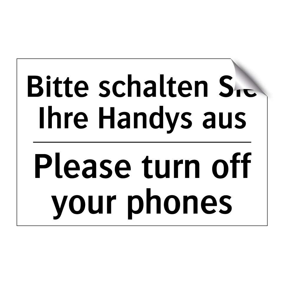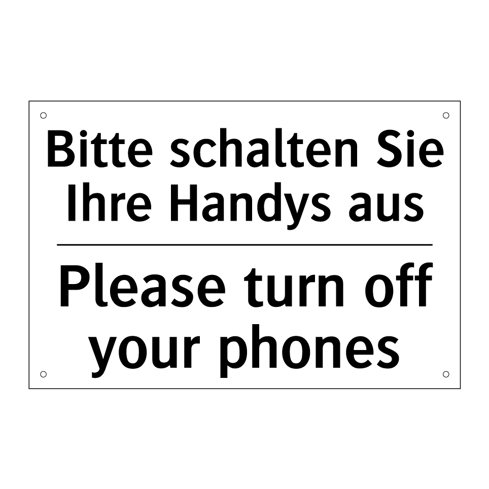 Zweisprachiges Verbotsschild mit deutschem Text Bitte schalten Sie Ihre Handys aus und englischem Text Please turn off your phones