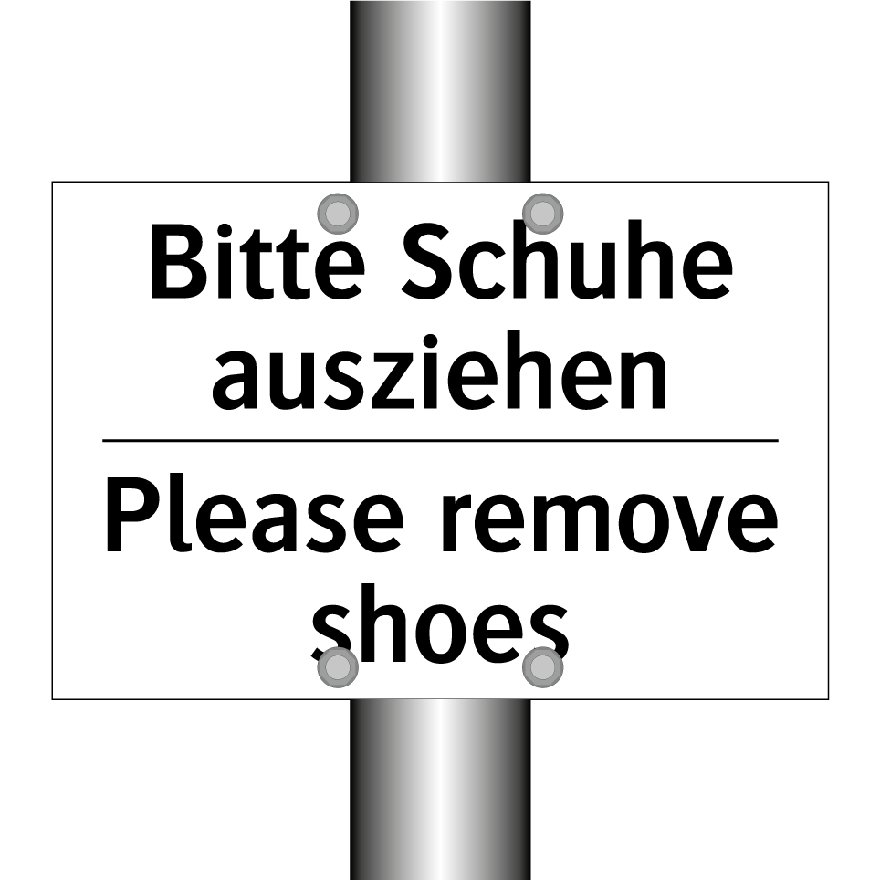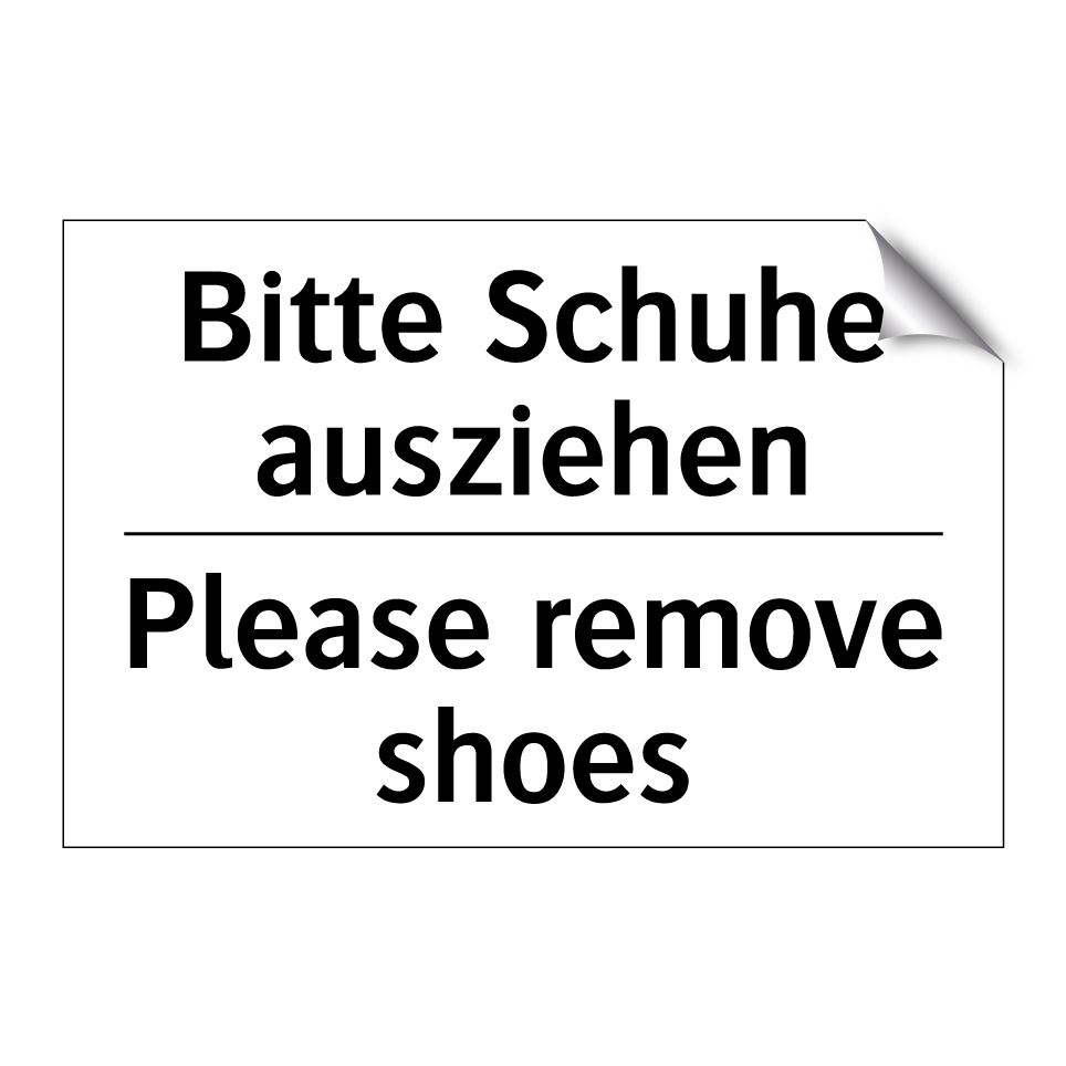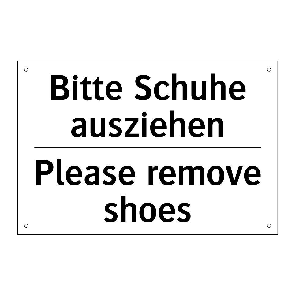 Zweisprachiges Verbotsschild mit deutschem Text Bitte Schuhe ausziehen und englischem Text Please remove shoes