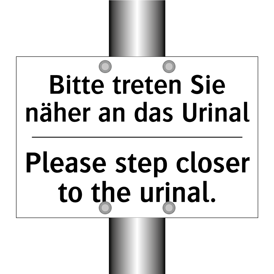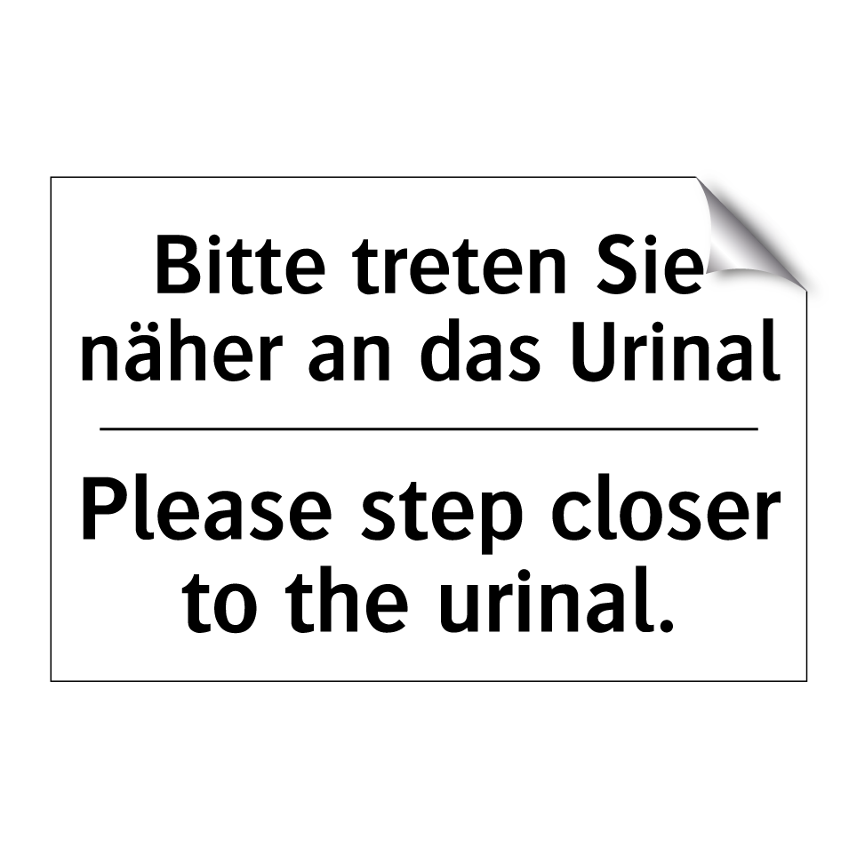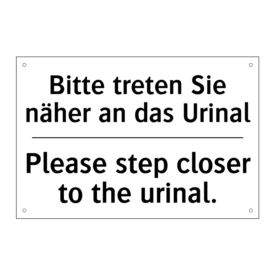 Zweisprachiges Verbotsschild mit deutschem Text Bitte treten Sie näher an das Urinal und englischem Text Please step closer to the urinal.
