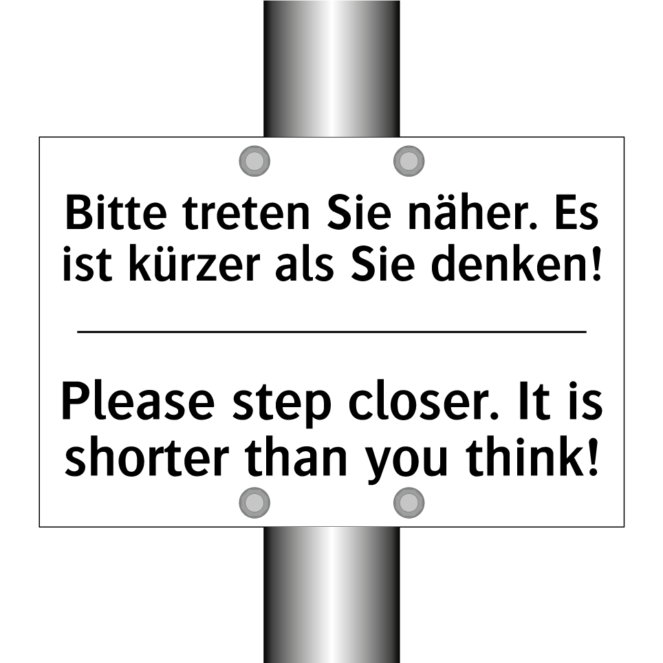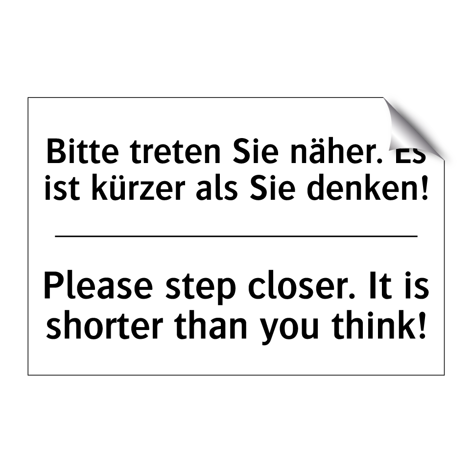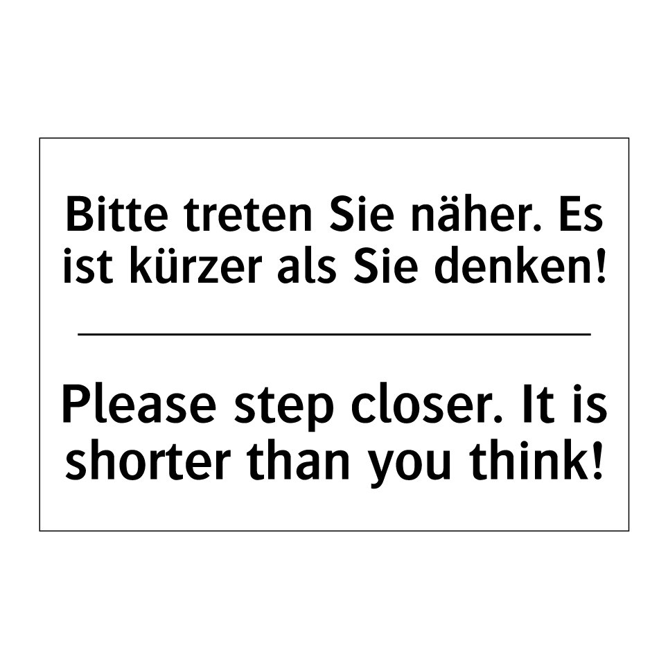 Zweisprachiges Verbotsschild mit deutschem Text Bitte treten Sie näher. Es ist kürzer als Sie denken! und englischem Text Please step closer. It is shorter than you think!