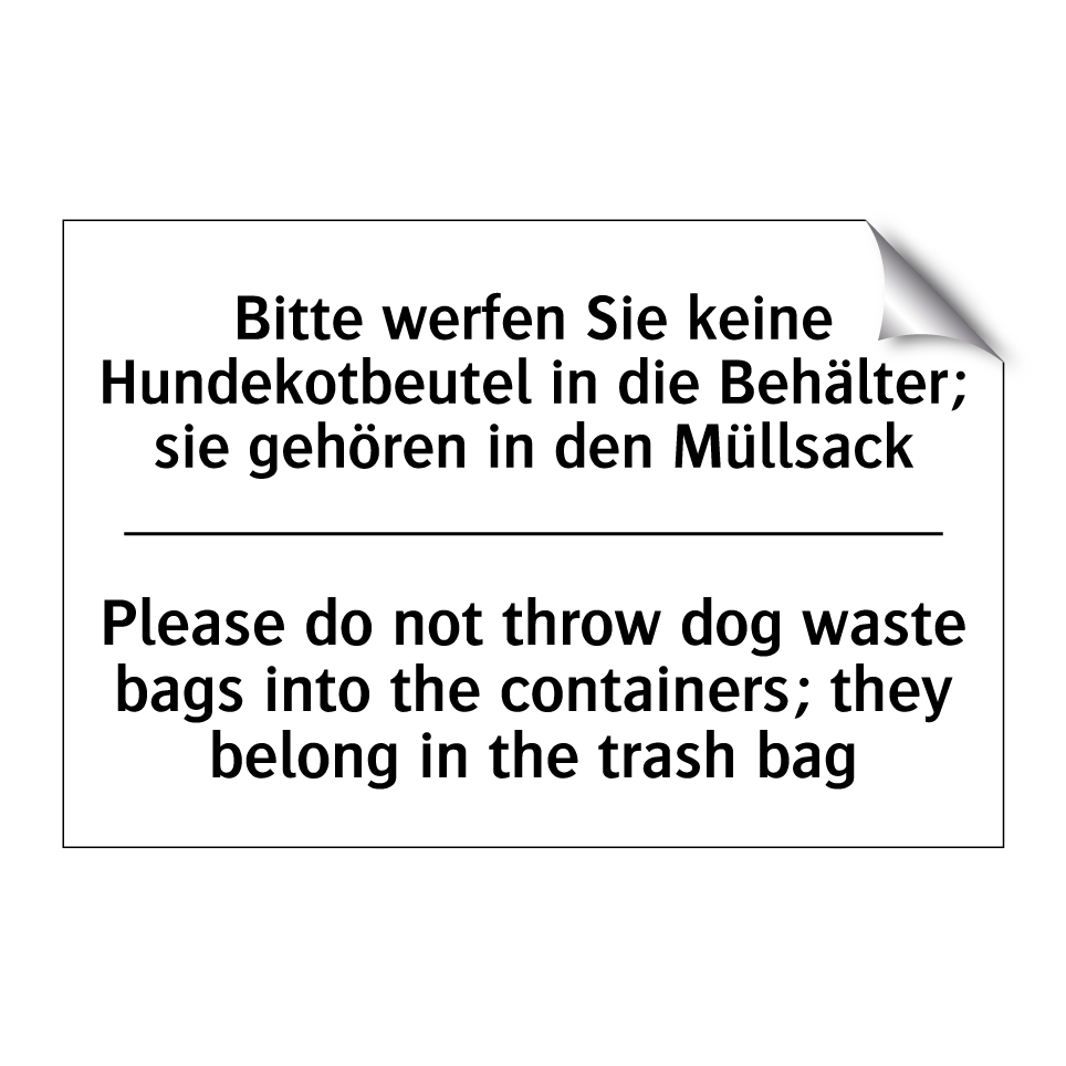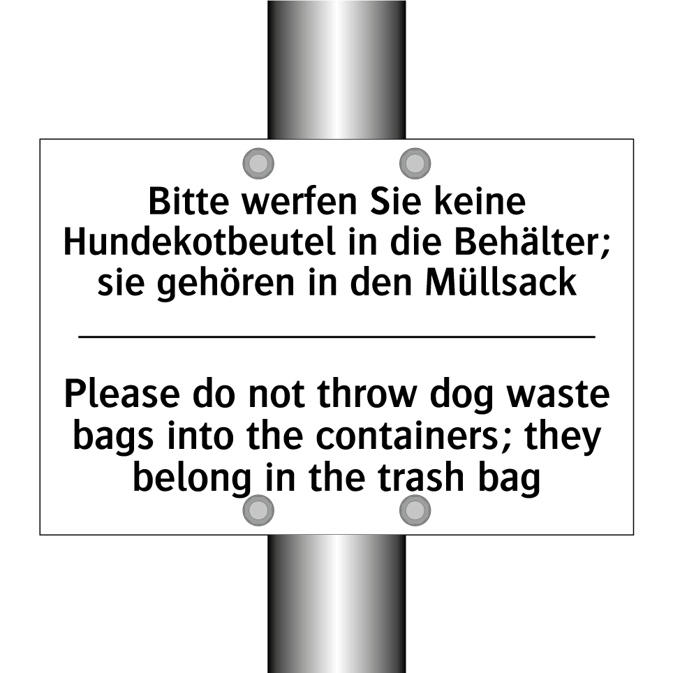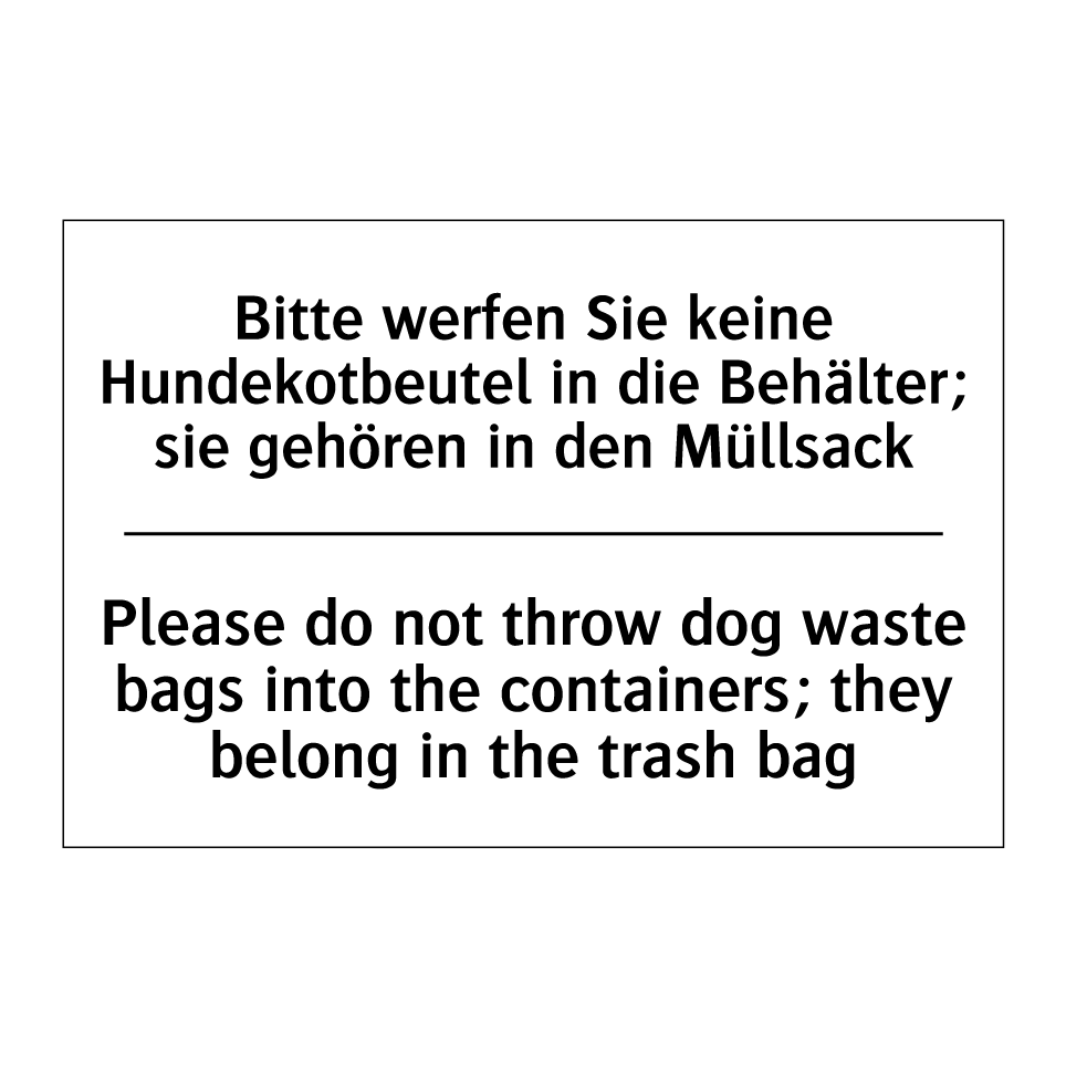 Zweisprachiges Verbotsschild mit deutschem Text Bitte werfen Sie keine Hundekotbeutel in die Behälter; sie gehören in den Müllsack und englischem Text Please do not throw dog waste bags into the containers; they belong in the trash bag
