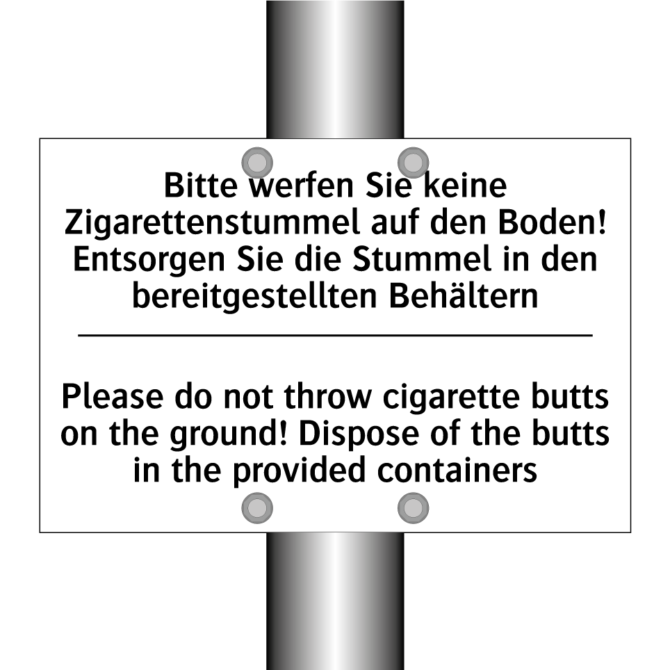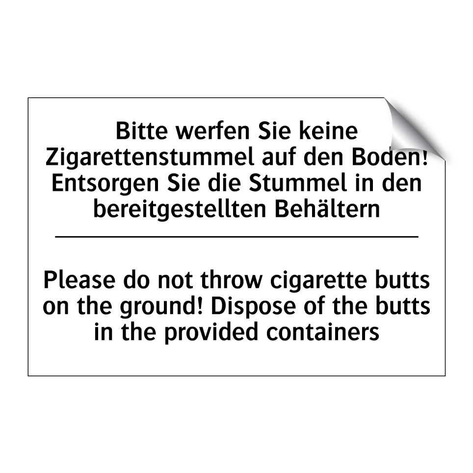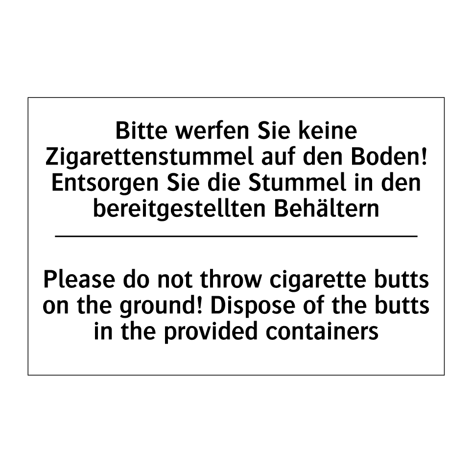 Zweisprachiges Verbotsschild mit deutschem Text Bitte werfen Sie keine Zigarettenstummel auf den Boden! Entsorgen Sie die Stummel in den bereitgestellten Behältern und englischem Text Please do not throw cigarette butts on the ground! Dispose of the butts in the provided containers