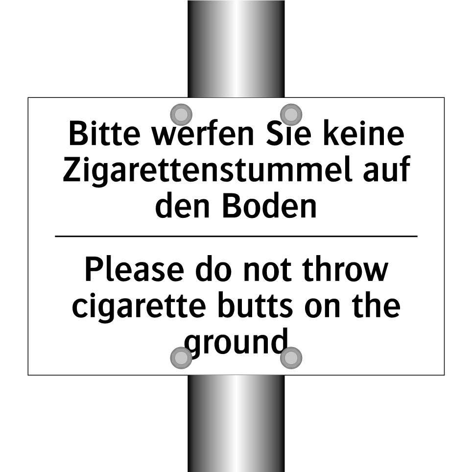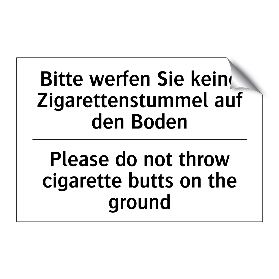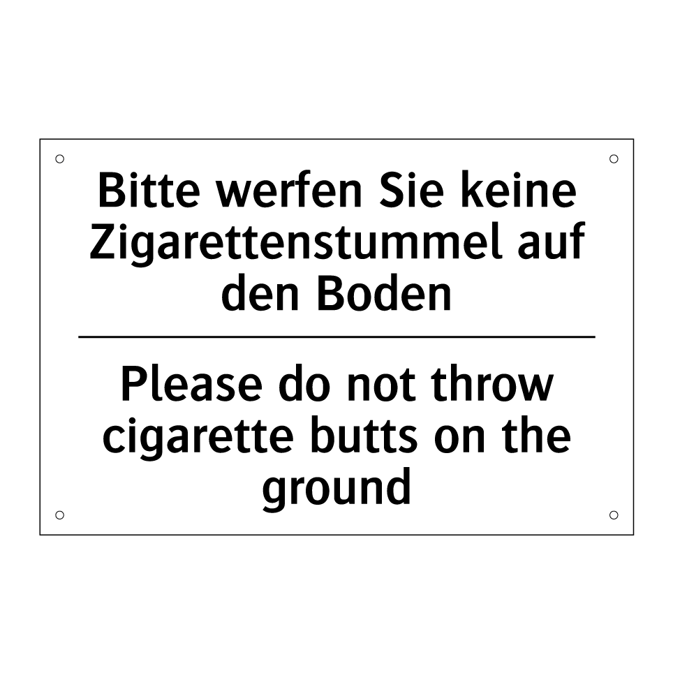 Zweisprachiges Verbotsschild mit deutschem Text Bitte werfen Sie keine Zigarettenstummel auf den Boden und englischem Text Please do not throw cigarette butts on the ground