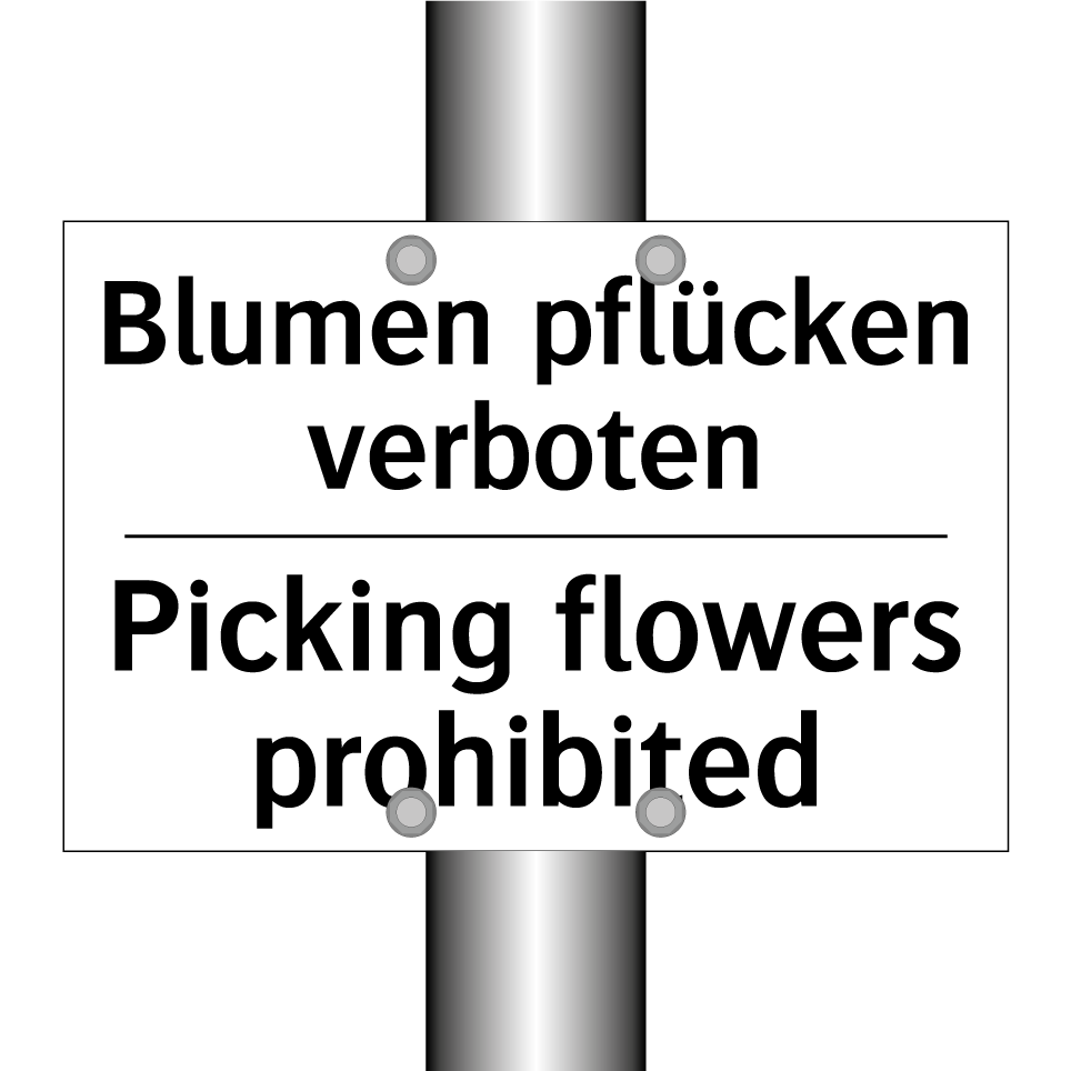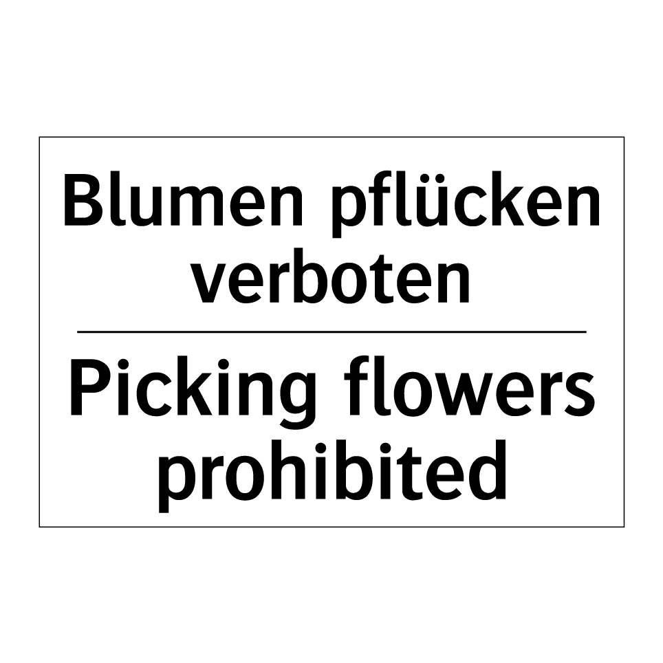 Zweisprachiges Verbotsschild mit deutschem Text Blumen pflücken verboten und englischem Text Picking flowers prohibited