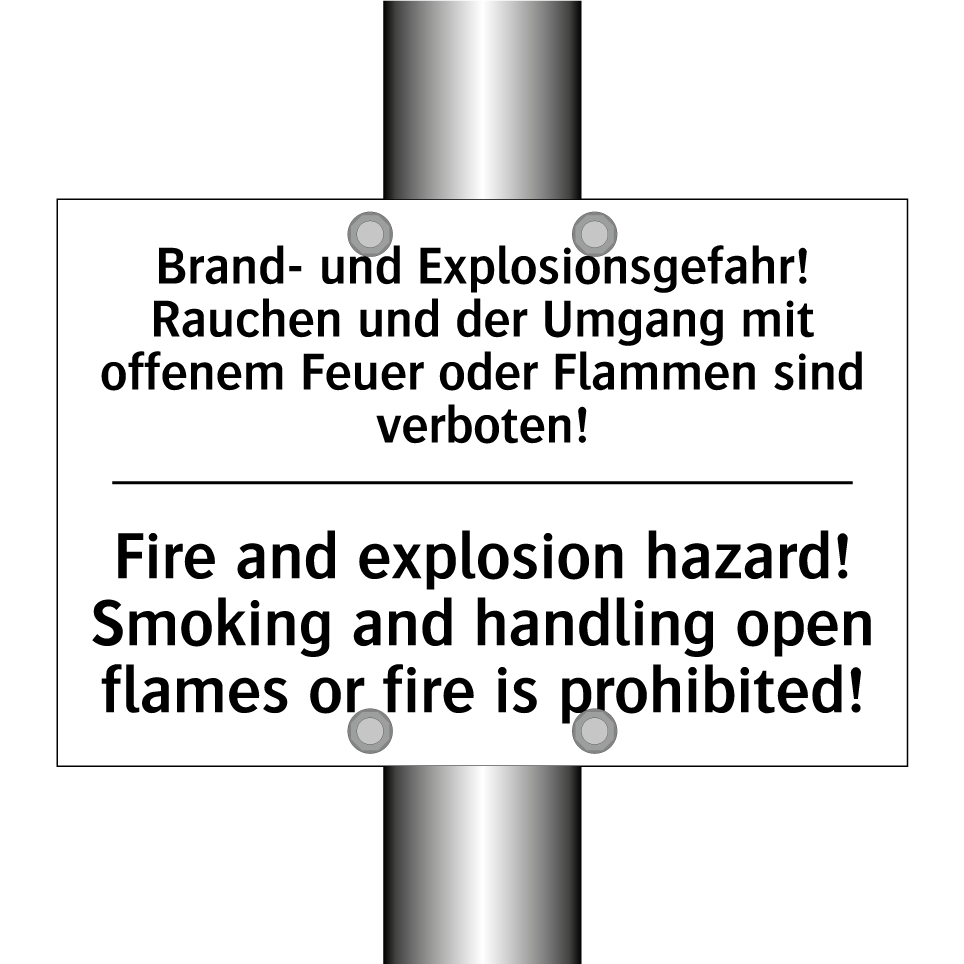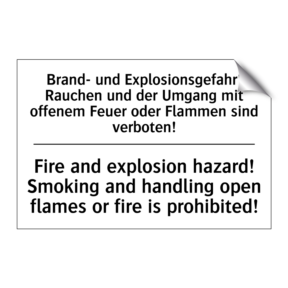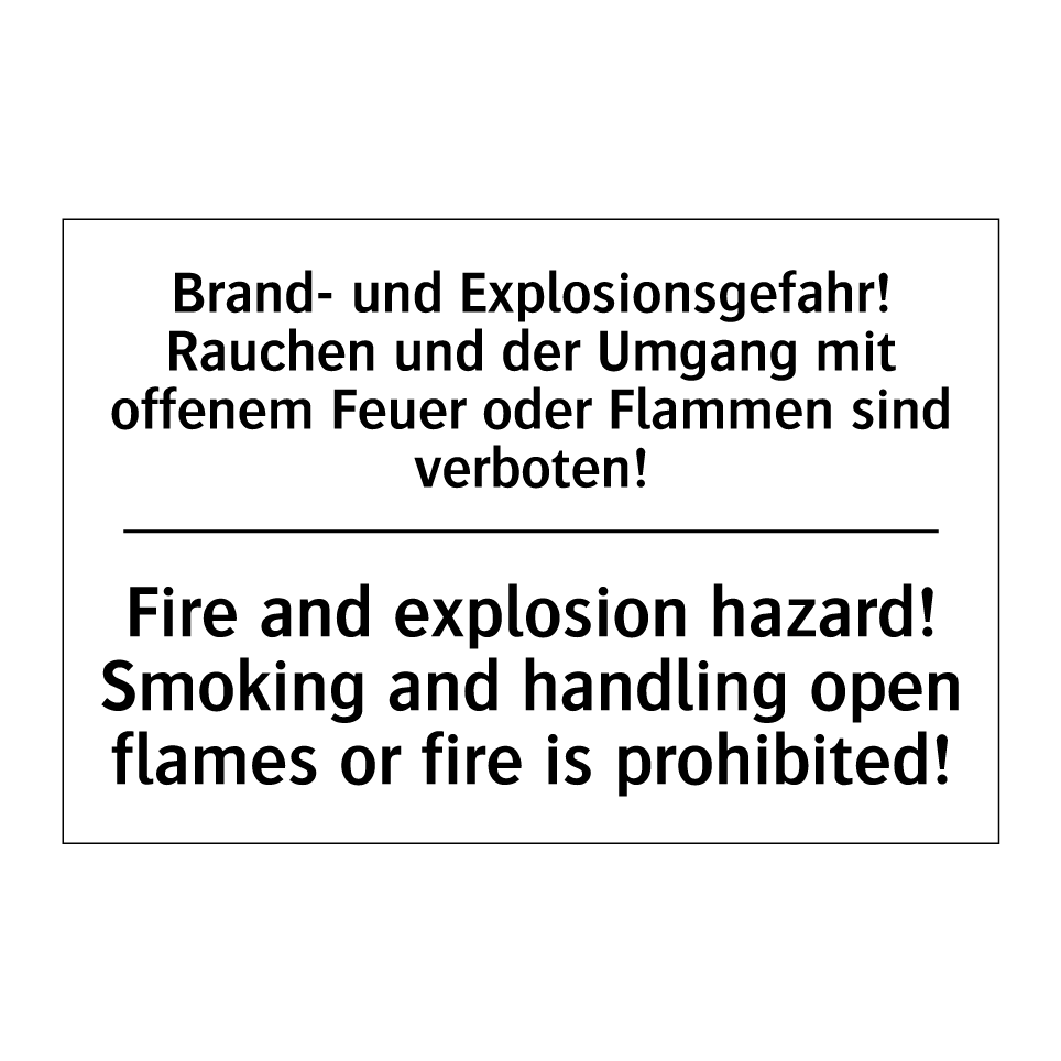 Zweisprachiges Verbotsschild mit deutschem Text Brand- und Explosionsgefahr! Rauchen und der Umgang mit offenem Feuer oder Flammen sind verboten! und englischem Text Fire and explosion hazard! Smoking and handling open flames or fire is prohibited!