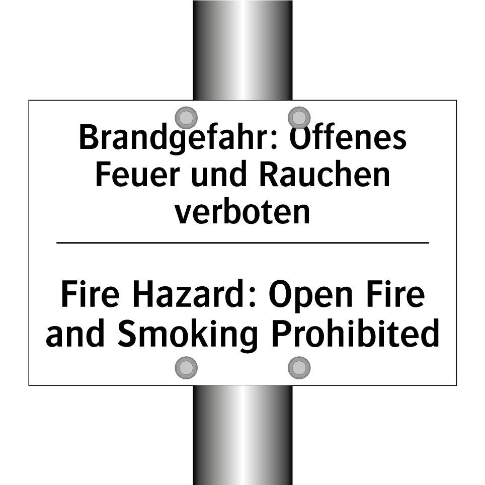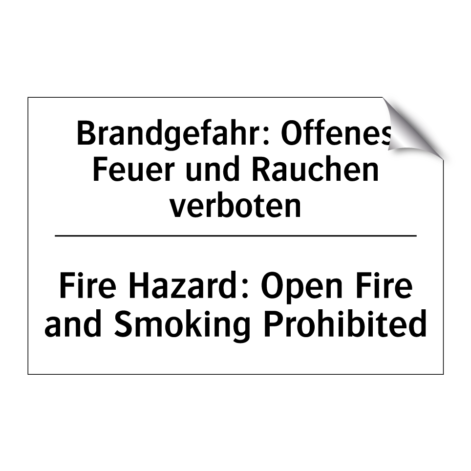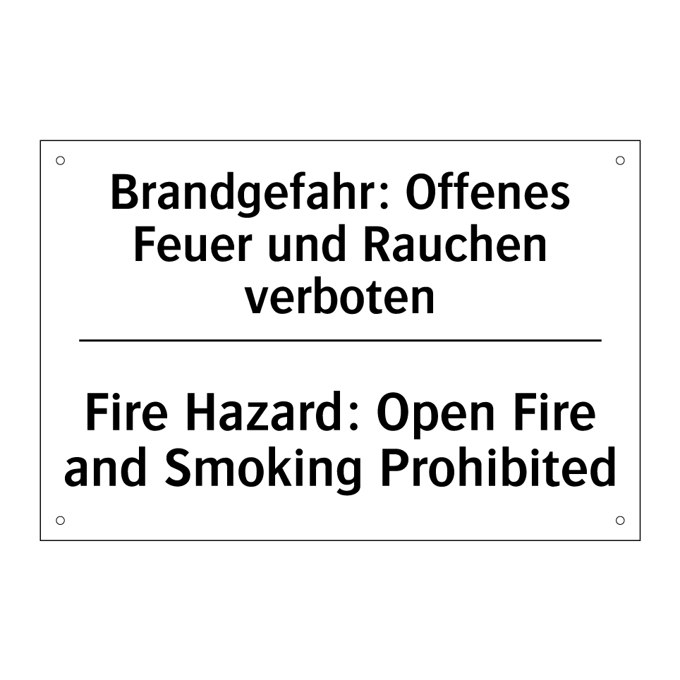 Zweisprachiges Verbotsschild mit deutschem Text Brandgefahr: Offenes Feuer und Rauchen verboten und englischem Text Fire Hazard: Open Fire and Smoking Prohibited