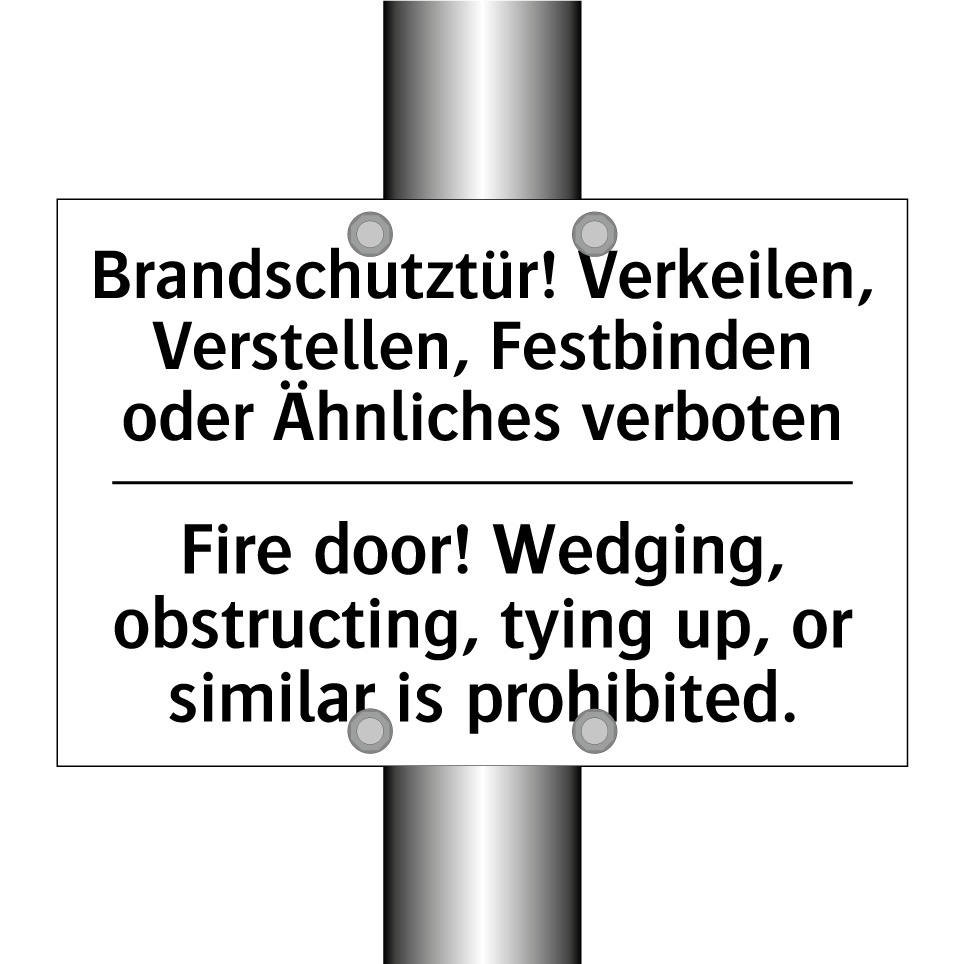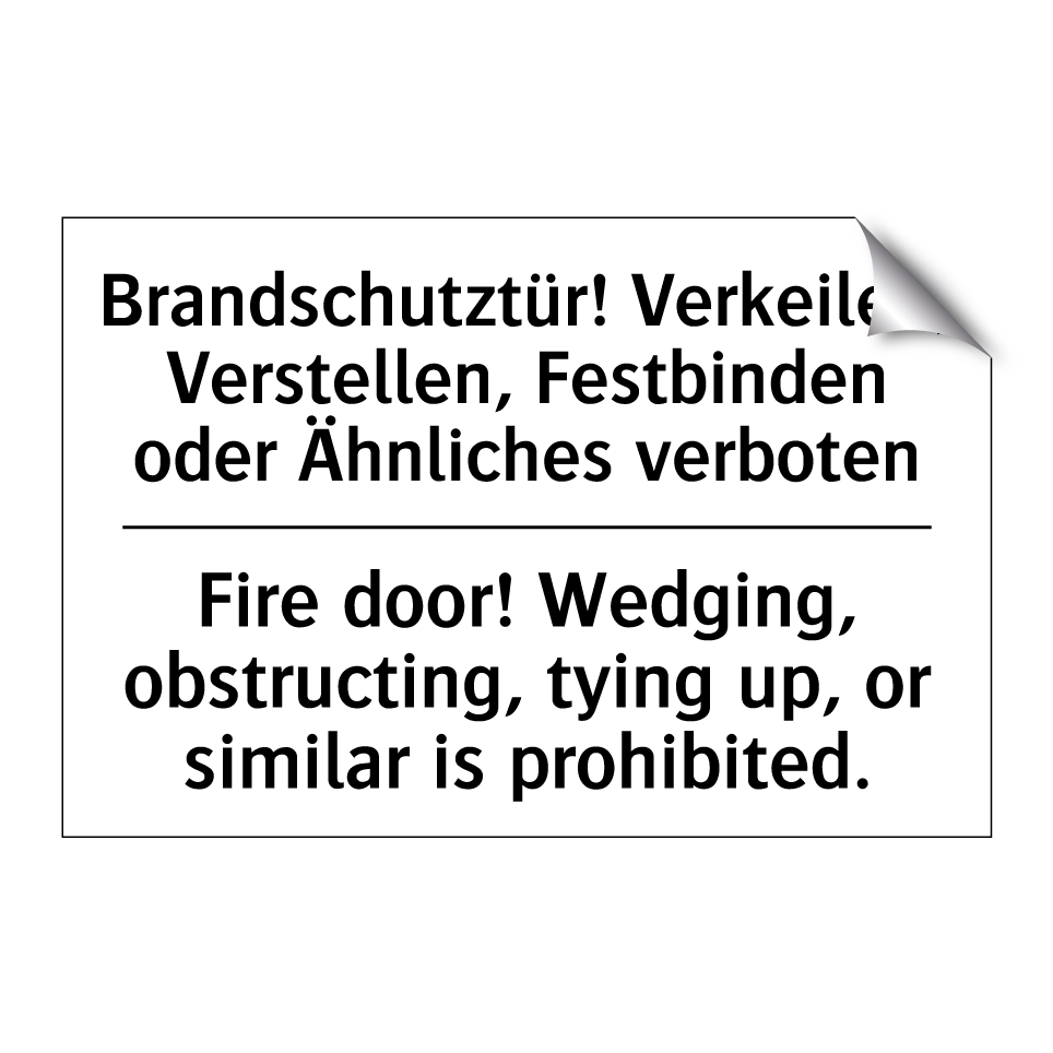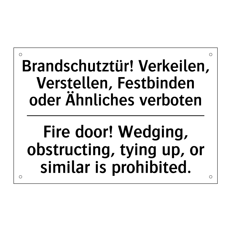 Zweisprachiges Verbotsschild mit deutschem Text Brandschutztür! Verkeilen, Verstellen, Festbinden oder Ähnliches verboten und englischem Text Fire door! Wedging, obstructing, tying up, or similar is prohibited.