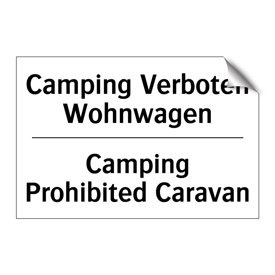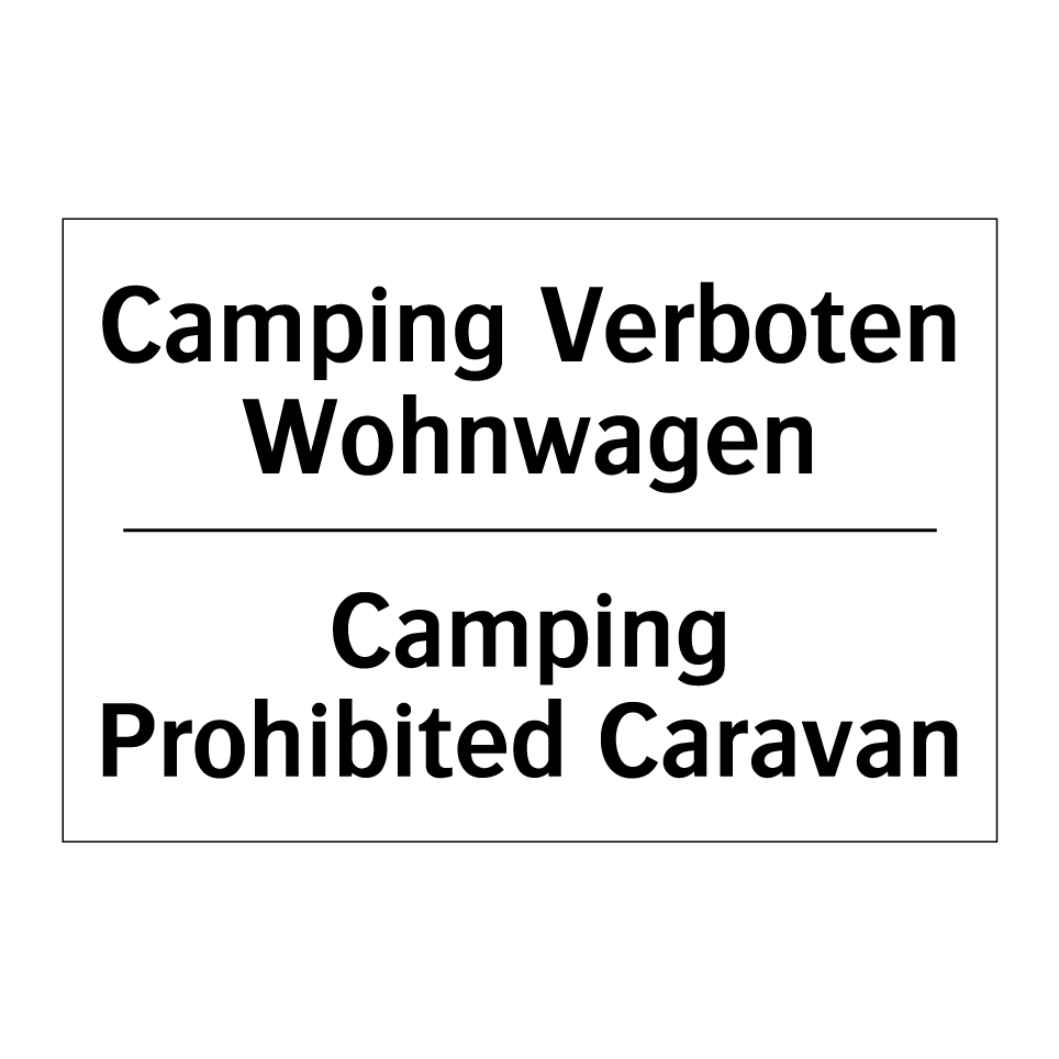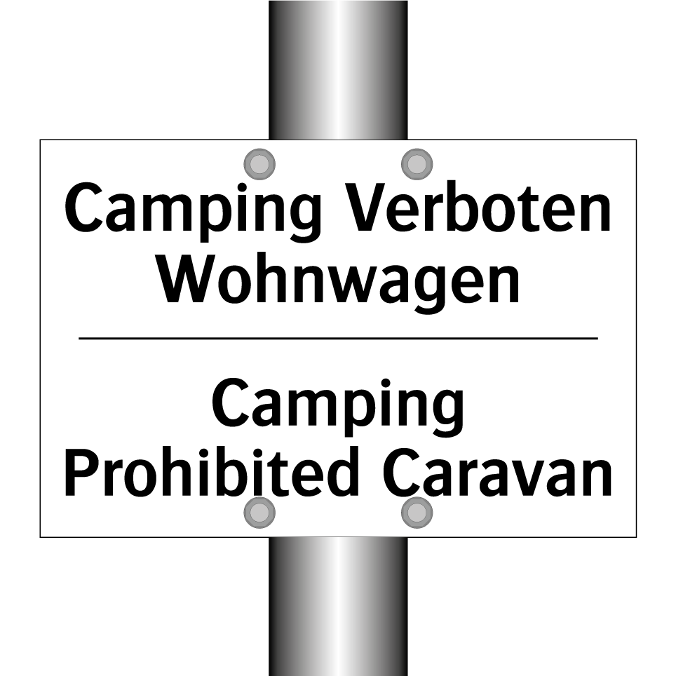 Zweisprachiges Verbotsschild mit deutschem Text Camping Verboten Wohnwagen und englischem Text Camping Prohibited Caravan