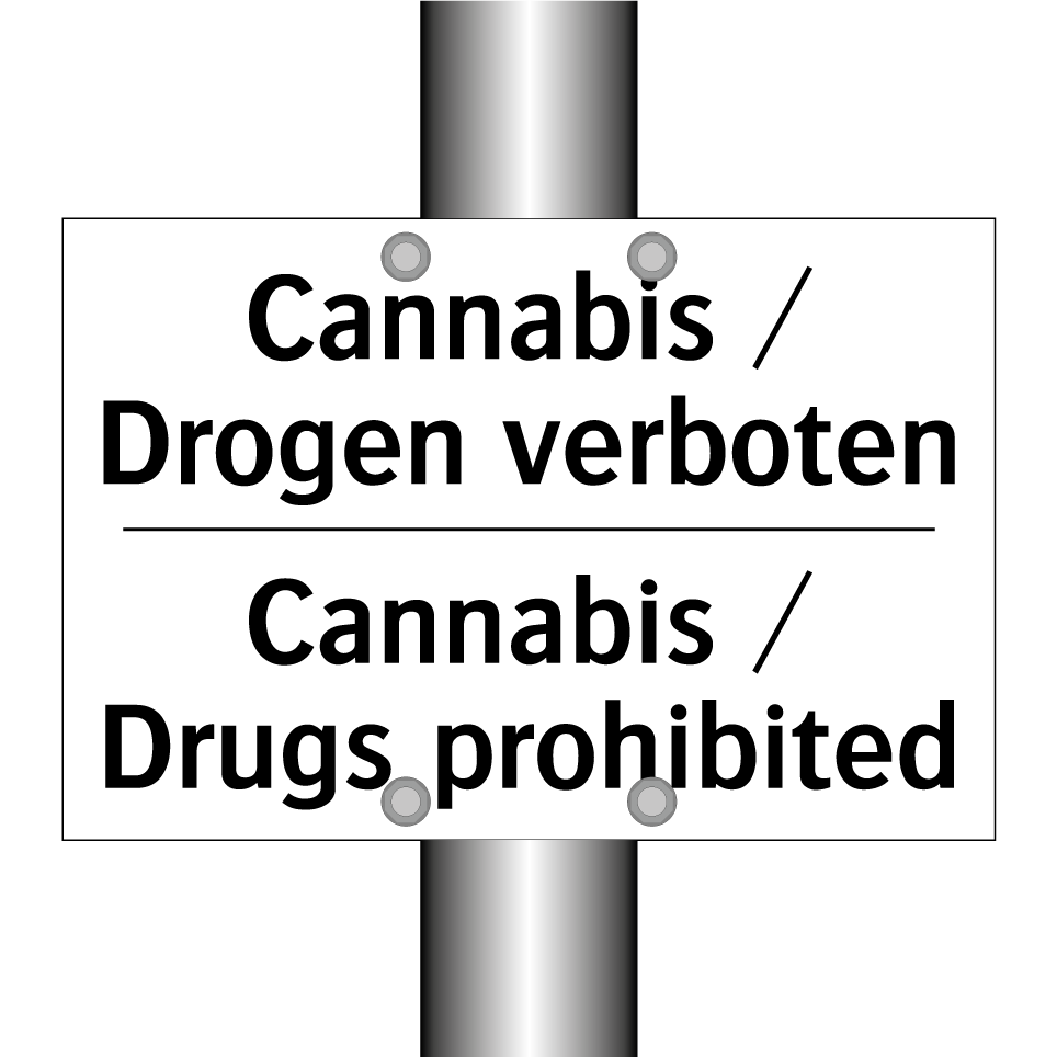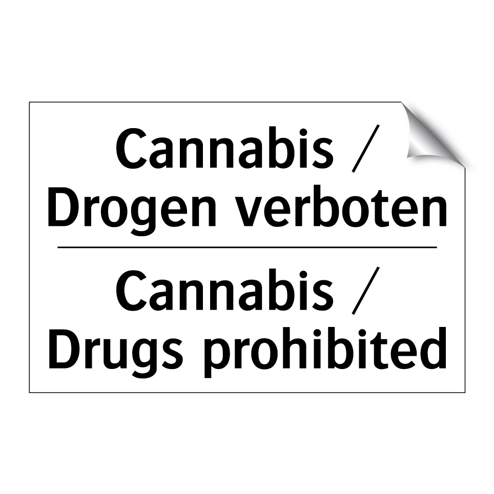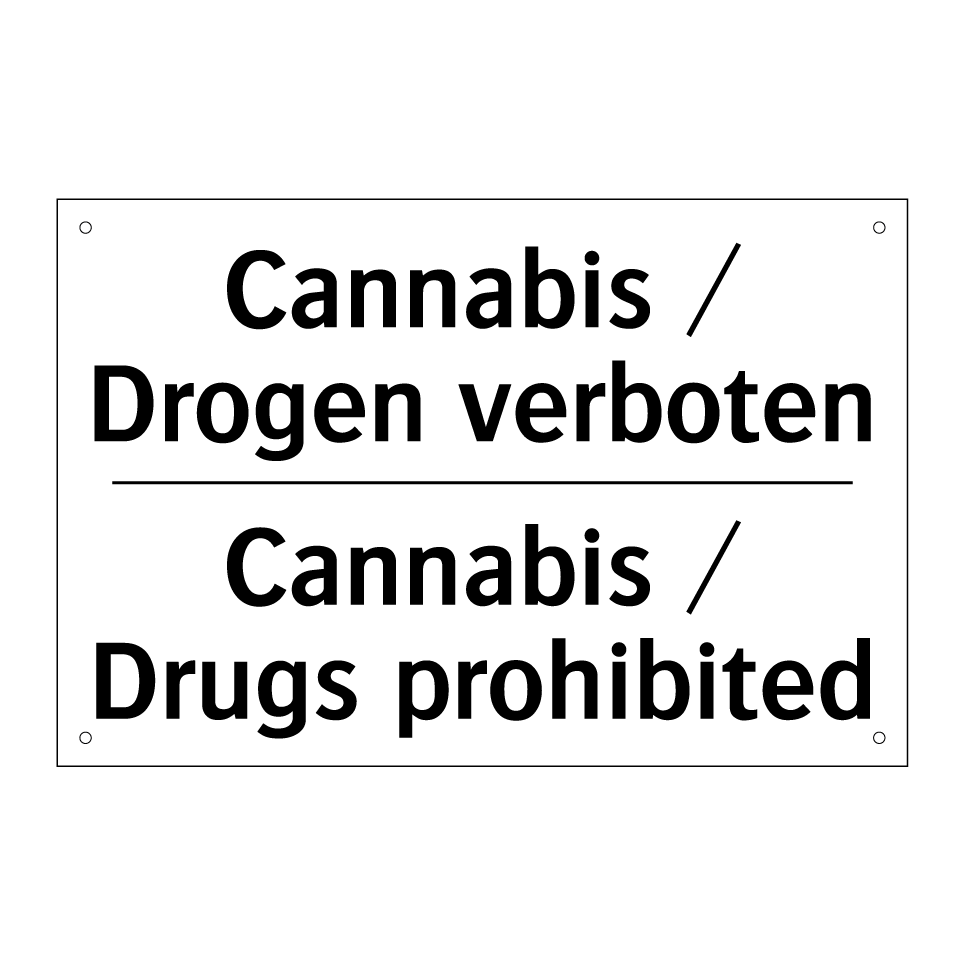 Zweisprachiges Verbotsschild mit deutschem Text Cannabis / Drogen verboten und englischem Text Cannabis / Drugs prohibited
