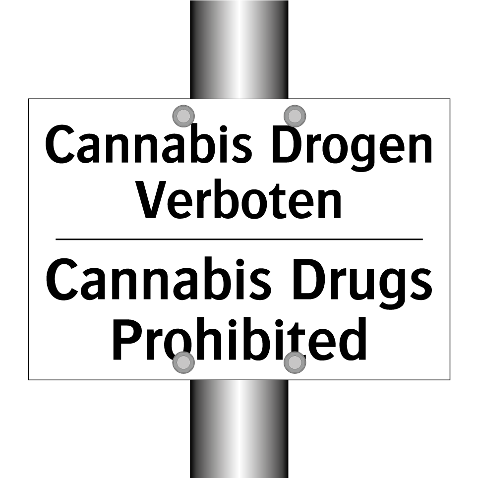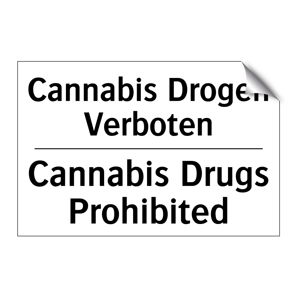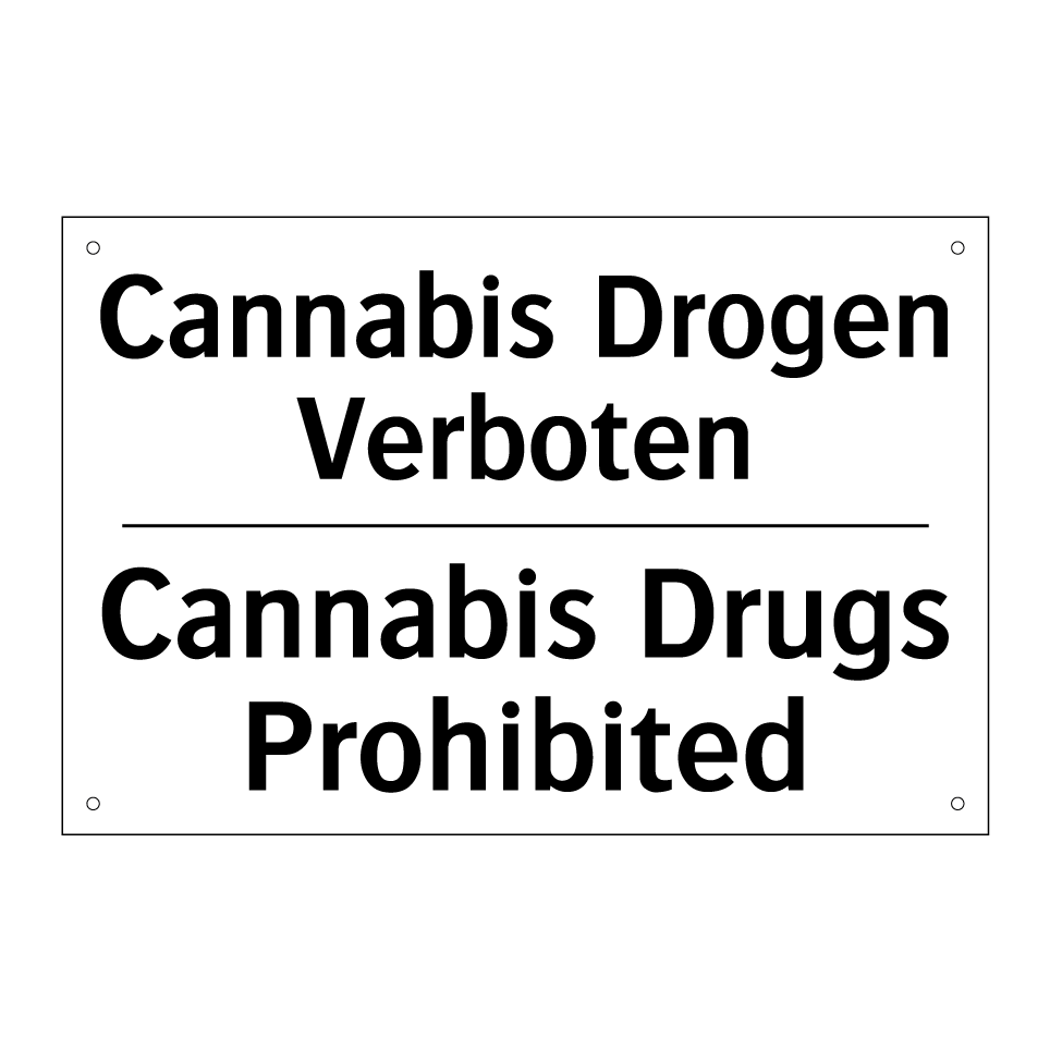 Zweisprachiges Verbotsschild mit deutschem Text Cannabis Drogen Verboten und englischem Text Cannabis Drugs Prohibited