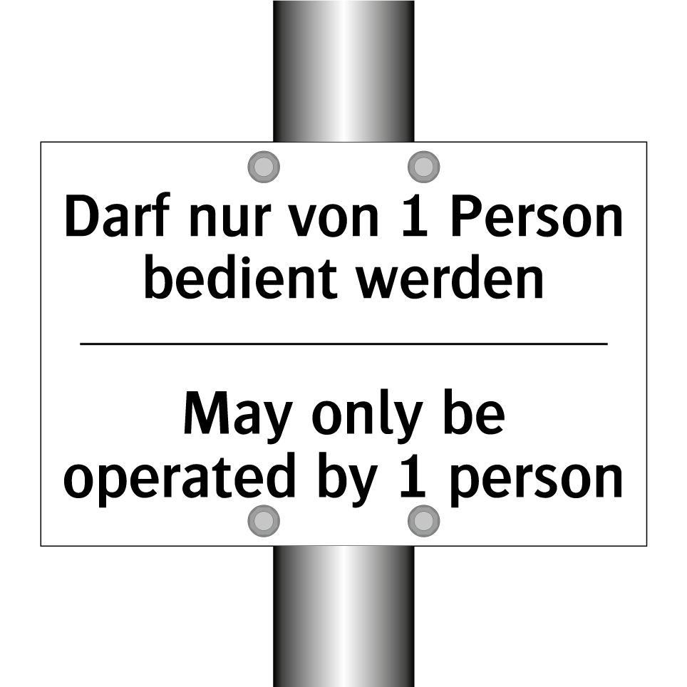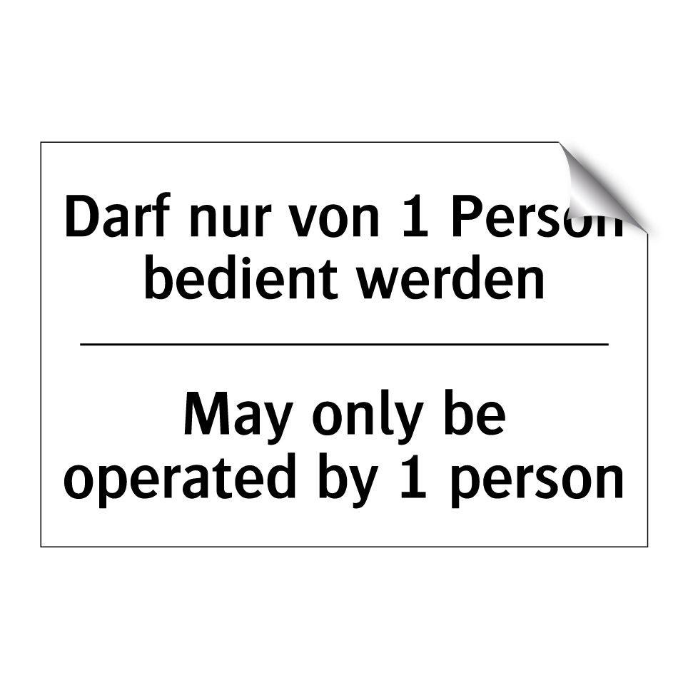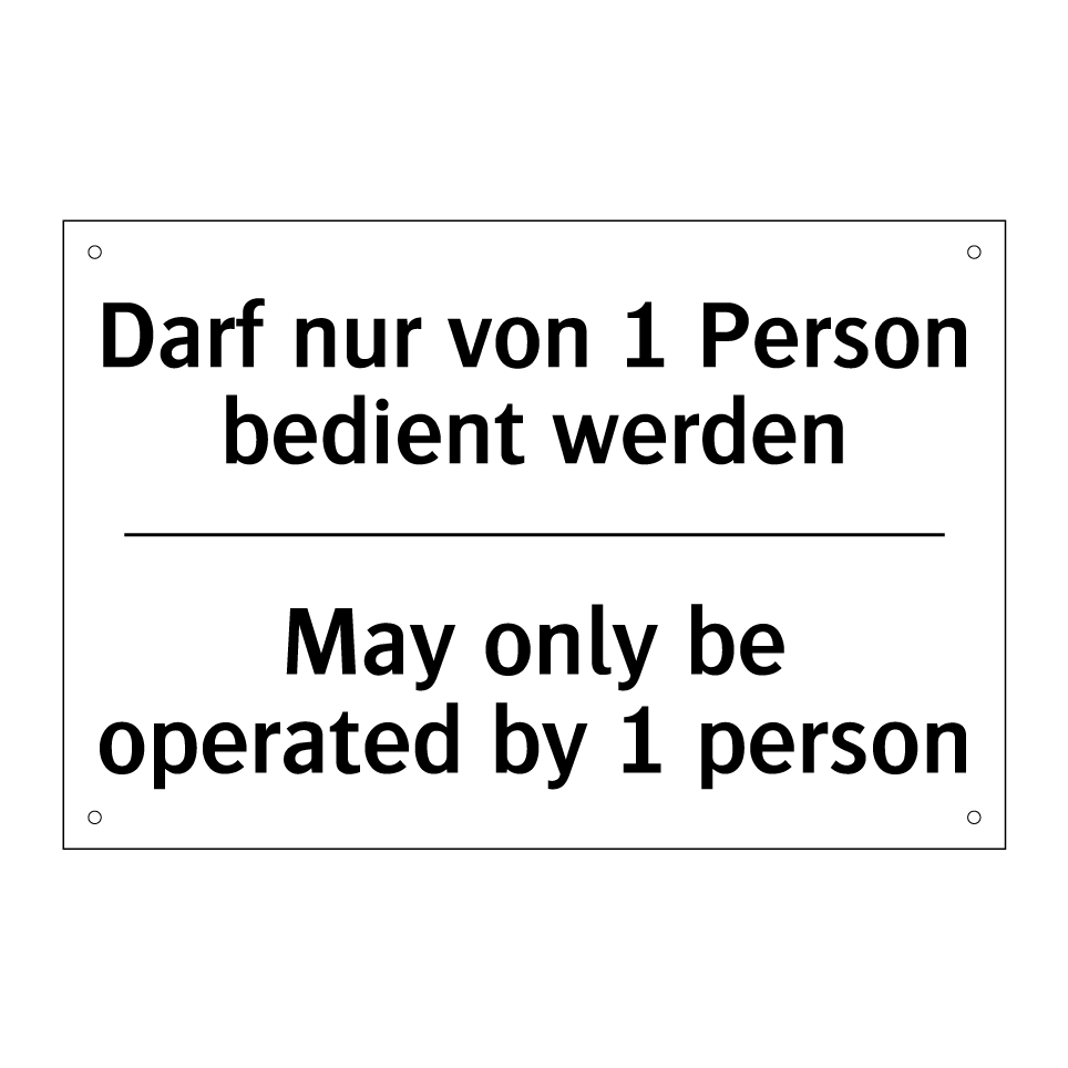 Zweisprachiges Verbotsschild mit deutschem Text Darf nur von 1 Person bedient werden und englischem Text May only be operated by 1 person