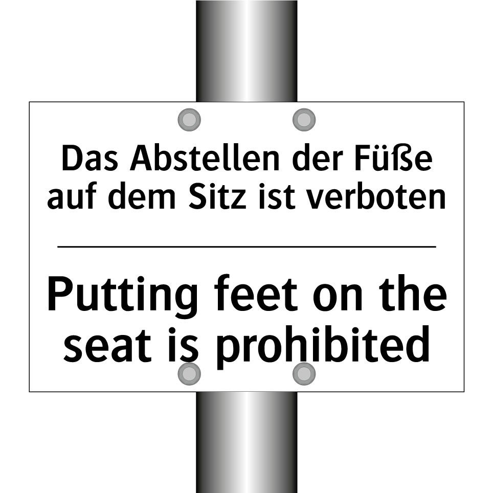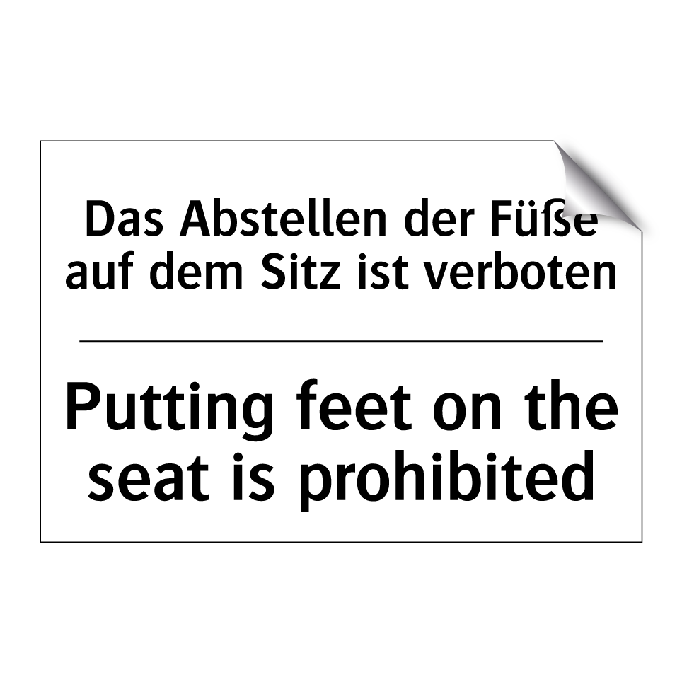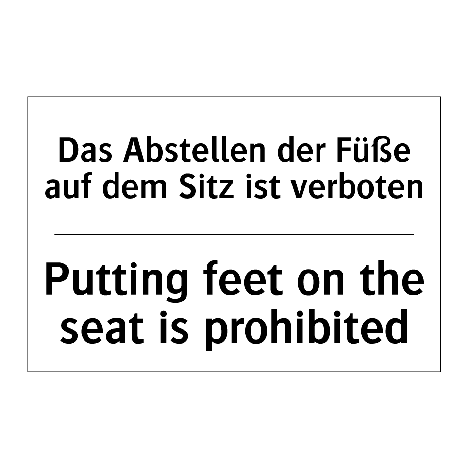 Zweisprachiges Verbotsschild mit deutschem Text Das Abstellen der Füße auf dem Sitz ist verboten und englischem Text Putting feet on the seat is prohibited