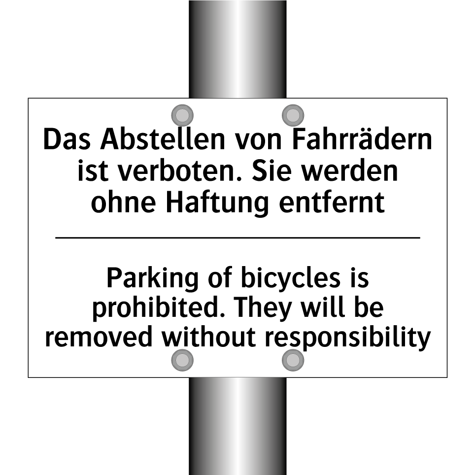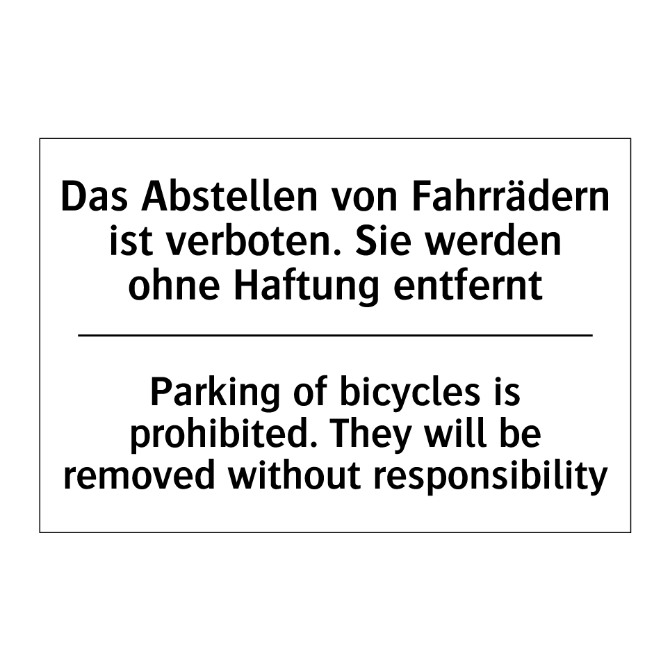 Zweisprachiges Verbotsschild mit deutschem Text Das Abstellen von Fahrrädern ist verboten. Sie werden ohne Haftung entfernt und englischem Text Parking of bicycles is prohibited. They will be removed without responsibility
