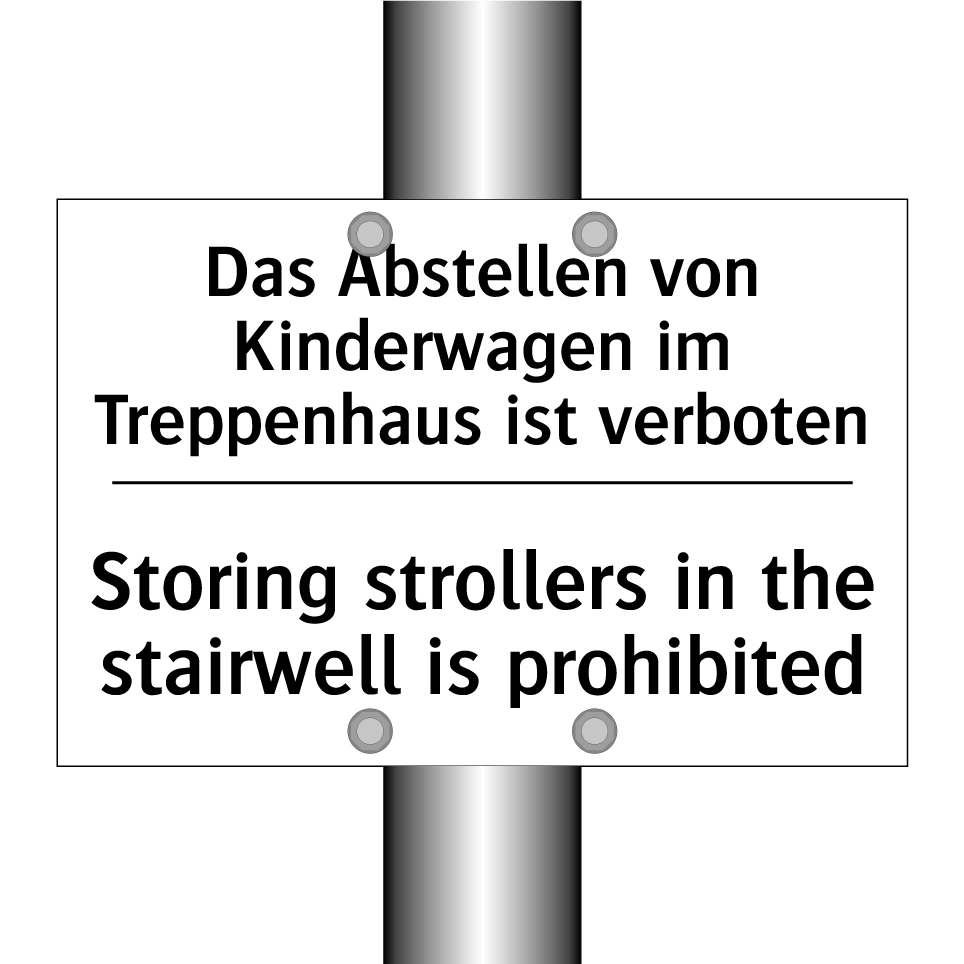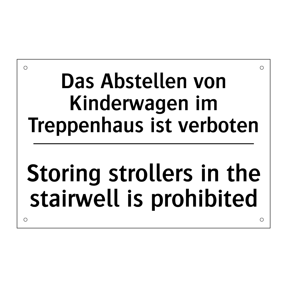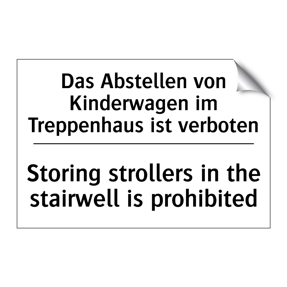 Zweisprachiges Verbotsschild mit deutschem Text Das Abstellen von Kinderwagen im Treppenhaus ist verboten und englischem Text Storing strollers in the stairwell is prohibited