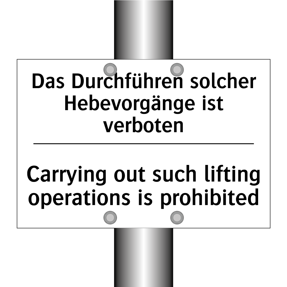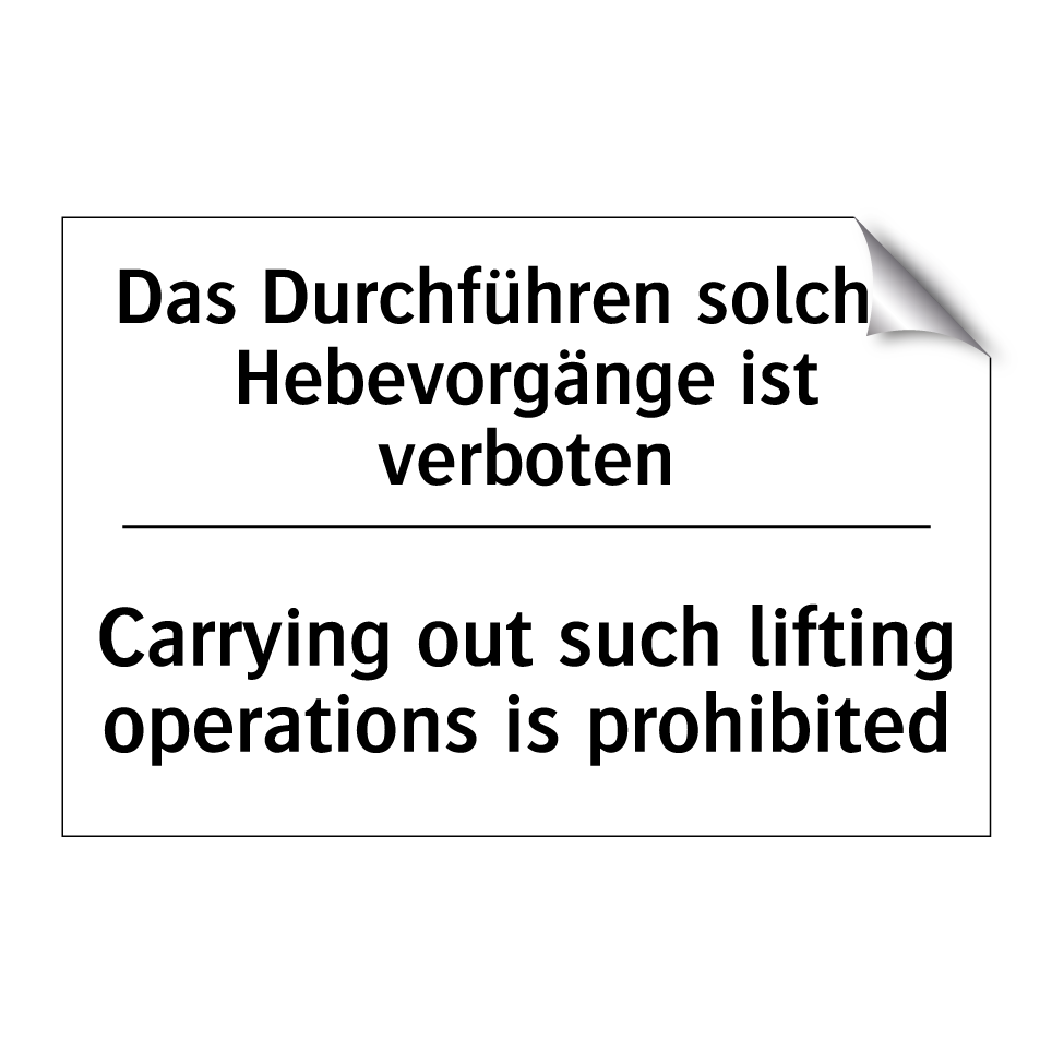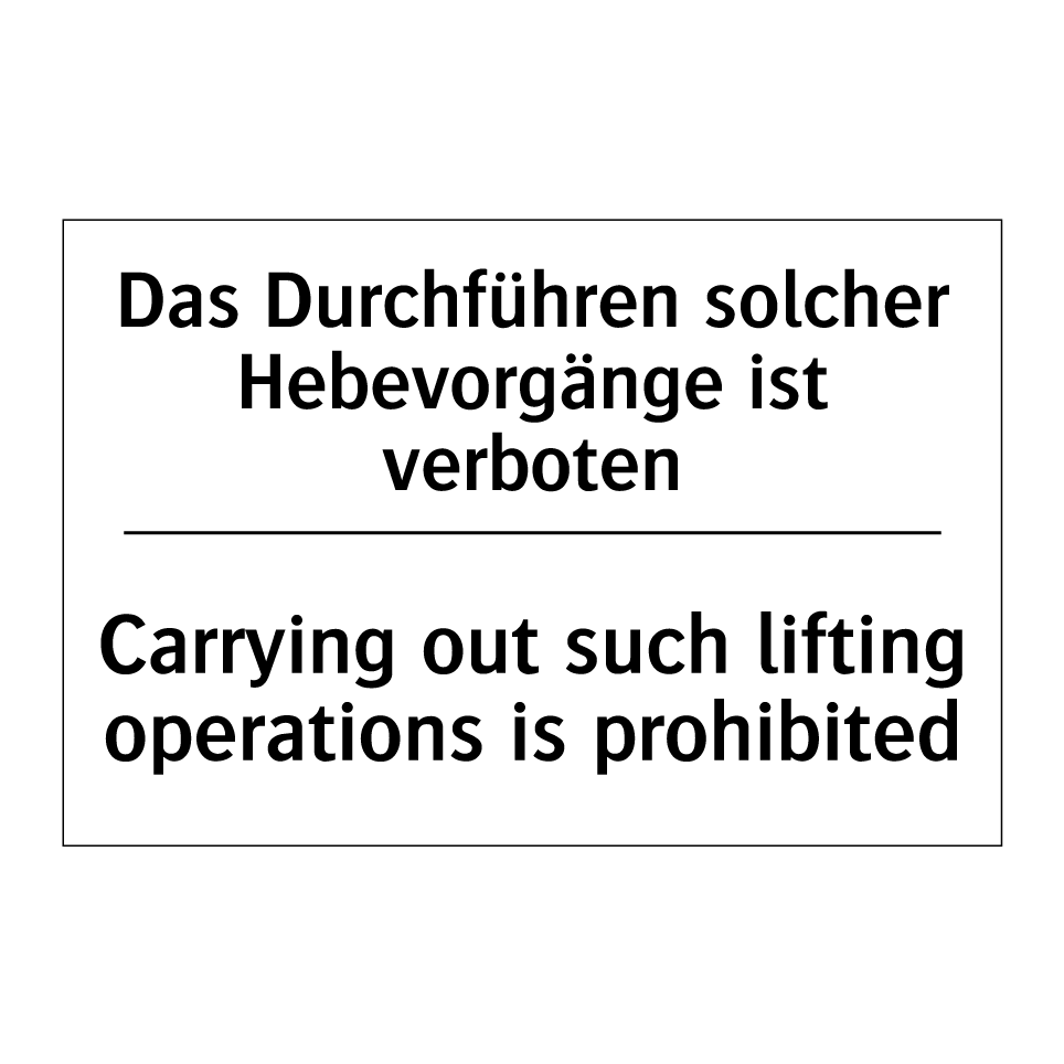 Zweisprachiges Verbotsschild mit deutschem Text Das Durchführen solcher Hebevorgänge ist verboten und englischem Text Carrying out such lifting operations is prohibited
