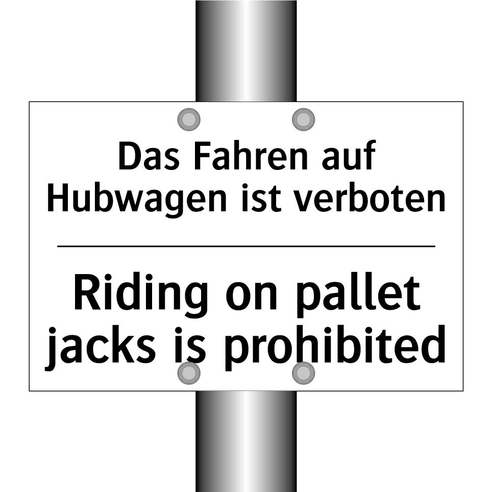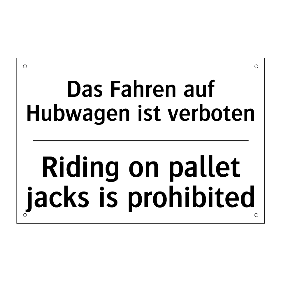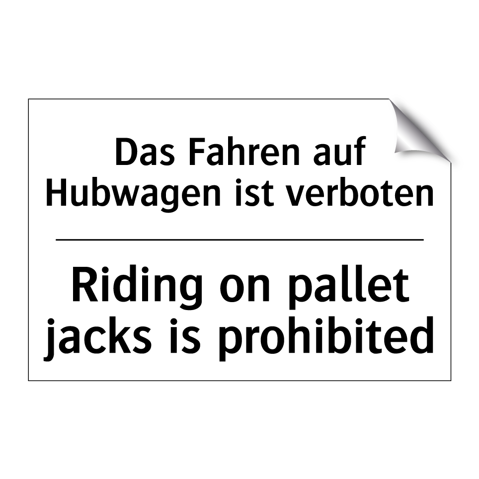 Zweisprachiges Verbotsschild mit deutschem Text Das Fahren auf Hubwagen ist verboten und englischem Text Riding on pallet jacks is prohibited