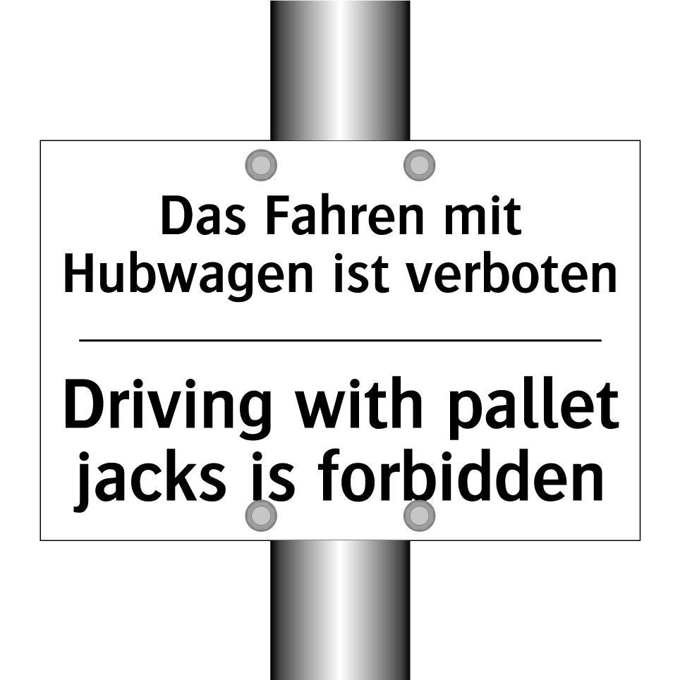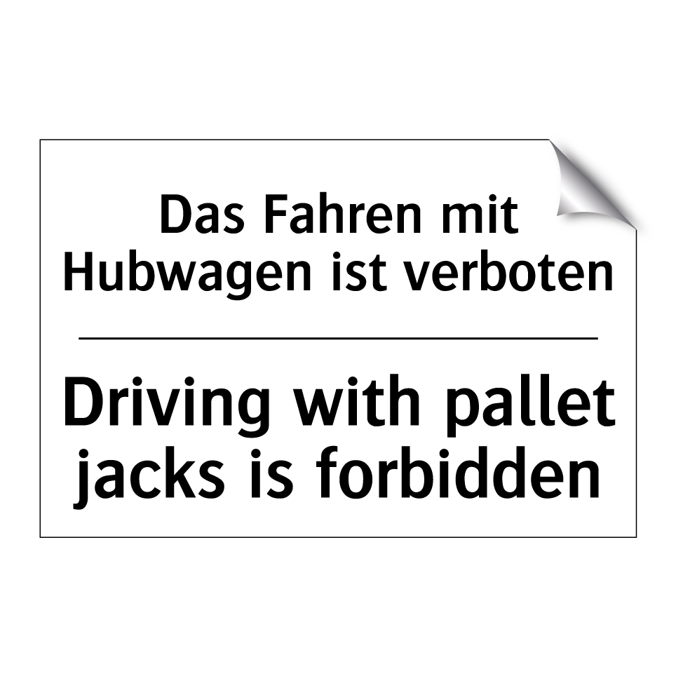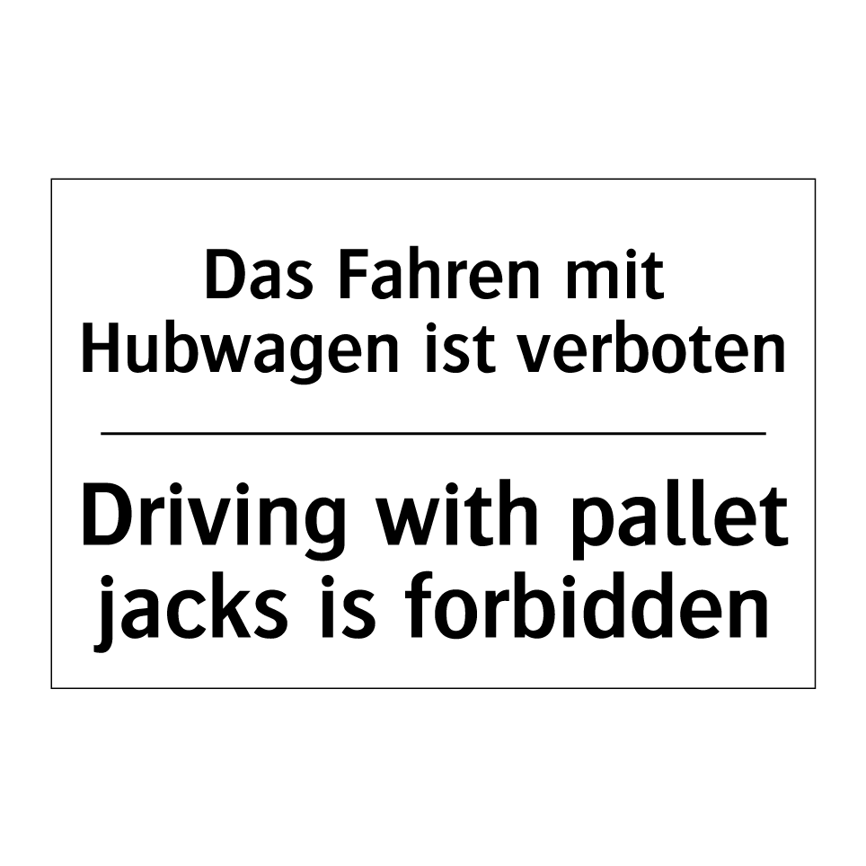 Zweisprachiges Verbotsschild mit deutschem Text Das Fahren mit Hubwagen ist verboten und englischem Text Driving with pallet jacks is forbidden