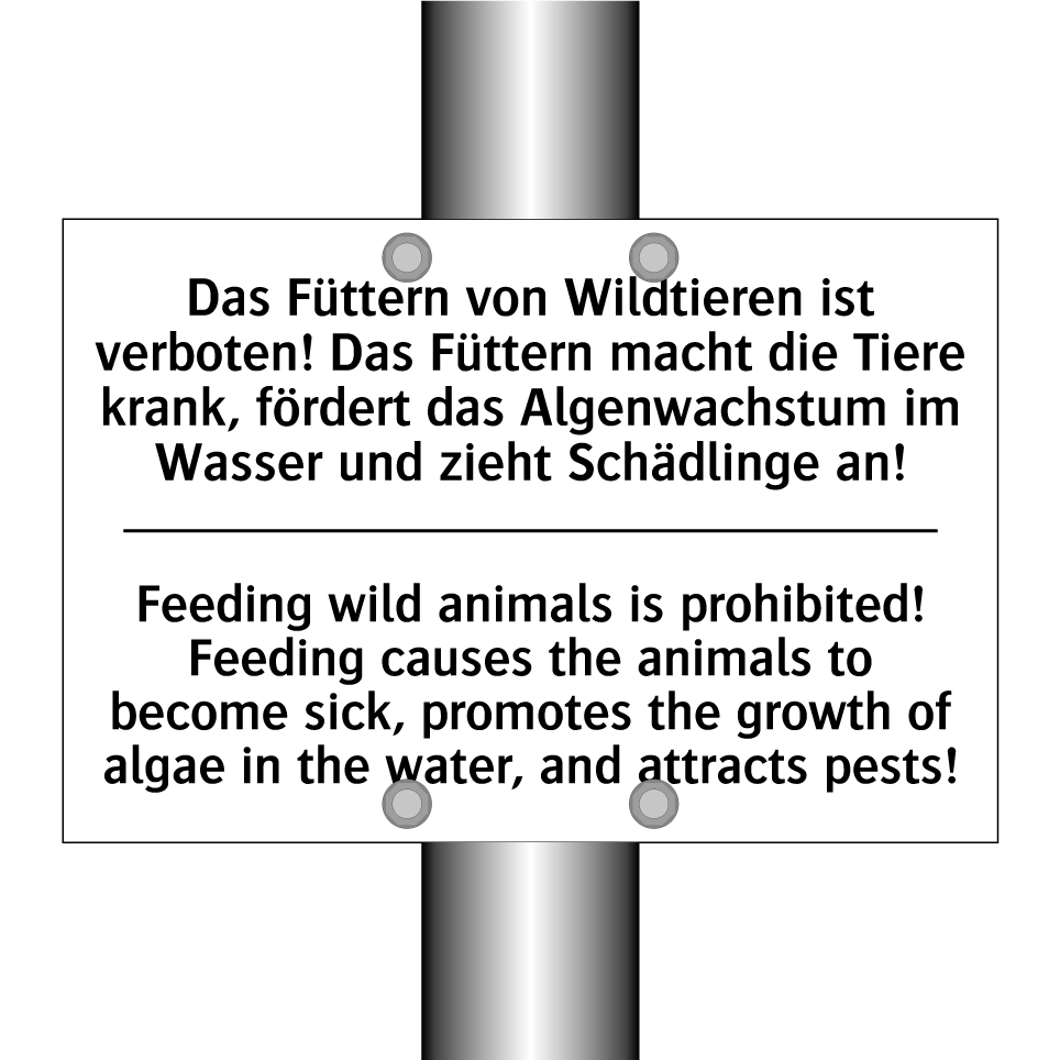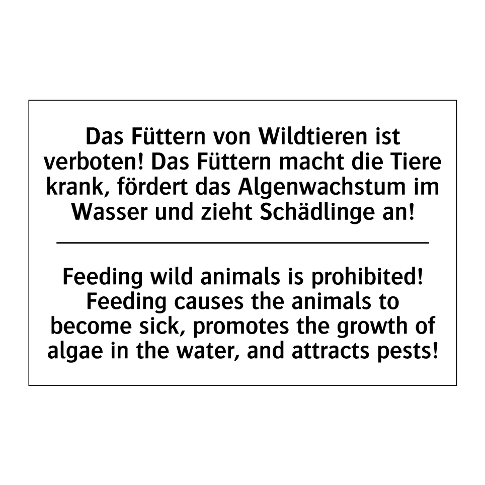 Zweisprachiges Verbotsschild mit deutschem Text Das Füttern von Wildtieren ist verboten! Das Füttern macht die Tiere krank, fördert das Algenwachstum im Wasser und zieht Schädlinge an! und englischem Text Feeding wild animals is prohibited! Feeding causes the animals to become sick, promotes the growth of algae in the water, and attracts pests!