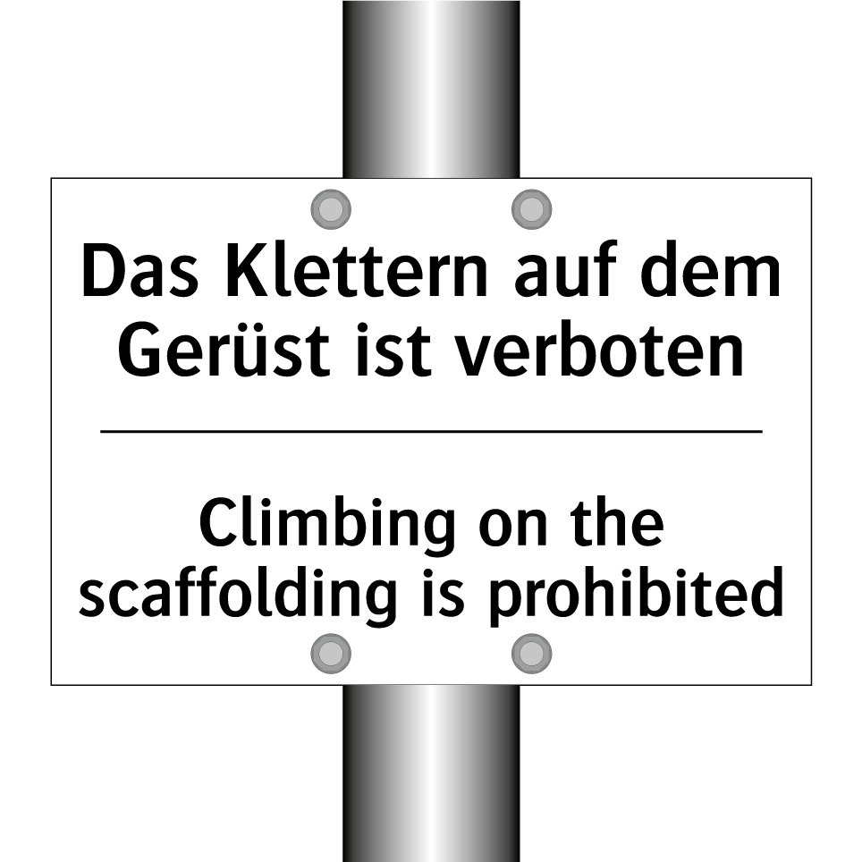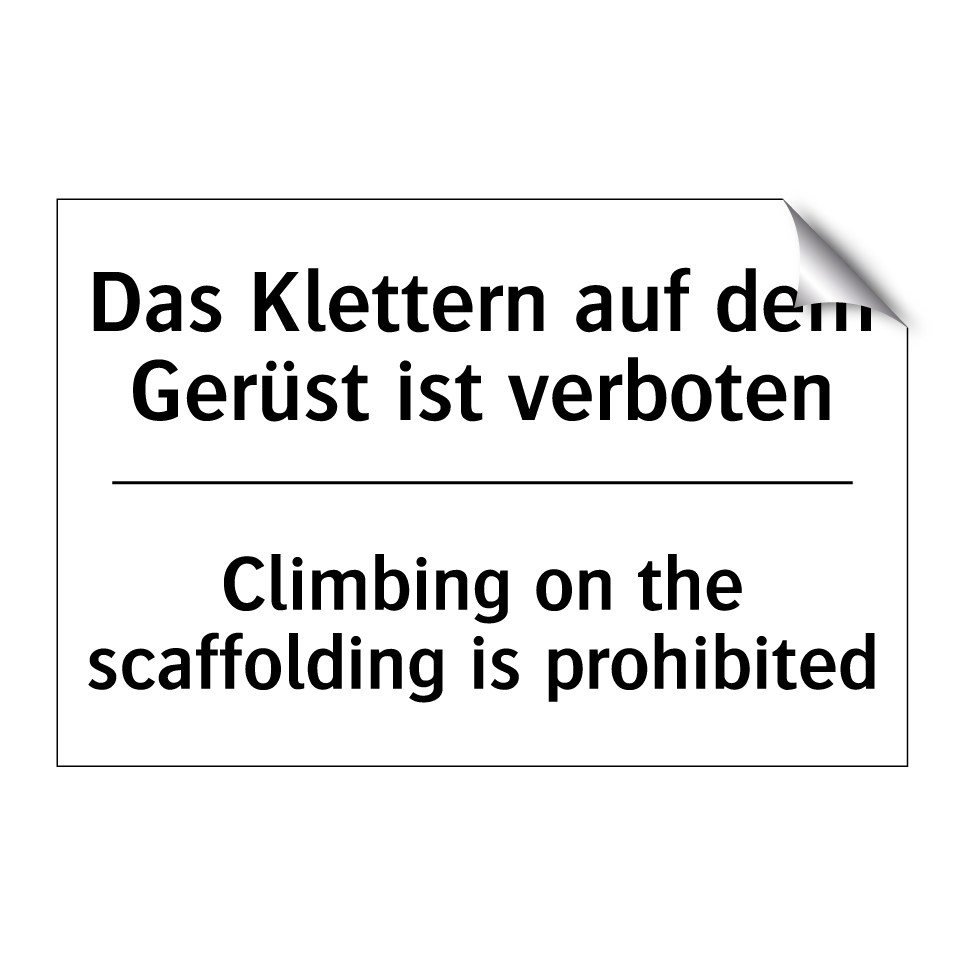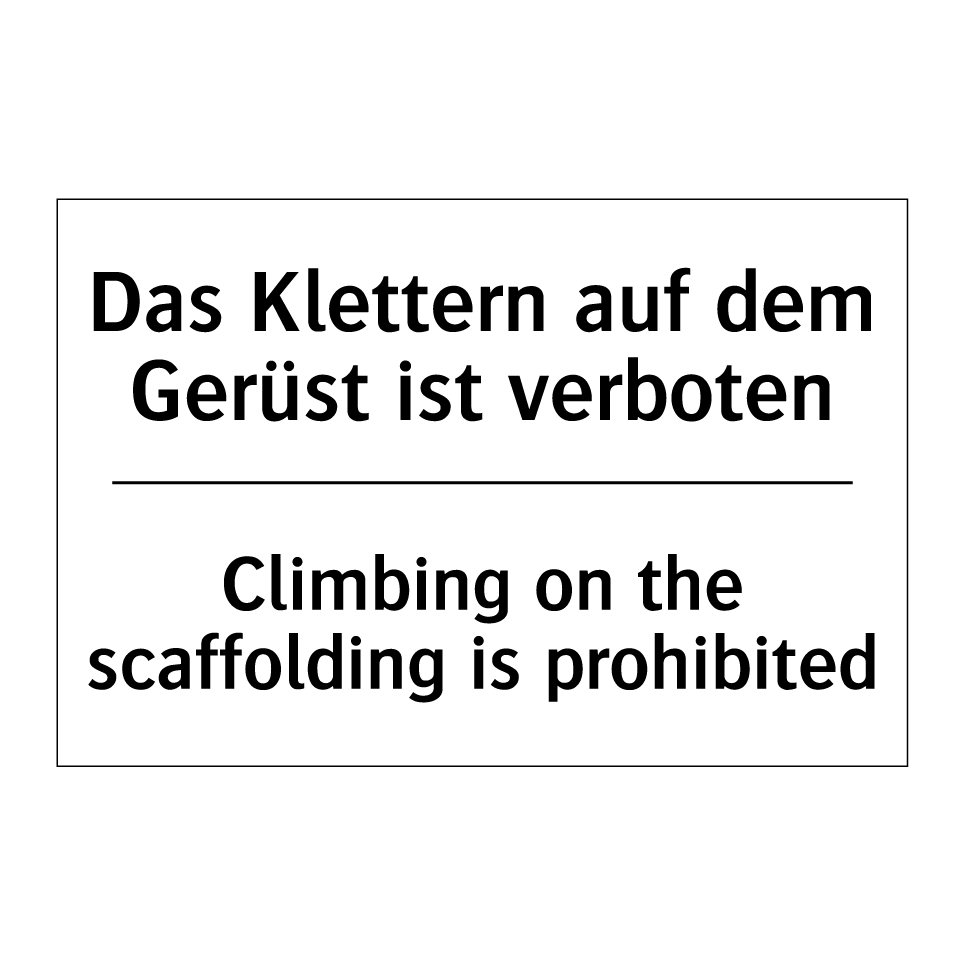 Zweisprachiges Verbotsschild mit deutschem Text Das Klettern auf dem Gerüst ist verboten und englischem Text Climbing on the scaffolding is prohibited