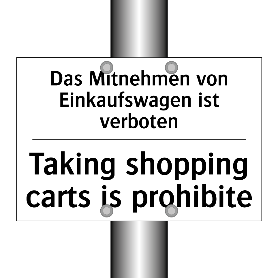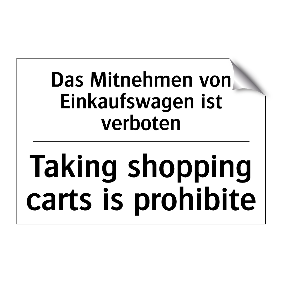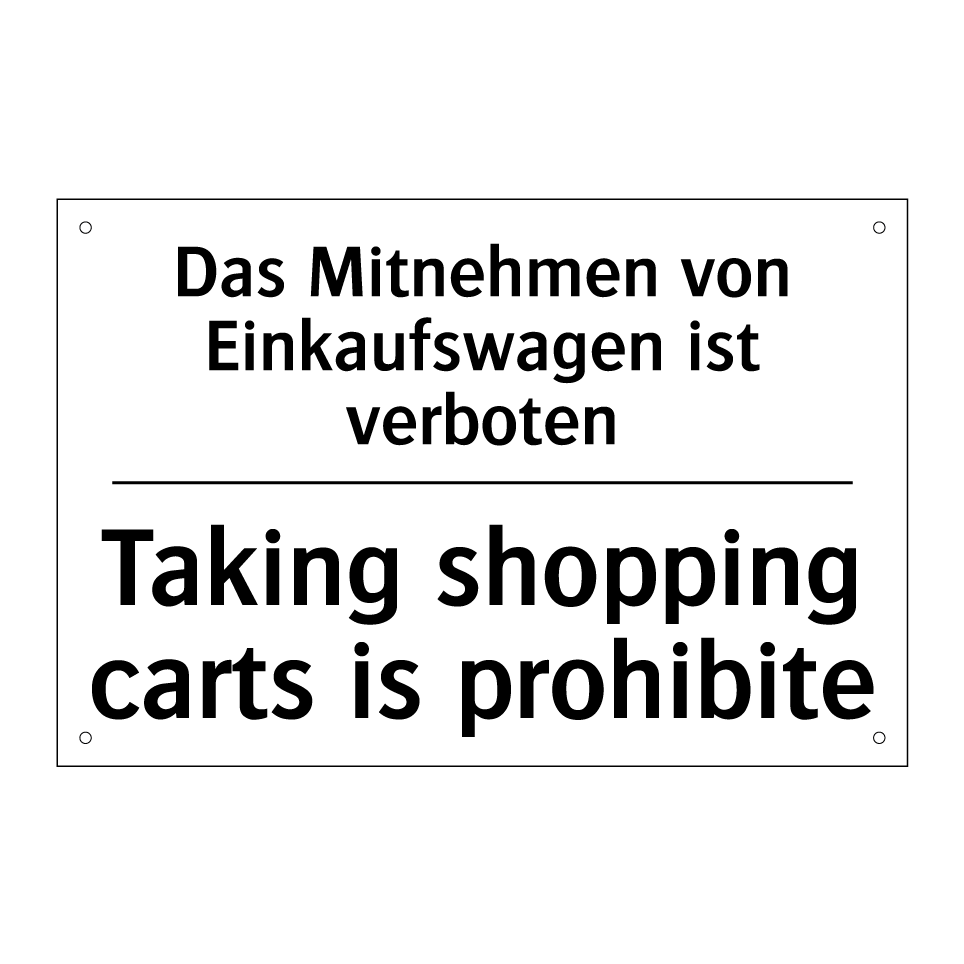 Zweisprachiges Verbotsschild mit deutschem Text Das Mitnehmen von Einkaufswagen ist verboten und englischem Text Taking shopping carts is prohibite