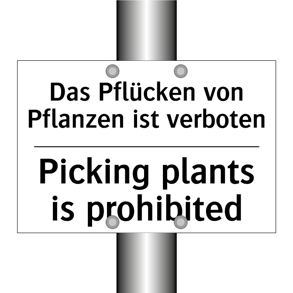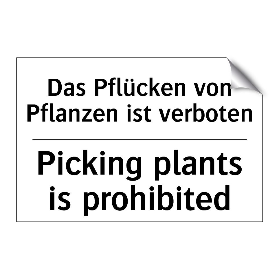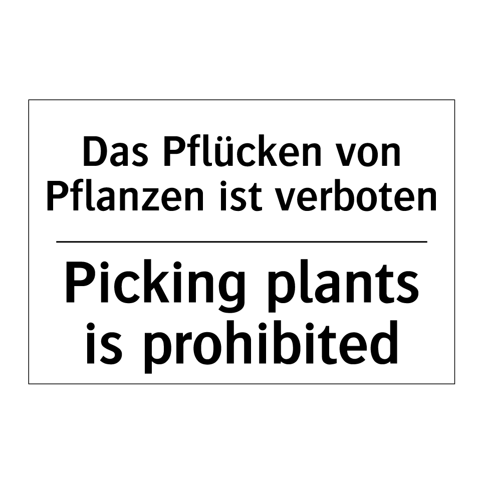 Zweisprachiges Verbotsschild mit deutschem Text Das Pflücken von Pflanzen ist verboten und englischem Text Picking plants is prohibited
