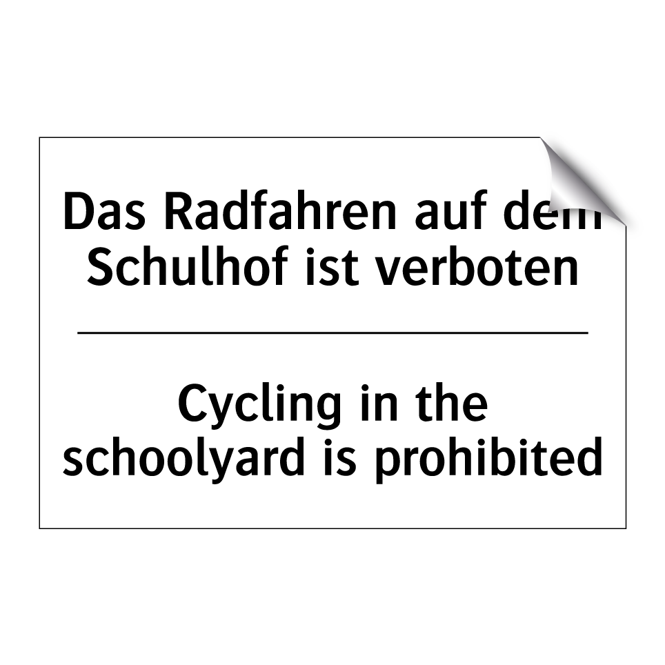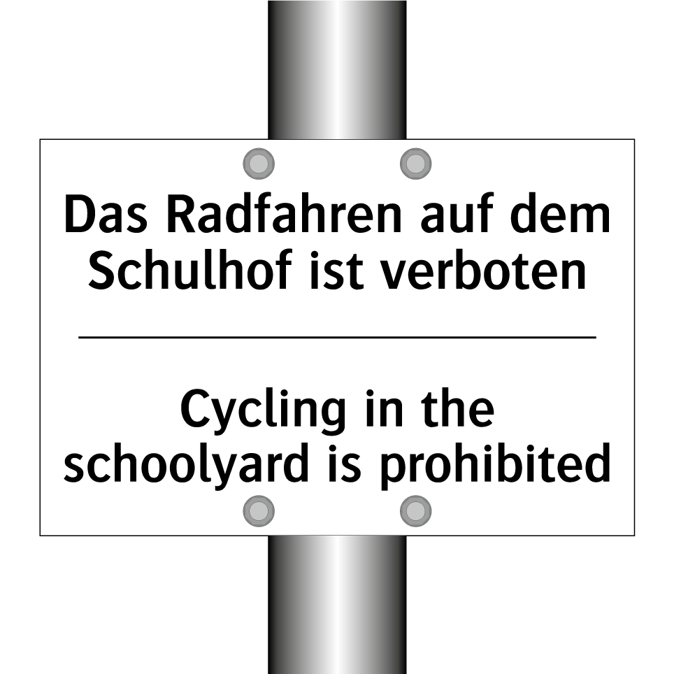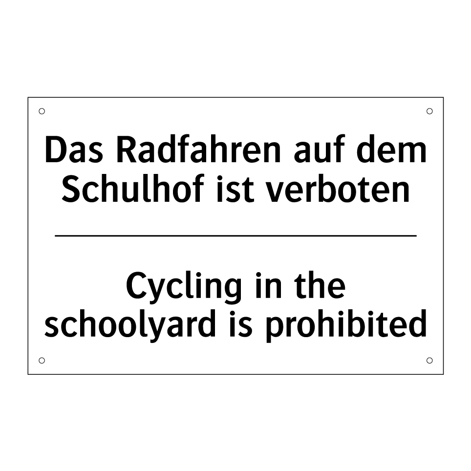 Zweisprachiges Verbotsschild mit deutschem Text Das Radfahren auf dem Schulhof ist verboten und englischem Text Cycling in the schoolyard is prohibited