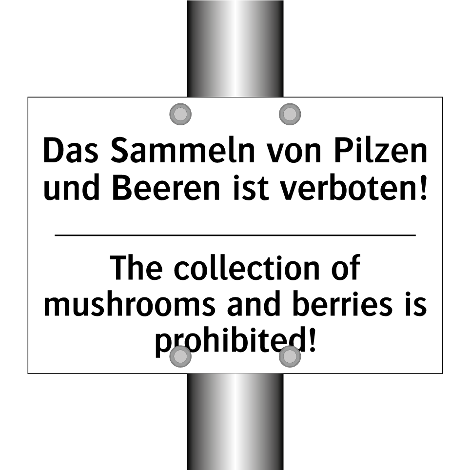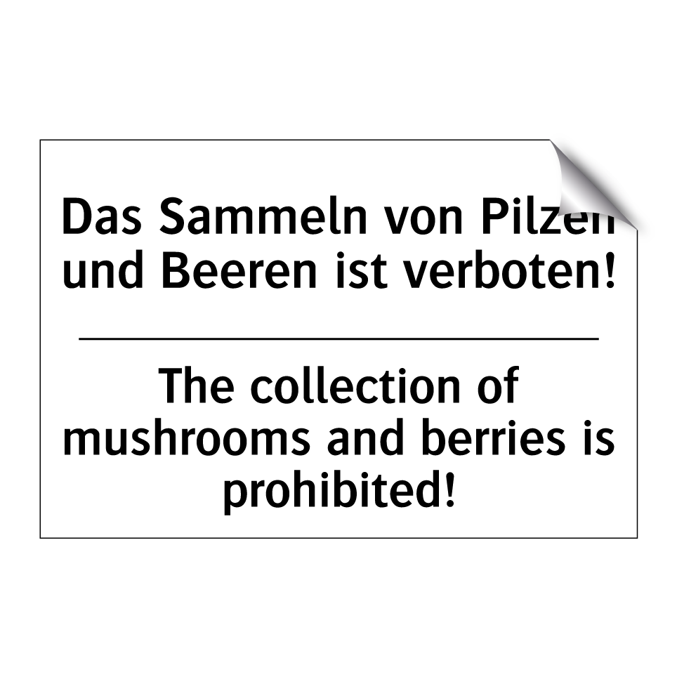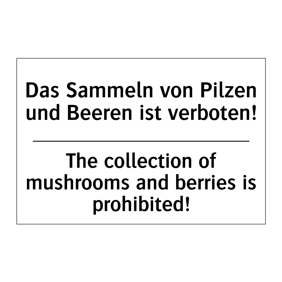 Zweisprachiges Verbotsschild mit deutschem Text Das Sammeln von Pilzen und Beeren ist verboten! und englischem Text The collection of mushrooms and berries is prohibited!