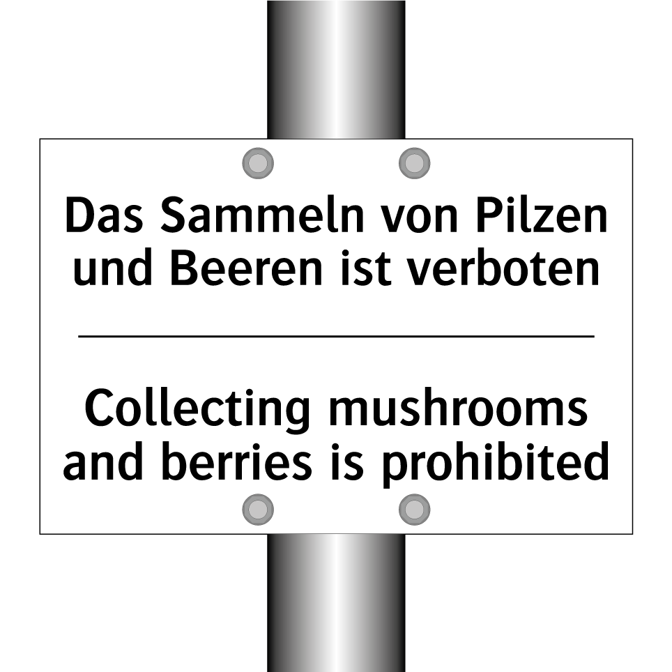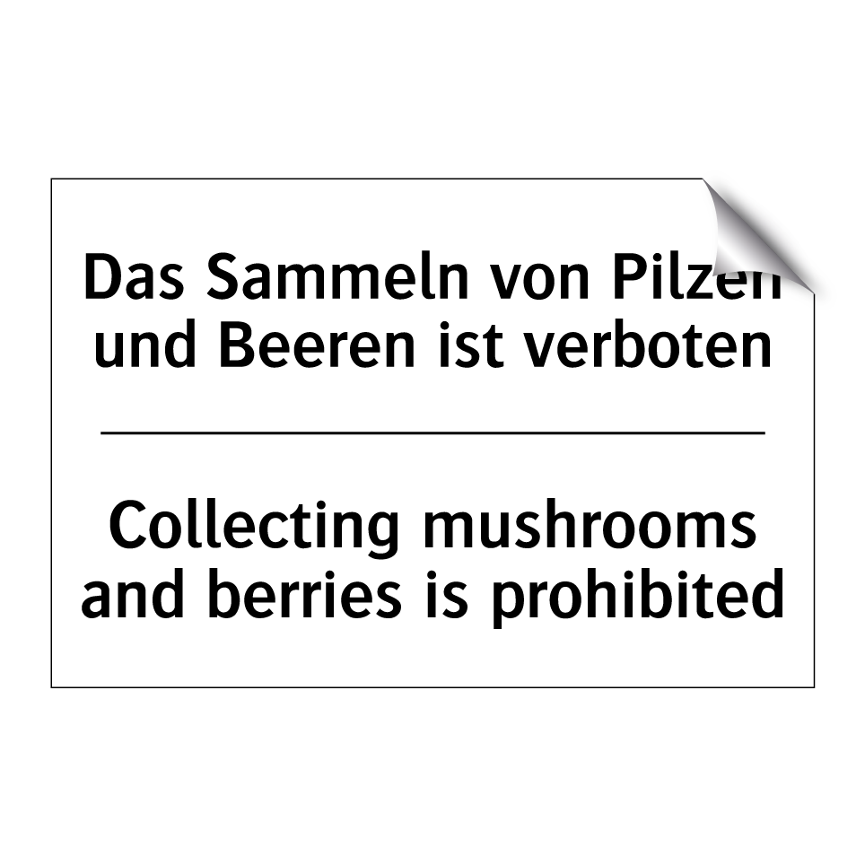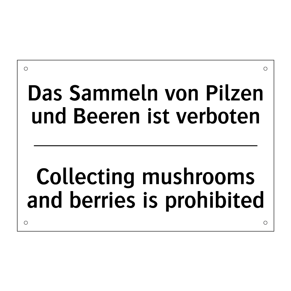 Zweisprachiges Verbotsschild mit deutschem Text Das Sammeln von Pilzen und Beeren ist verboten und englischem Text Collecting mushrooms and berries is prohibited