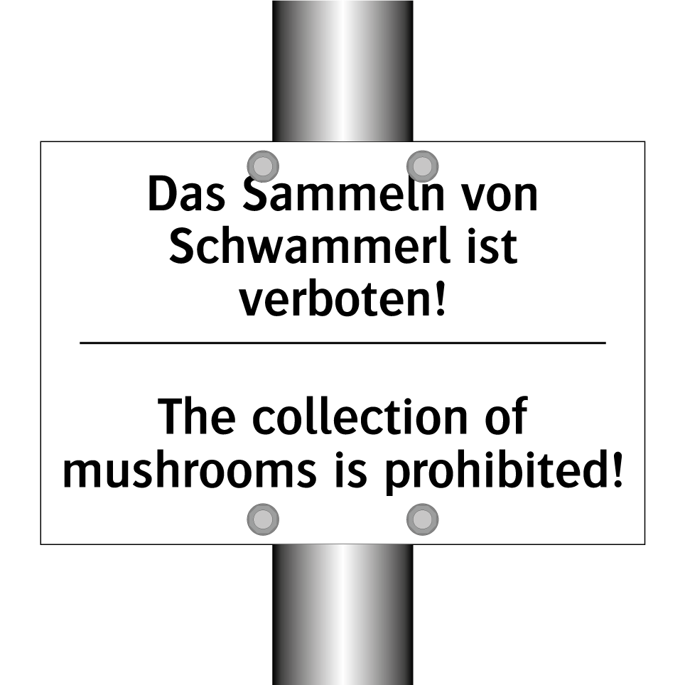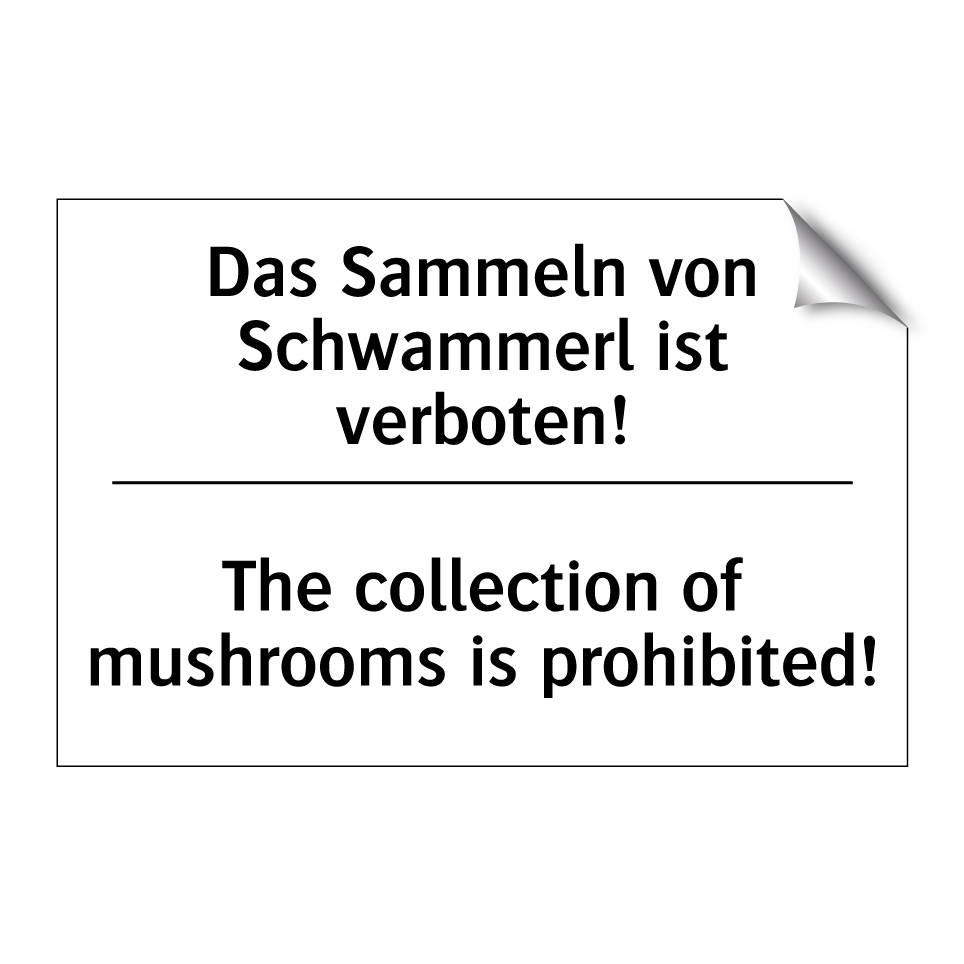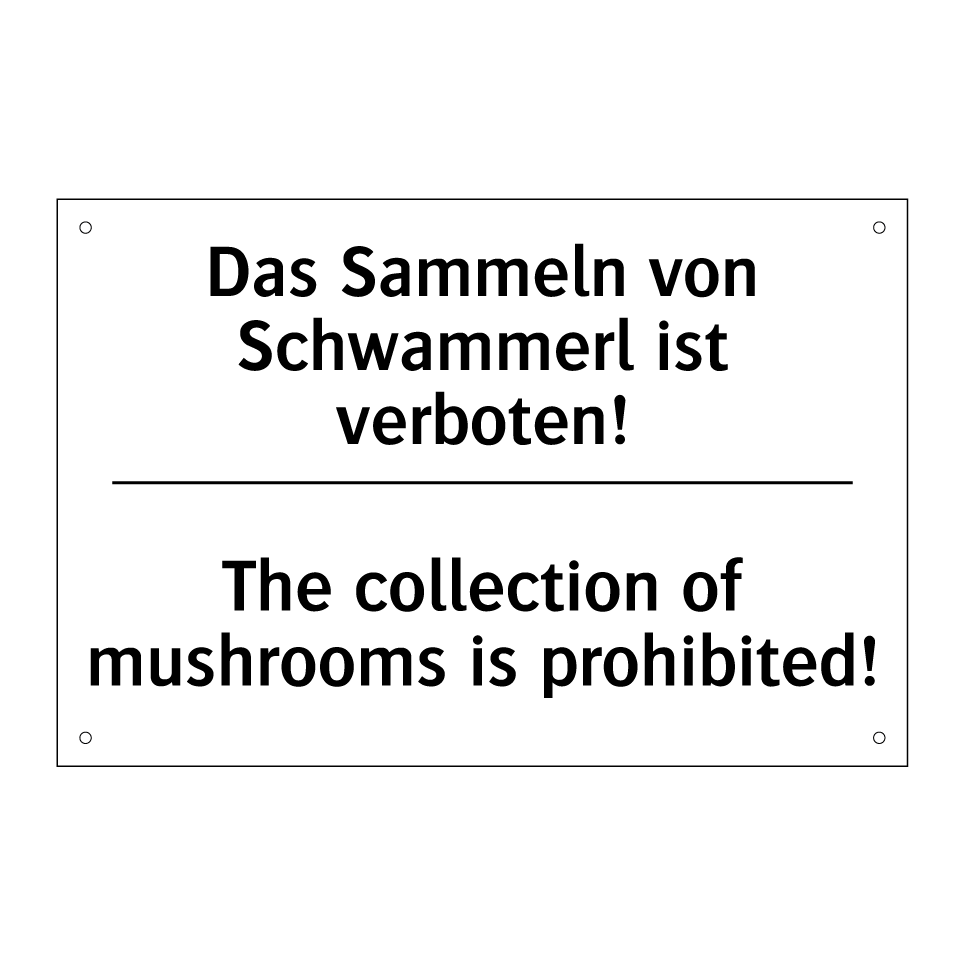 Zweisprachiges Verbotsschild mit deutschem Text Das Sammeln von Schwammerl ist verboten! und englischem Text The collection of mushrooms is prohibited!