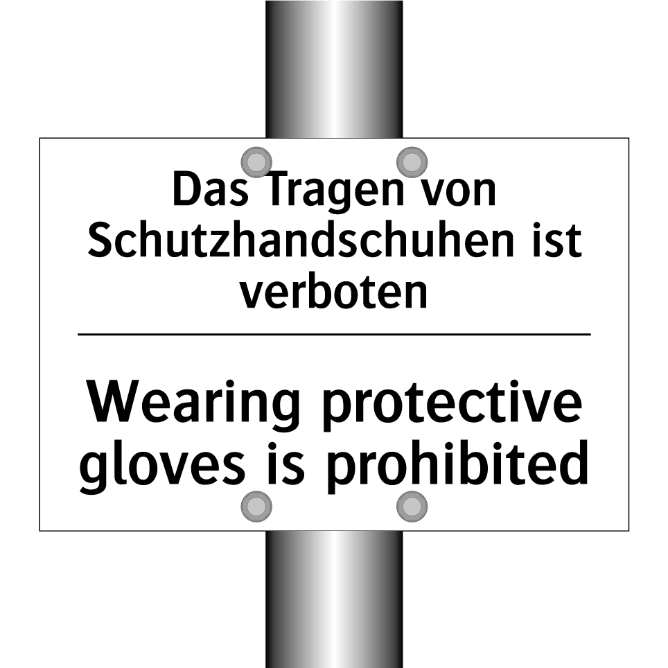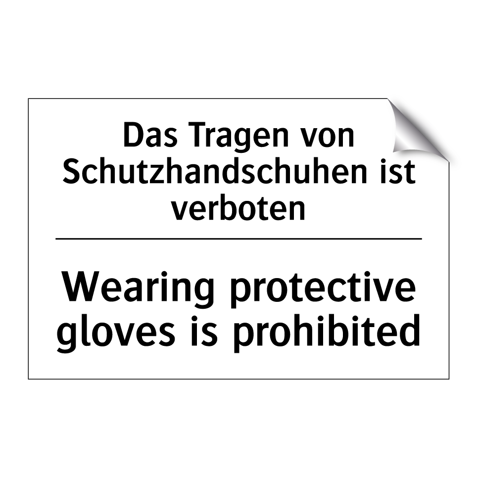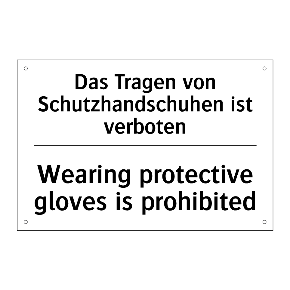 Zweisprachiges Verbotsschild mit deutschem Text Das Tragen von Schutzhandschuhen ist verboten und englischem Text Wearing protective gloves is prohibited