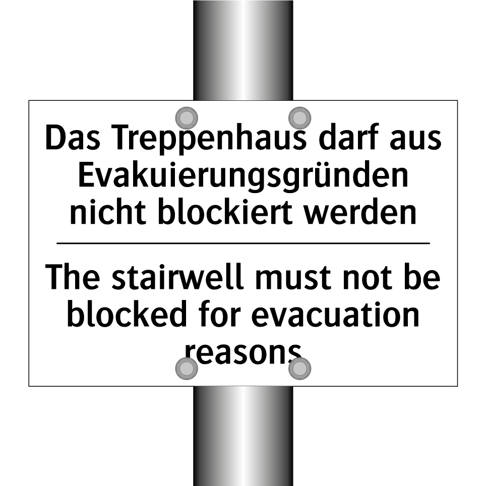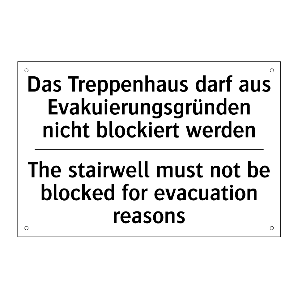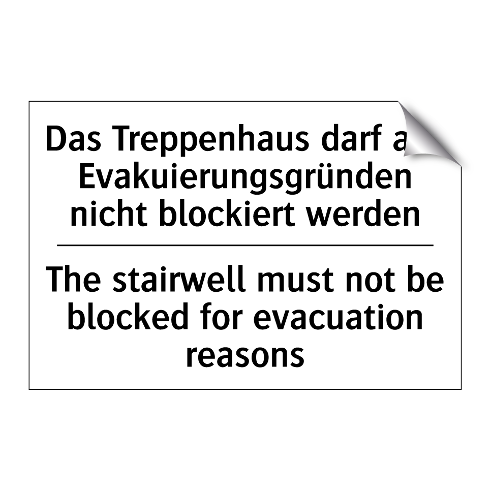Zweisprachiges Verbotsschild mit deutschem Text Das Treppenhaus darf aus Evakuierungsgründen nicht blockiert werden und englischem Text The stairwell must not be blocked for evacuation reasons