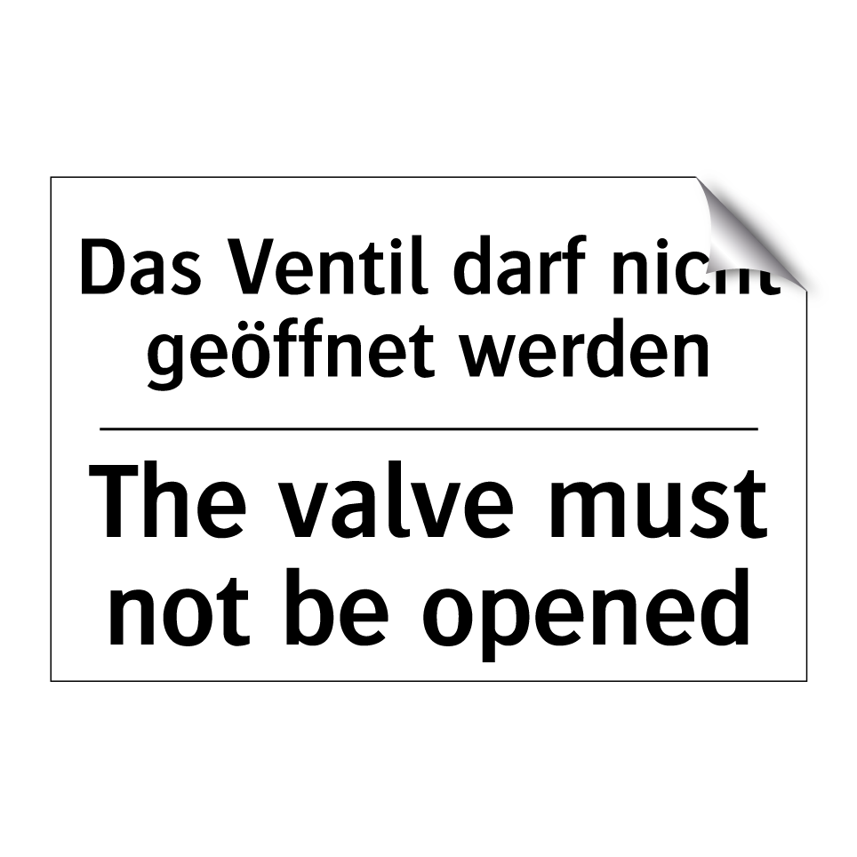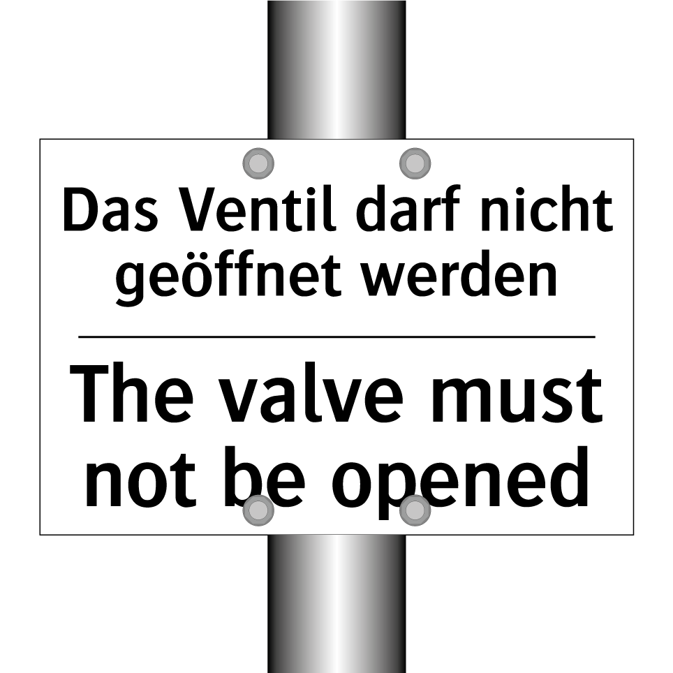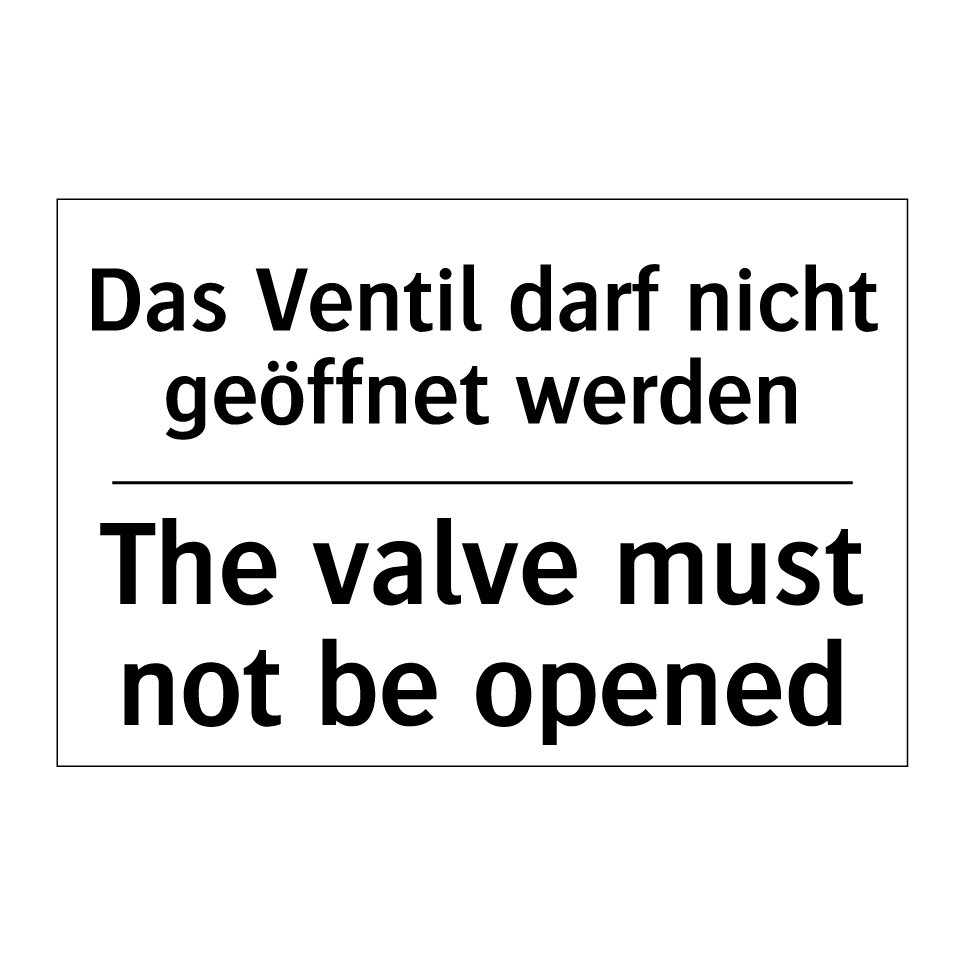 Zweisprachiges Verbotsschild mit deutschem Text Das Ventil darf nicht geöffnet werden und englischem Text The valve must not be opened