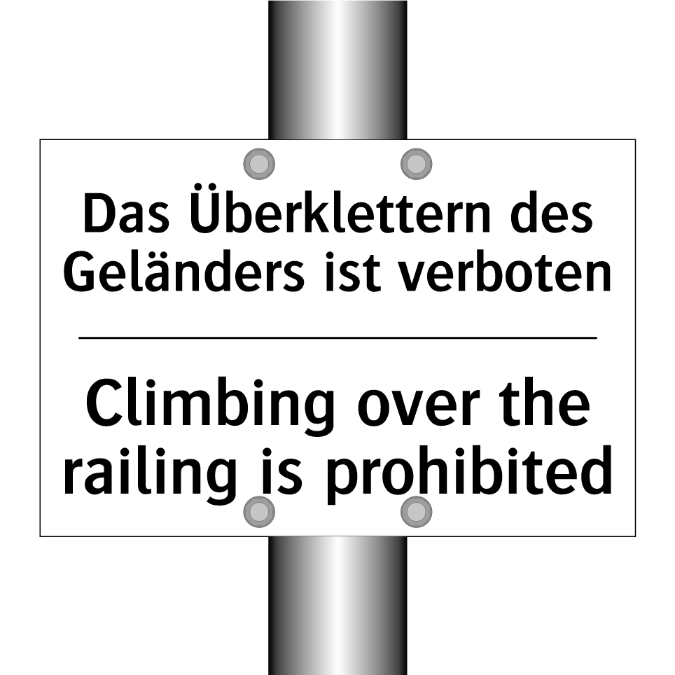 Zweisprachiges Verbotsschild mit deutschem Text Das Überklettern des Geländers ist verboten und englischem Text Climbing over the railing is prohibited