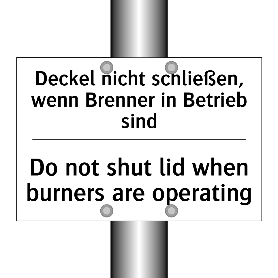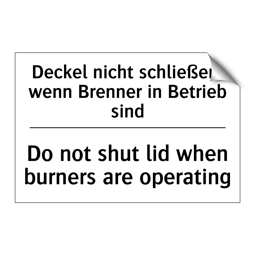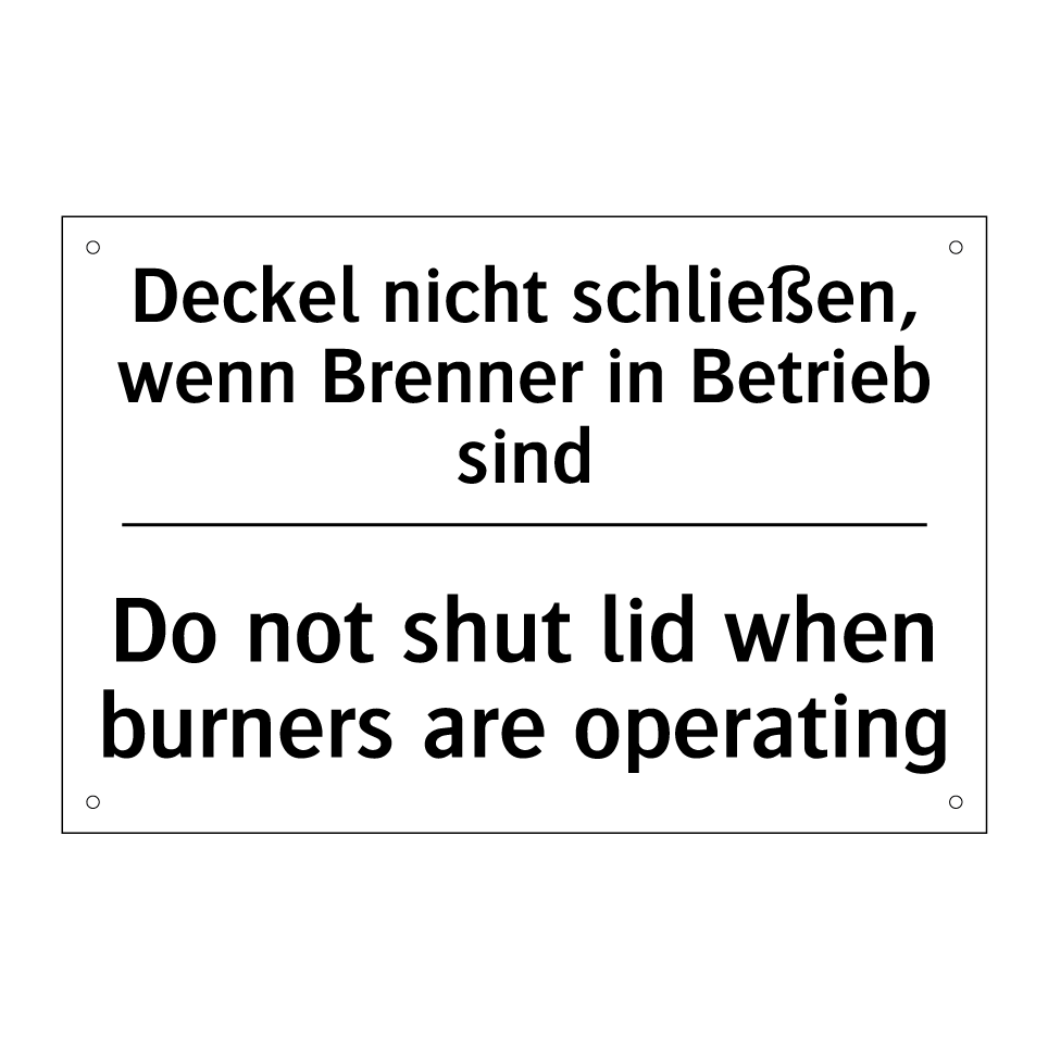 Zweisprachiges Verbotsschild mit deutschem Text Deckel nicht schließen, wenn Brenner in Betrieb sind und englischem Text Do not shut lid when burners are operating