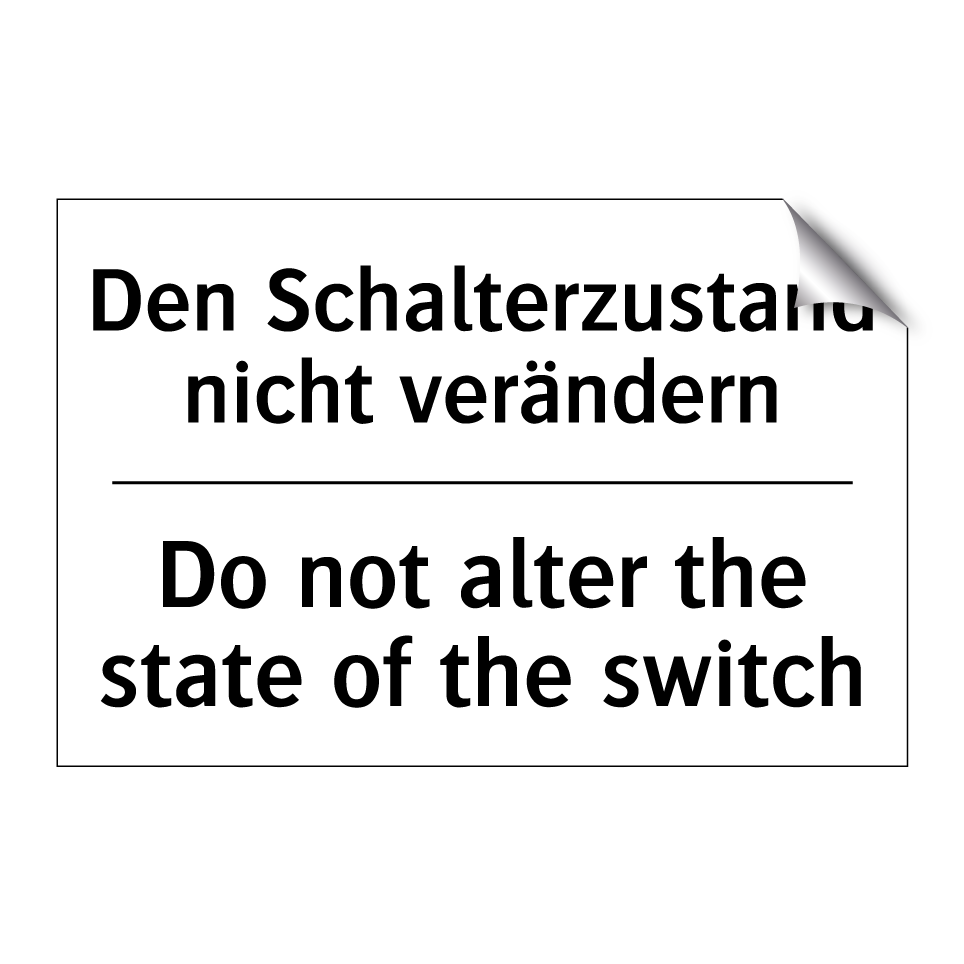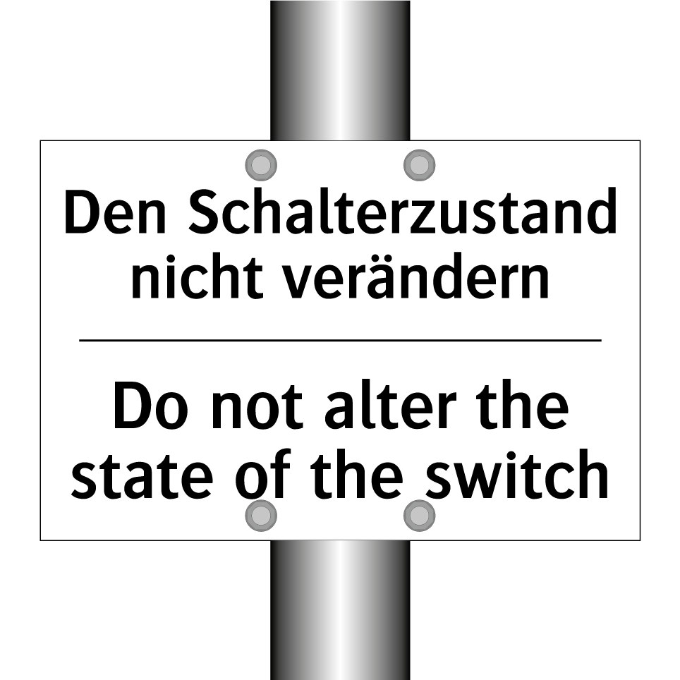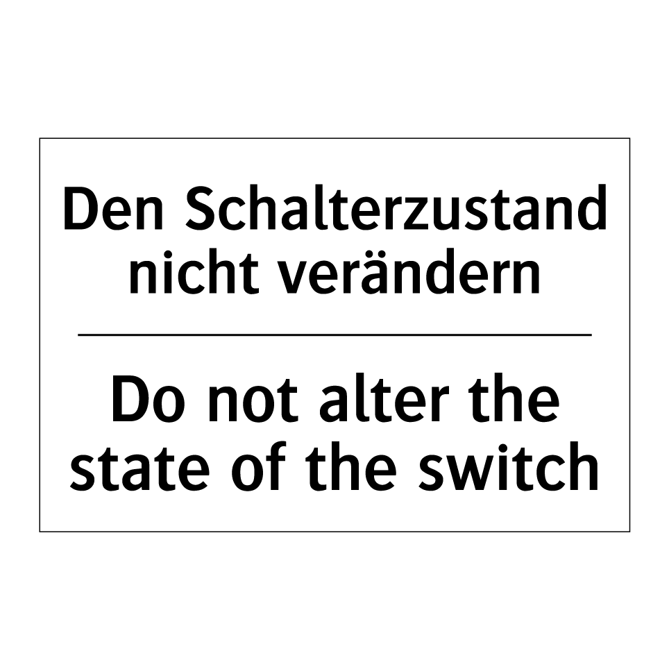 Zweisprachiges Verbotsschild mit deutschem Text Den Schalterzustand nicht verändern und englischem Text Do not alter the state of the switch