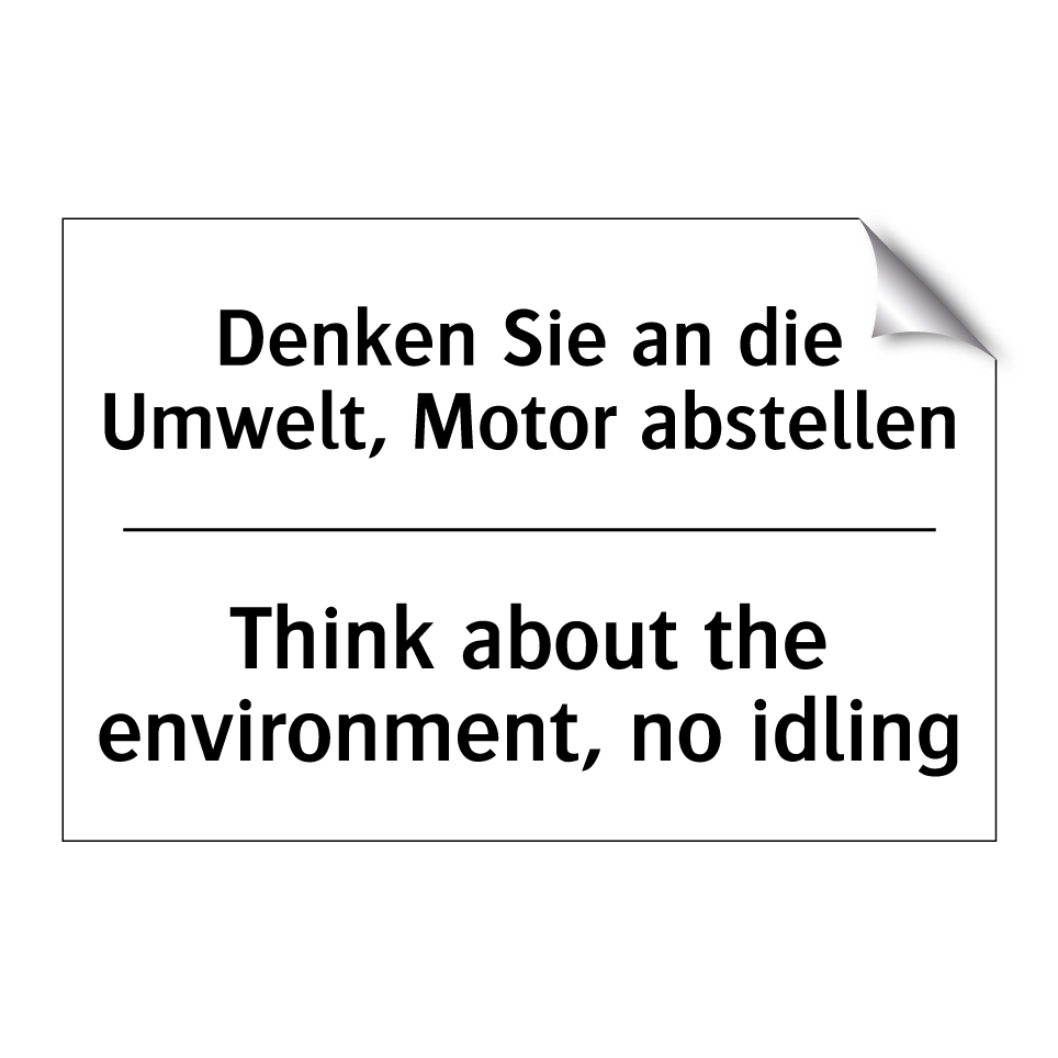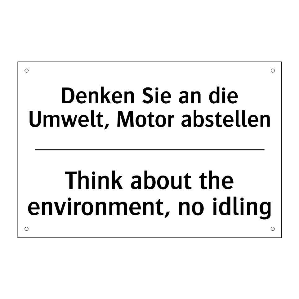 Zweisprachiges Verbotsschild mit deutschem Text Denken Sie an die Umwelt, Motor abstellen und englischem Text Think about the environment, no idling