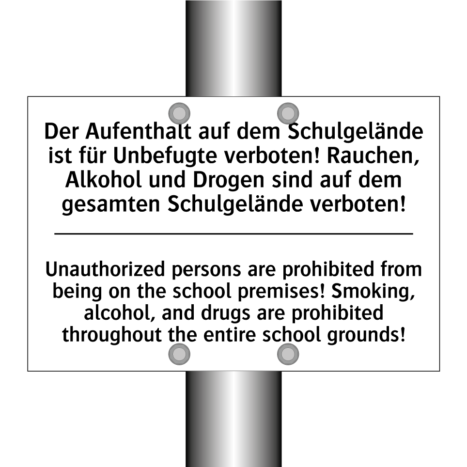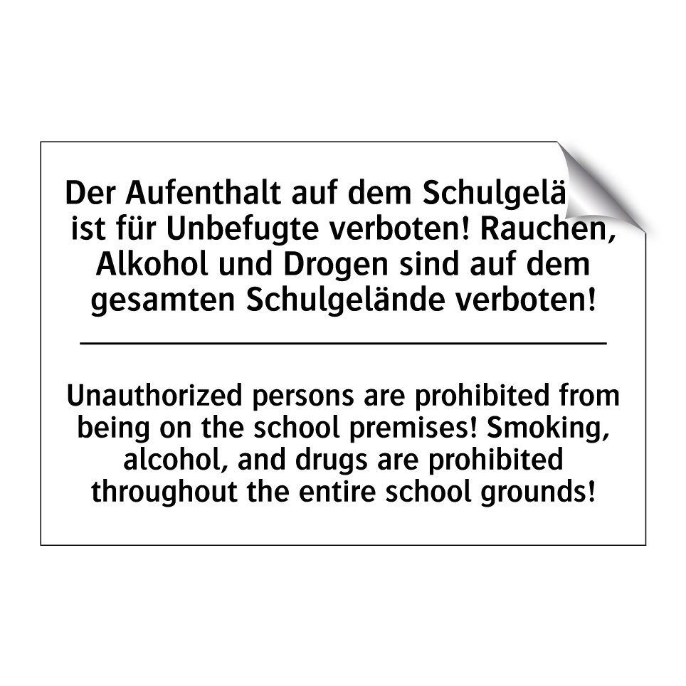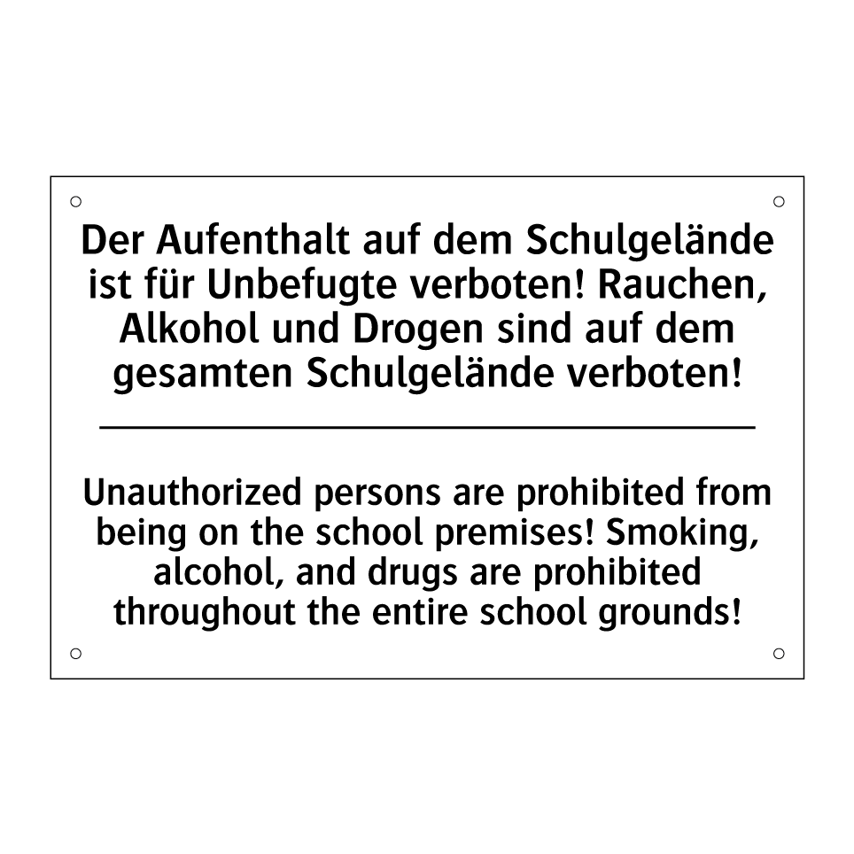 Zweisprachiges Verbotsschild mit deutschem Text Der Aufenthalt auf dem Schulgelände ist für Unbefugte verboten! Rauchen, Alkohol und Drogen sind auf dem gesamten Schulgelände verboten! und englischem Text Unauthorized persons are prohibited from being on the school premises! Smoking, alcohol, and drugs are prohibited throughout the entire school grounds!