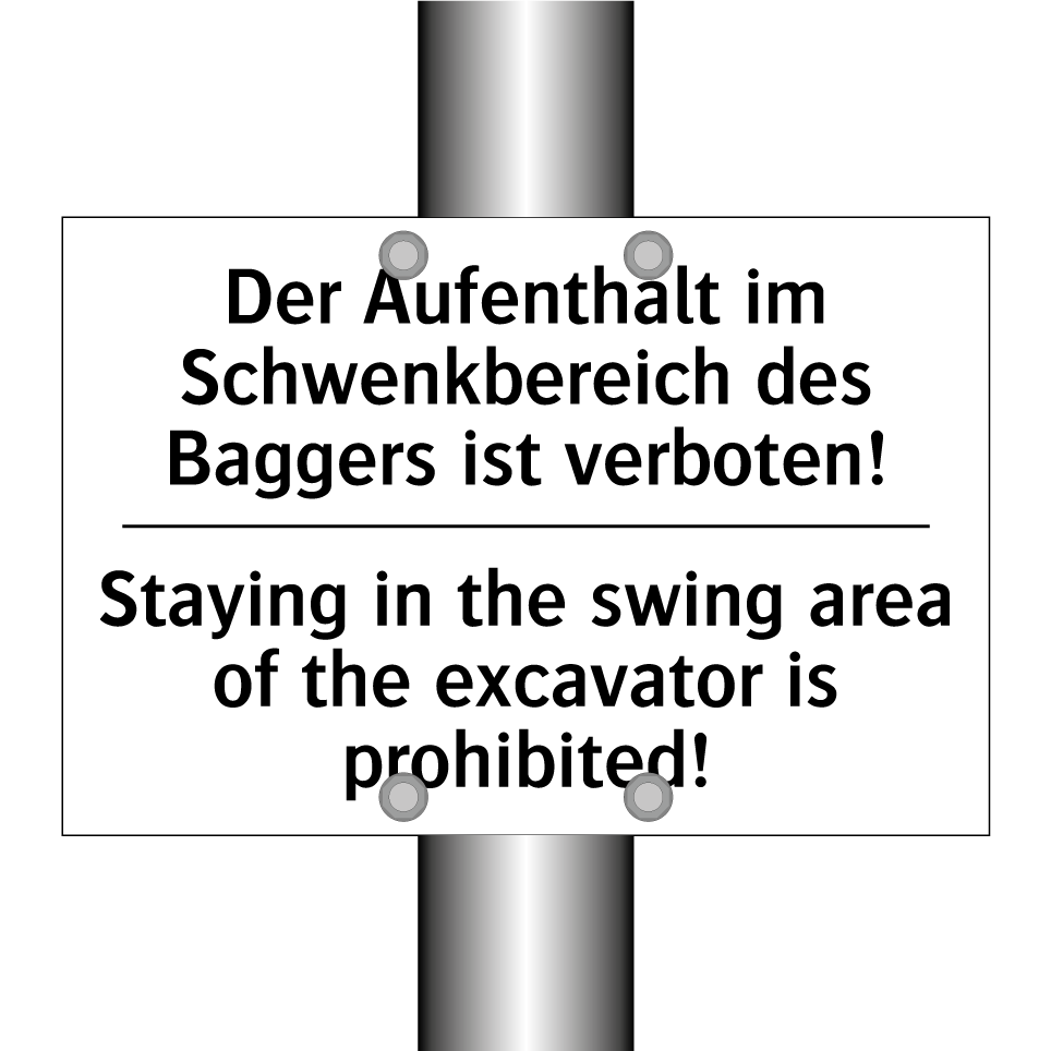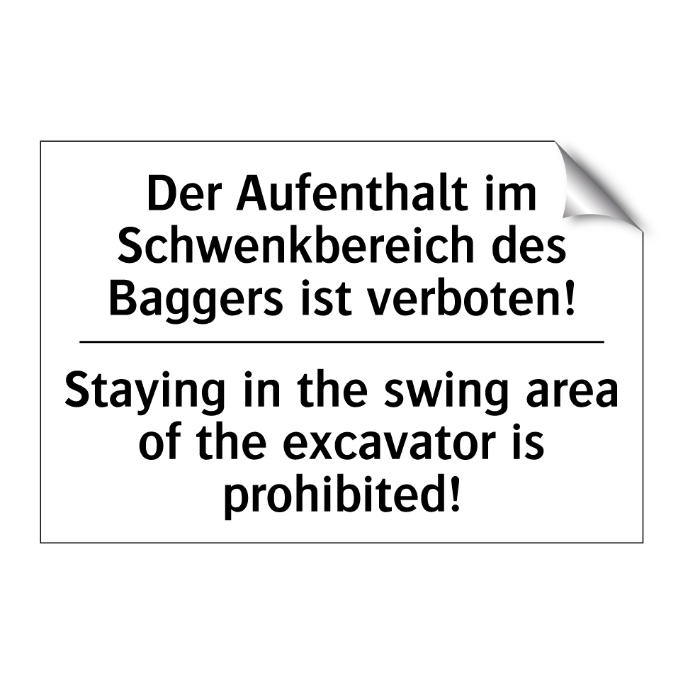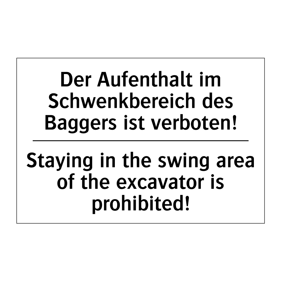 Zweisprachiges Verbotsschild mit deutschem Text Der Aufenthalt im Schwenkbereich des Baggers ist verboten! und englischem Text Staying in the swing area of the excavator is prohibited!