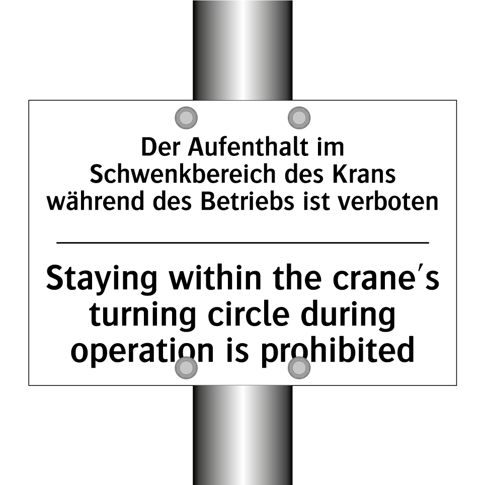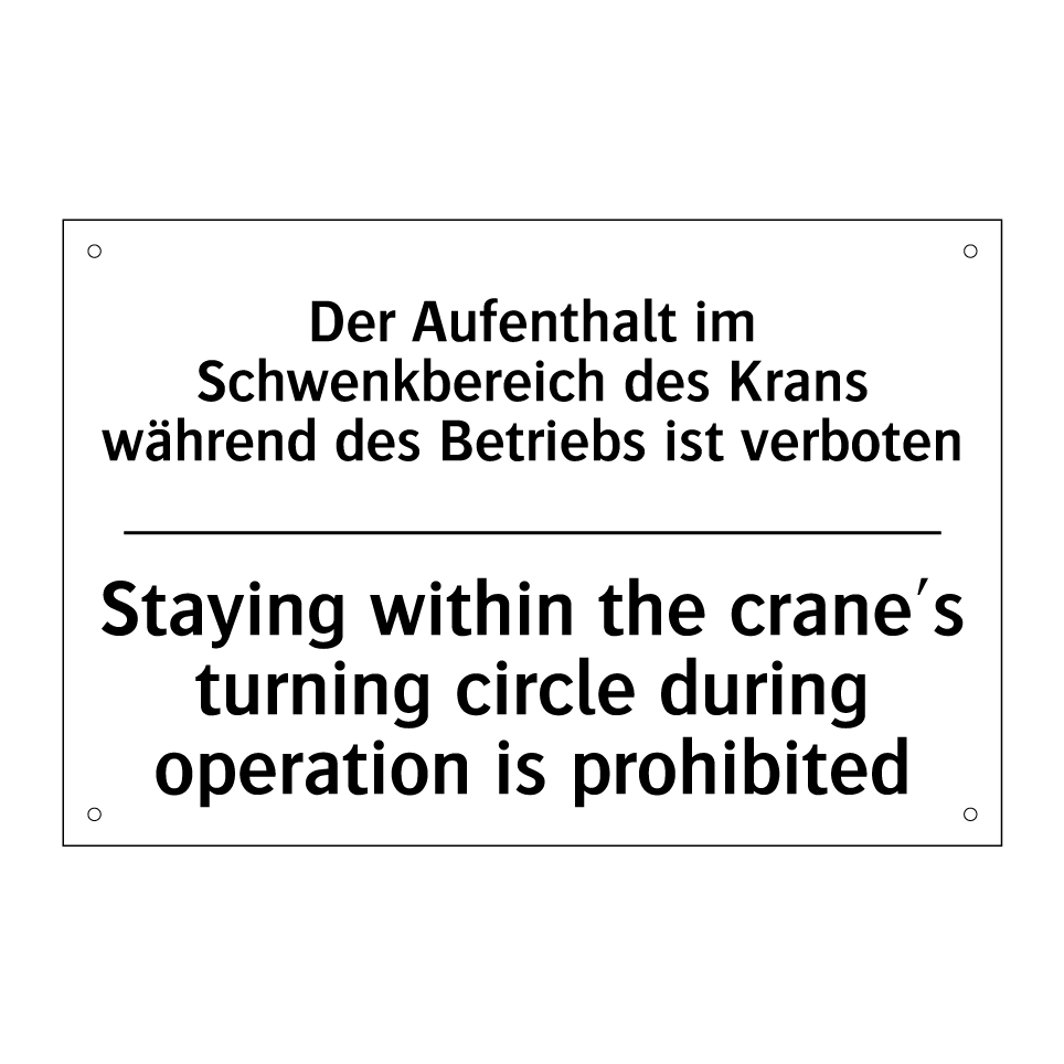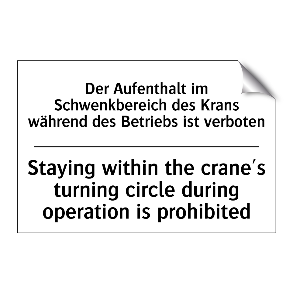 Zweisprachiges Verbotsschild mit deutschem Text Der Aufenthalt im Schwenkbereich des Krans während des Betriebs ist verboten und englischem Text Staying within the crane's turning circle during operation is prohibited