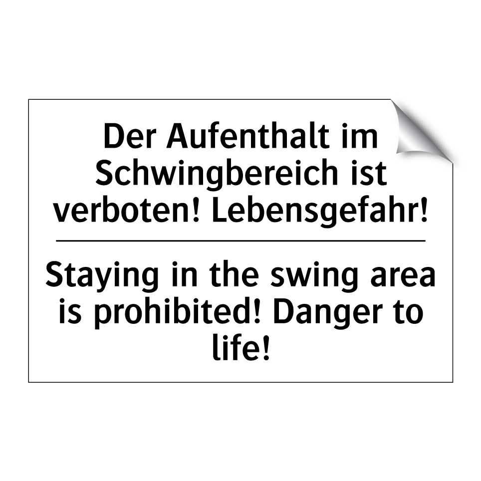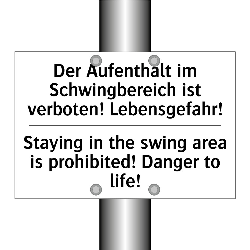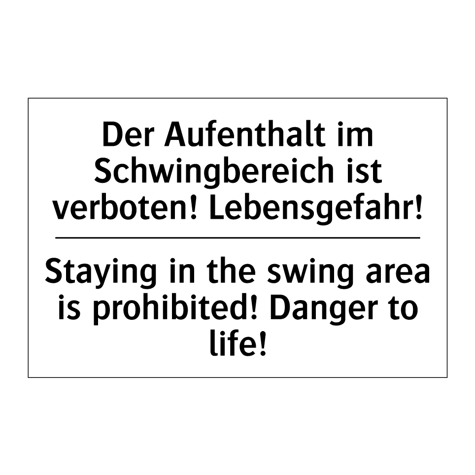 Zweisprachiges Verbotsschild mit deutschem Text Der Aufenthalt im Schwingbereich ist verboten! Lebensgefahr! und englischem Text Staying in the swing area is prohibited! Danger to life!