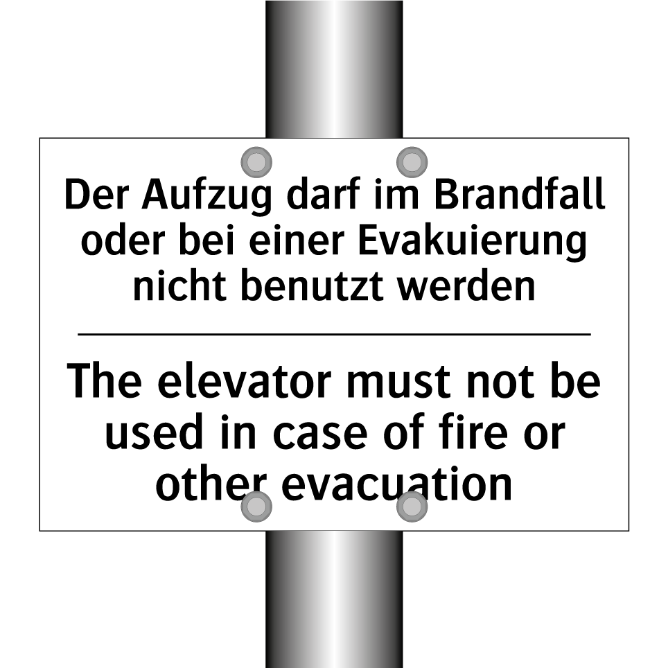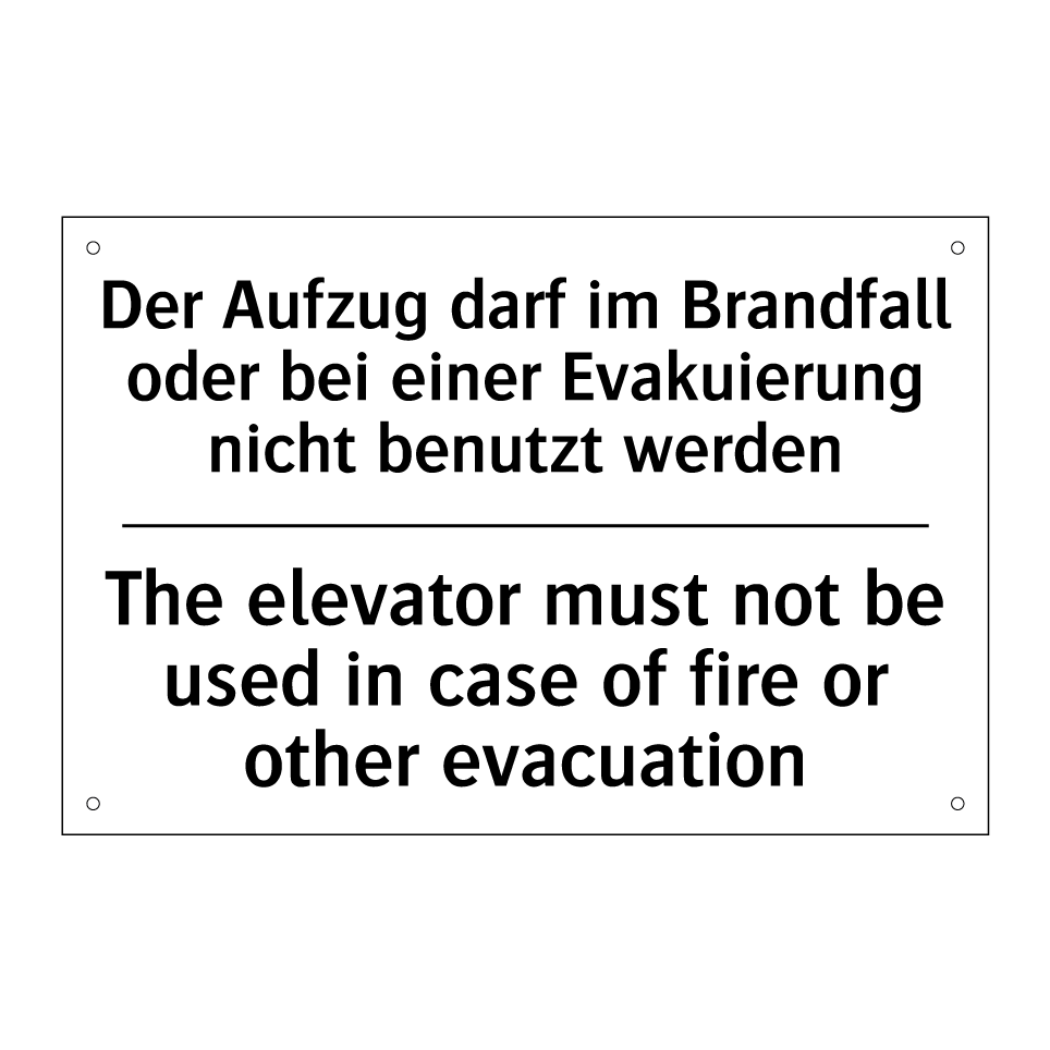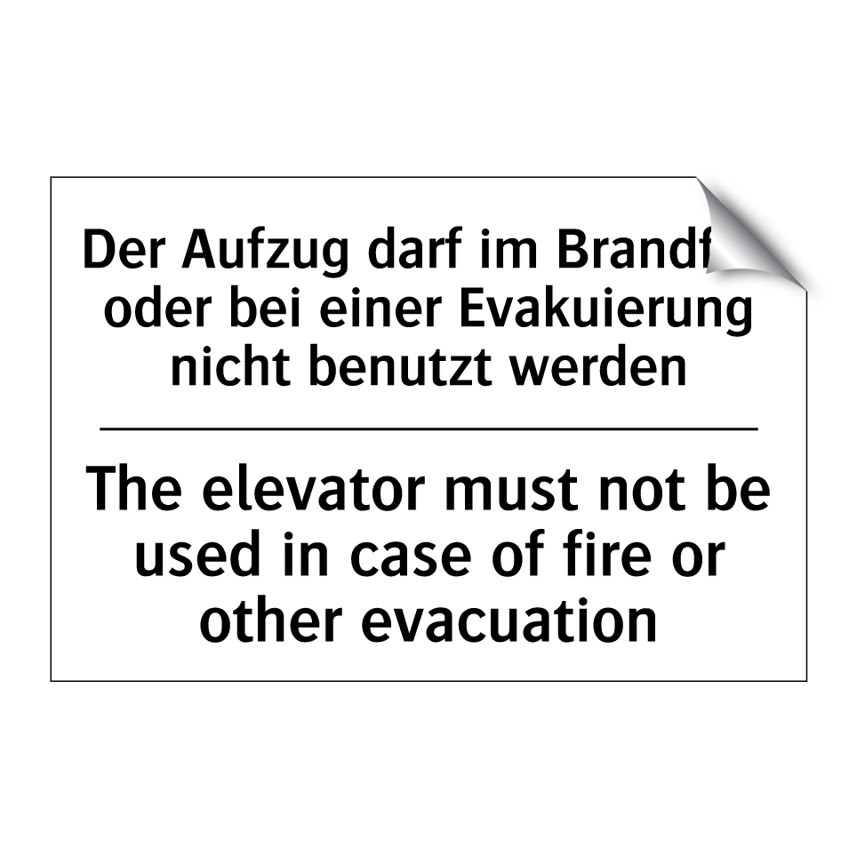 Zweisprachiges Verbotsschild mit deutschem Text Der Aufzug darf im Brandfall oder bei einer Evakuierung nicht benutzt werden und englischem Text The elevator must not be used in case of fire or other evacuation