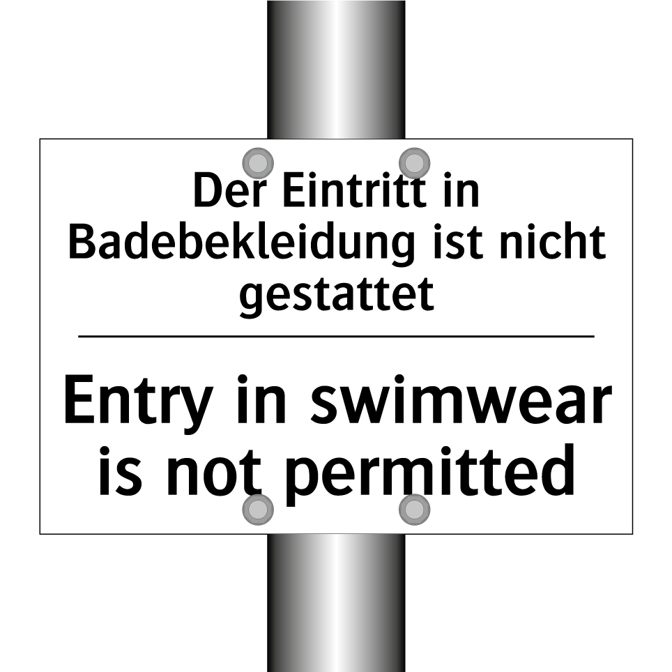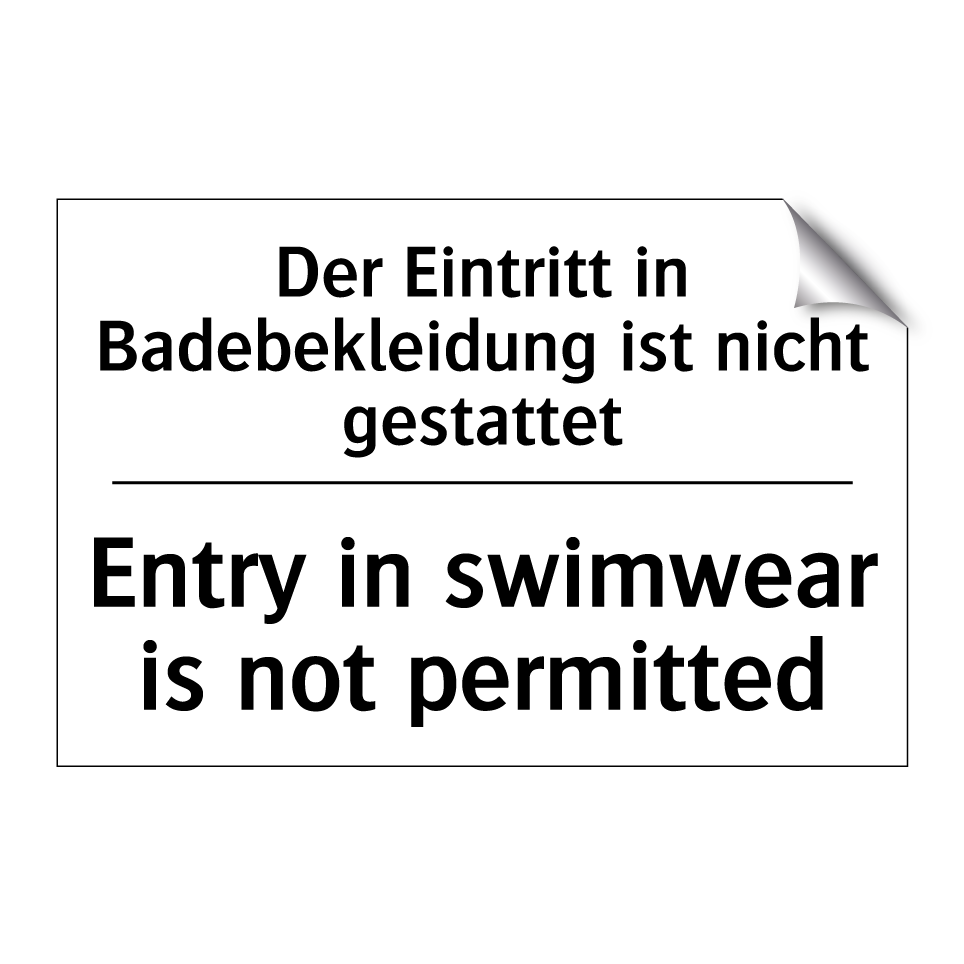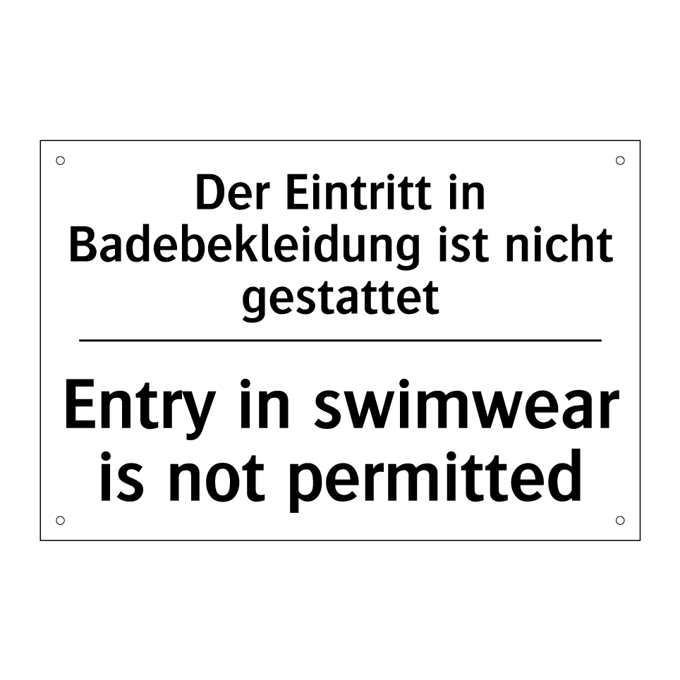 Zweisprachiges Verbotsschild mit deutschem Text Der Eintritt in Badebekleidung ist nicht gestattet und englischem Text Entry in swimwear is not permitted