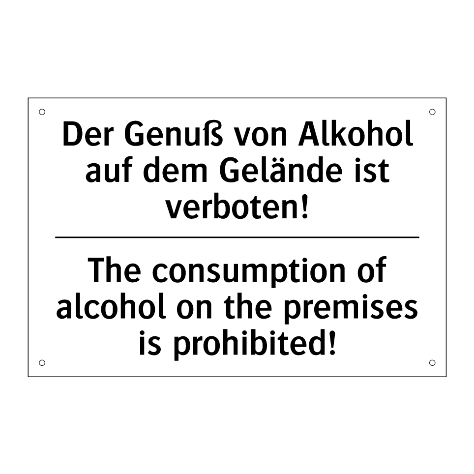 Zweisprachiges Verbotsschild mit deutschem Text Der Genuß von Alkohol auf dem Gelände ist verboten! und englischem Text The consumption of alcohol on the premises is prohibited!