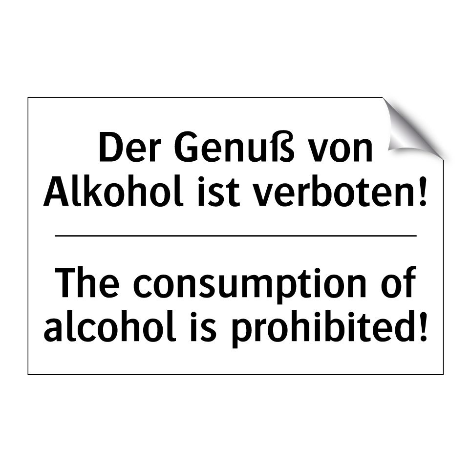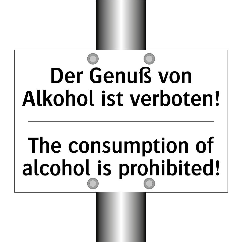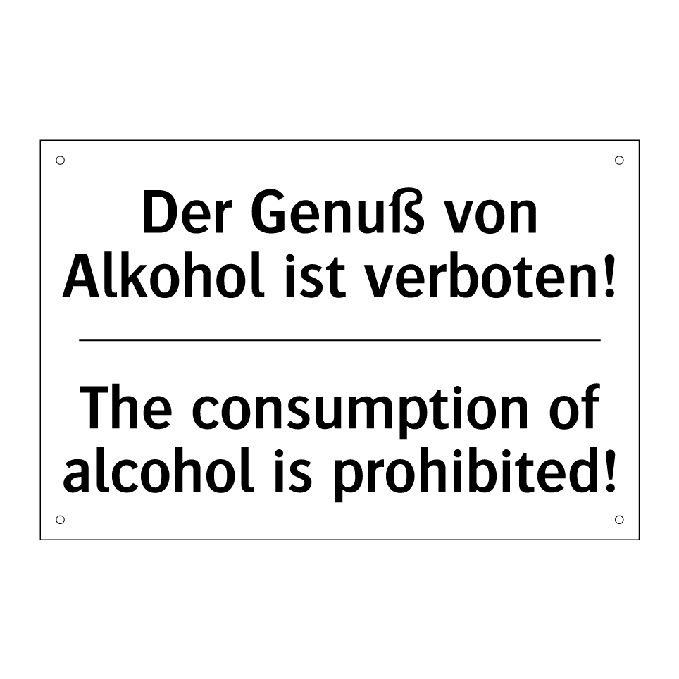Zweisprachiges Verbotsschild mit deutschem Text Der Genuß von Alkohol ist verboten! und englischem Text The consumption of alcohol is prohibited!