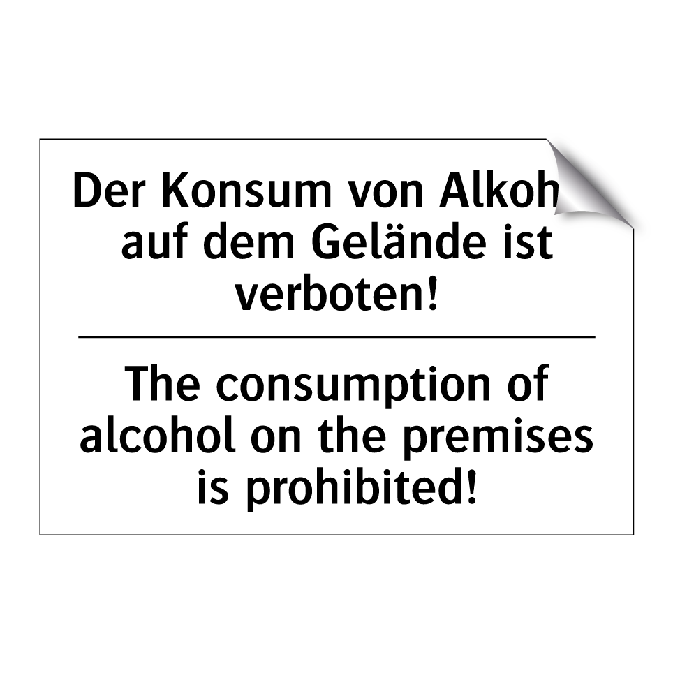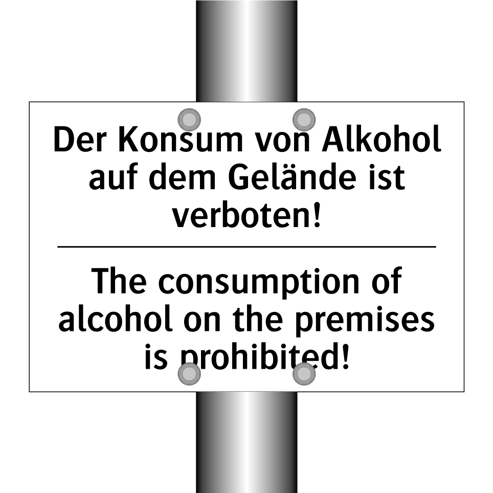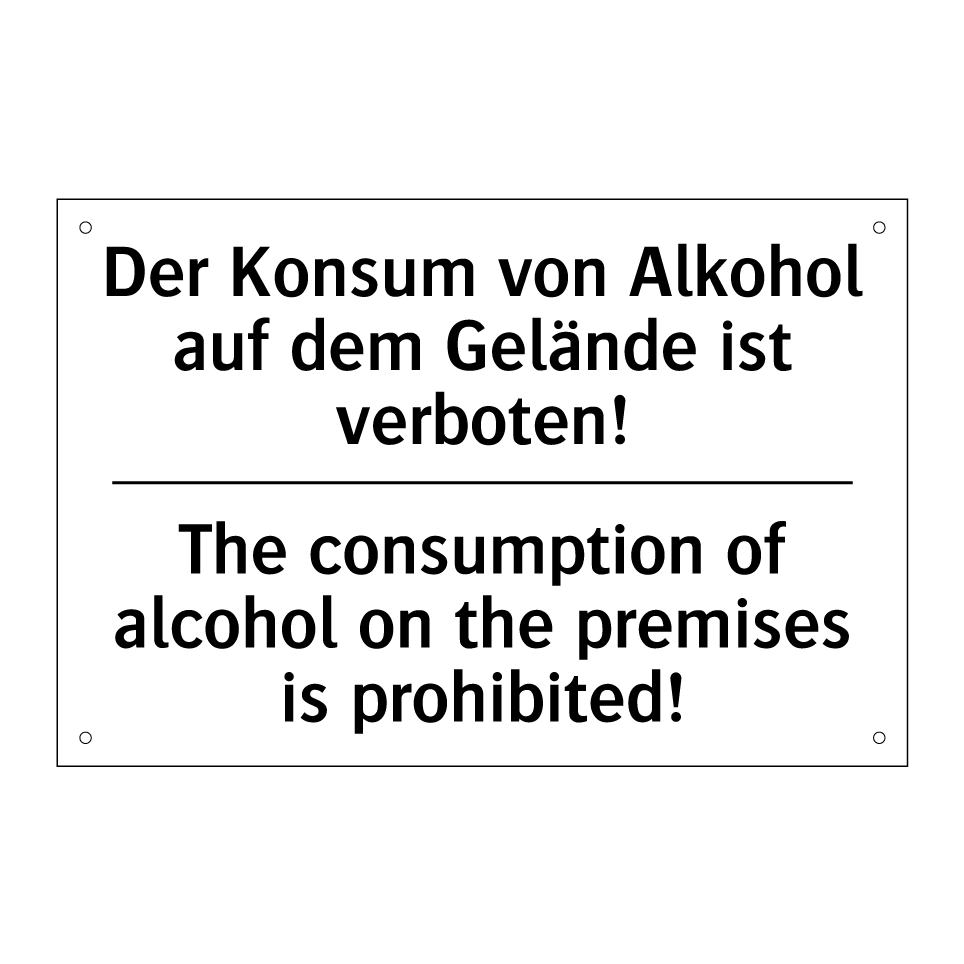 Zweisprachiges Verbotsschild mit deutschem Text Der Konsum von Alkohol auf dem Gelände ist verboten! und englischem Text The consumption of alcohol on the premises is prohibited!