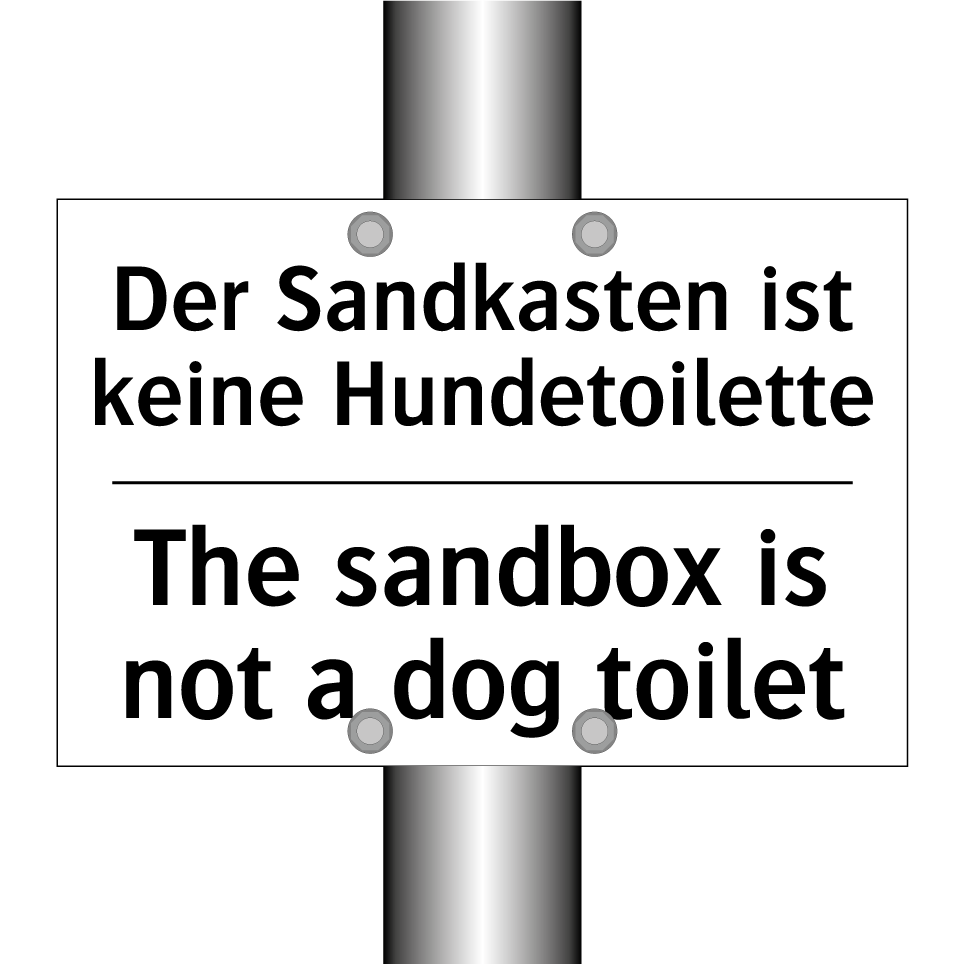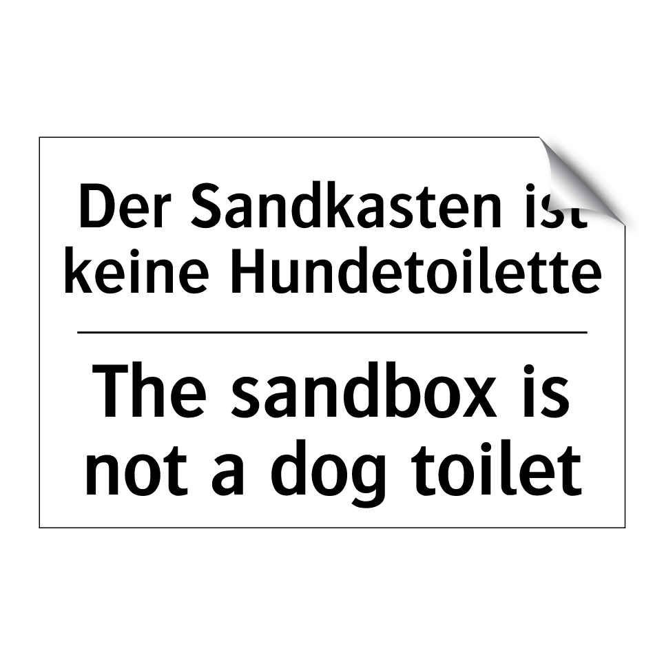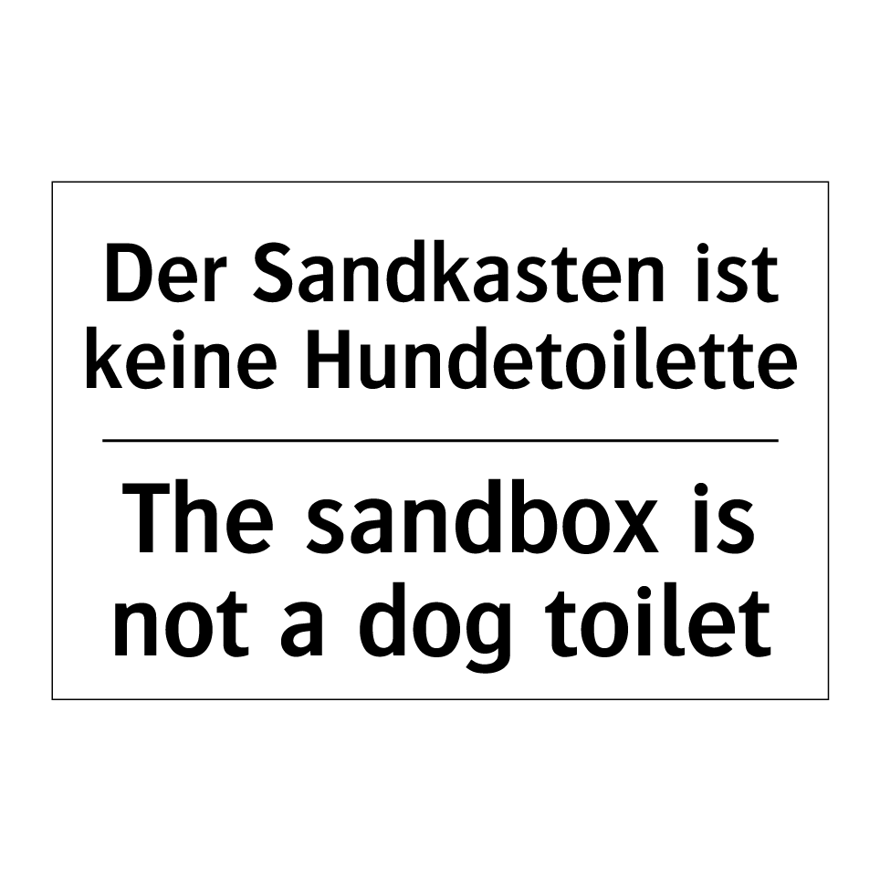 Zweisprachiges Verbotsschild mit deutschem Text Der Sandkasten ist keine Hundetoilette und englischem Text The sandbox is not a dog toilet
