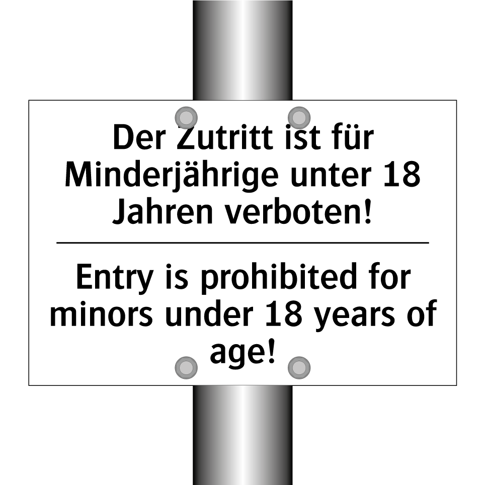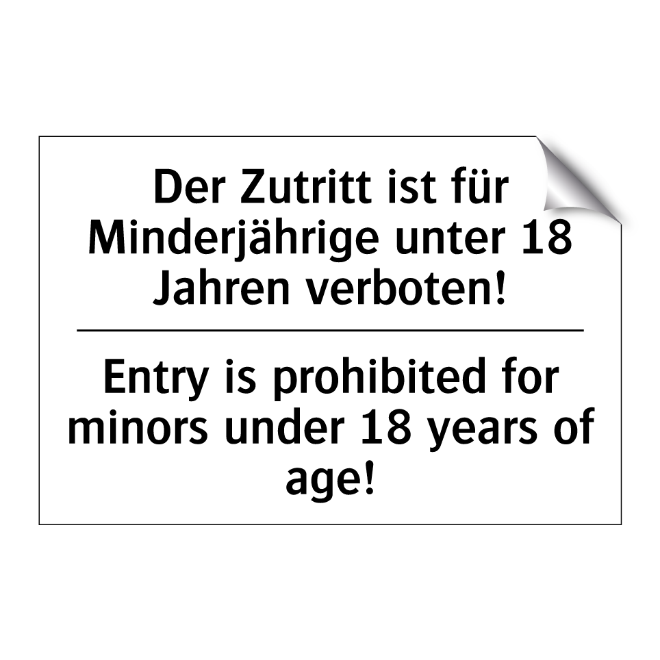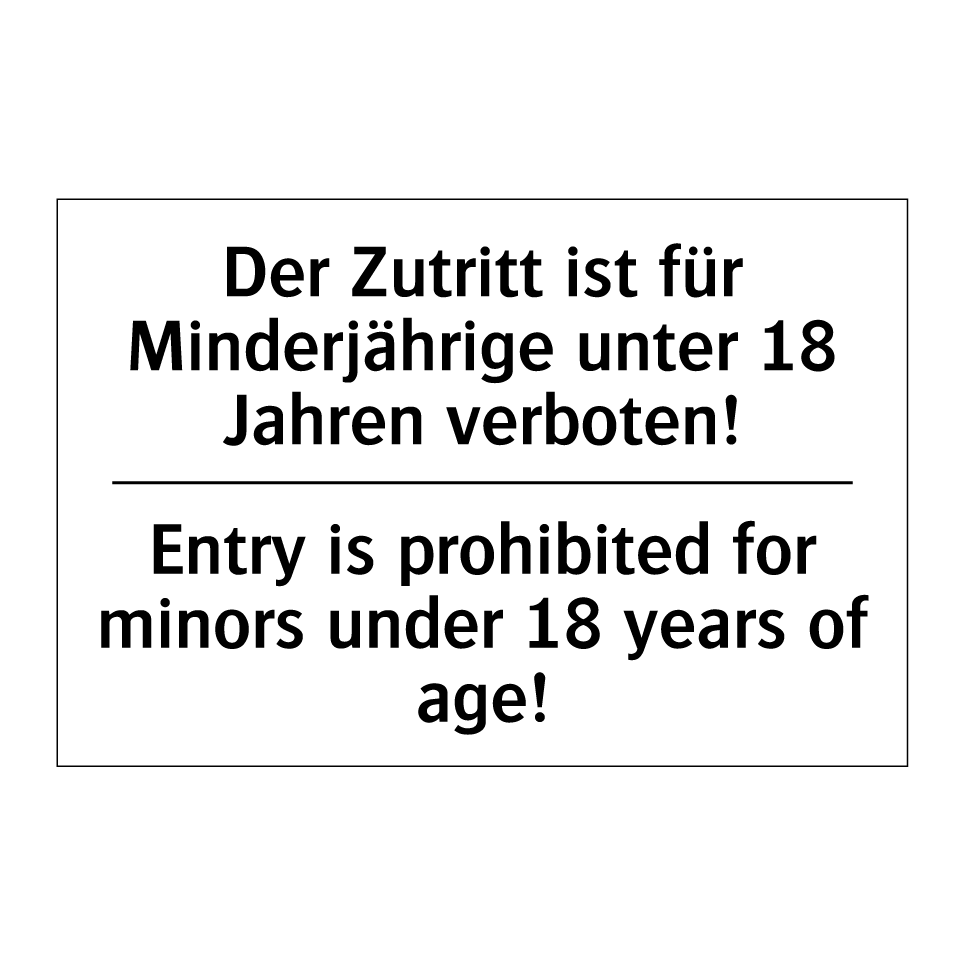 Zweisprachiges Verbotsschild mit deutschem Text Der Zutritt ist für Minderjährige unter 18 Jahren verboten! und englischem Text Entry is prohibited for minors under 18 years of age!