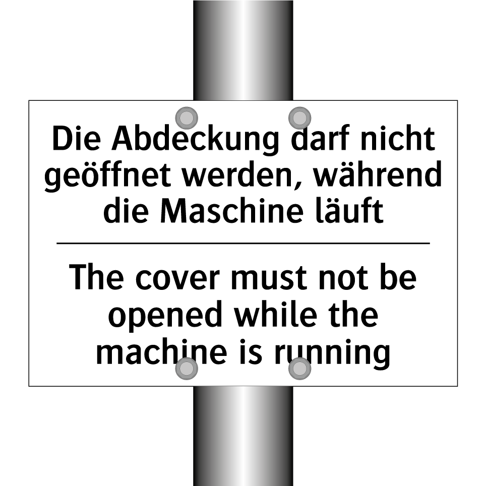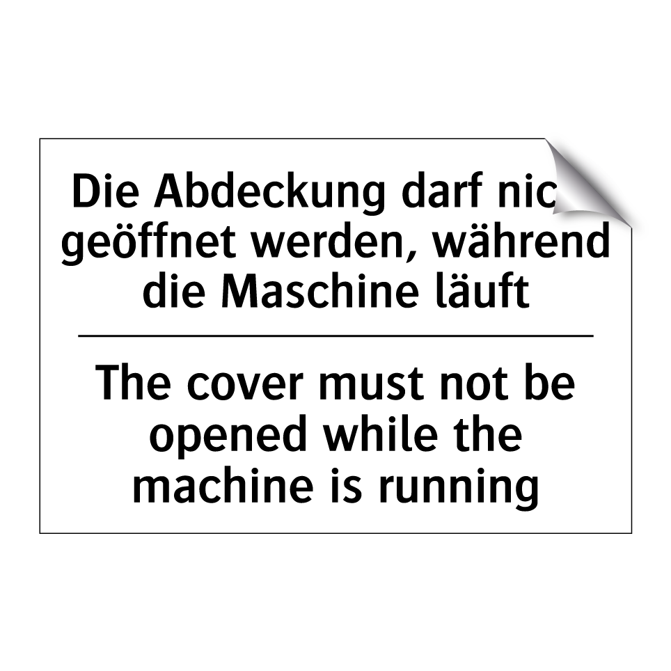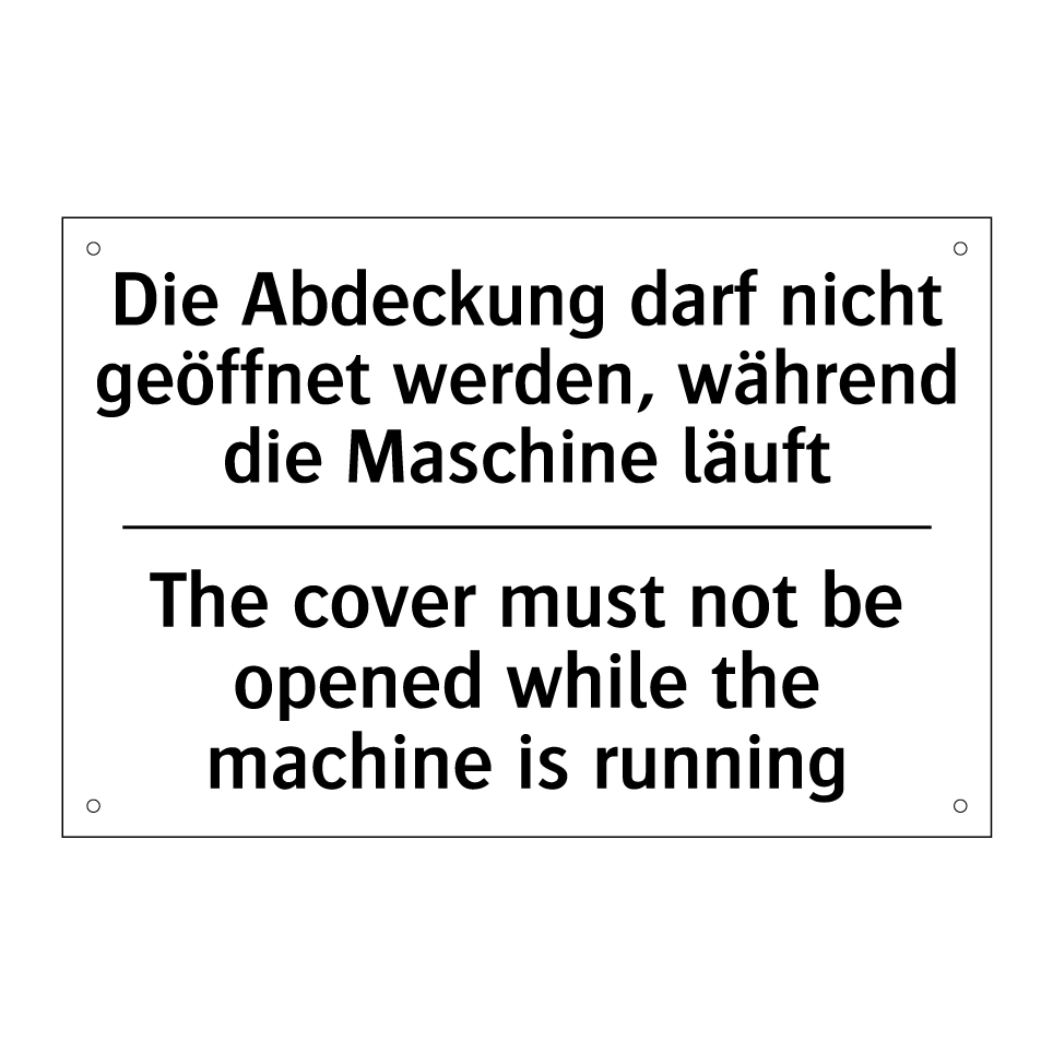 Zweisprachiges Verbotsschild mit deutschem Text Die Abdeckung darf nicht geöffnet werden, während die Maschine läuft und englischem Text The cover must not be opened while the machine is running