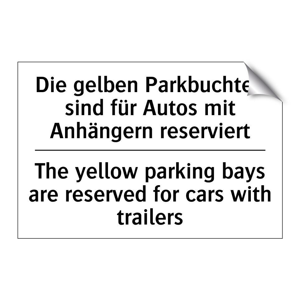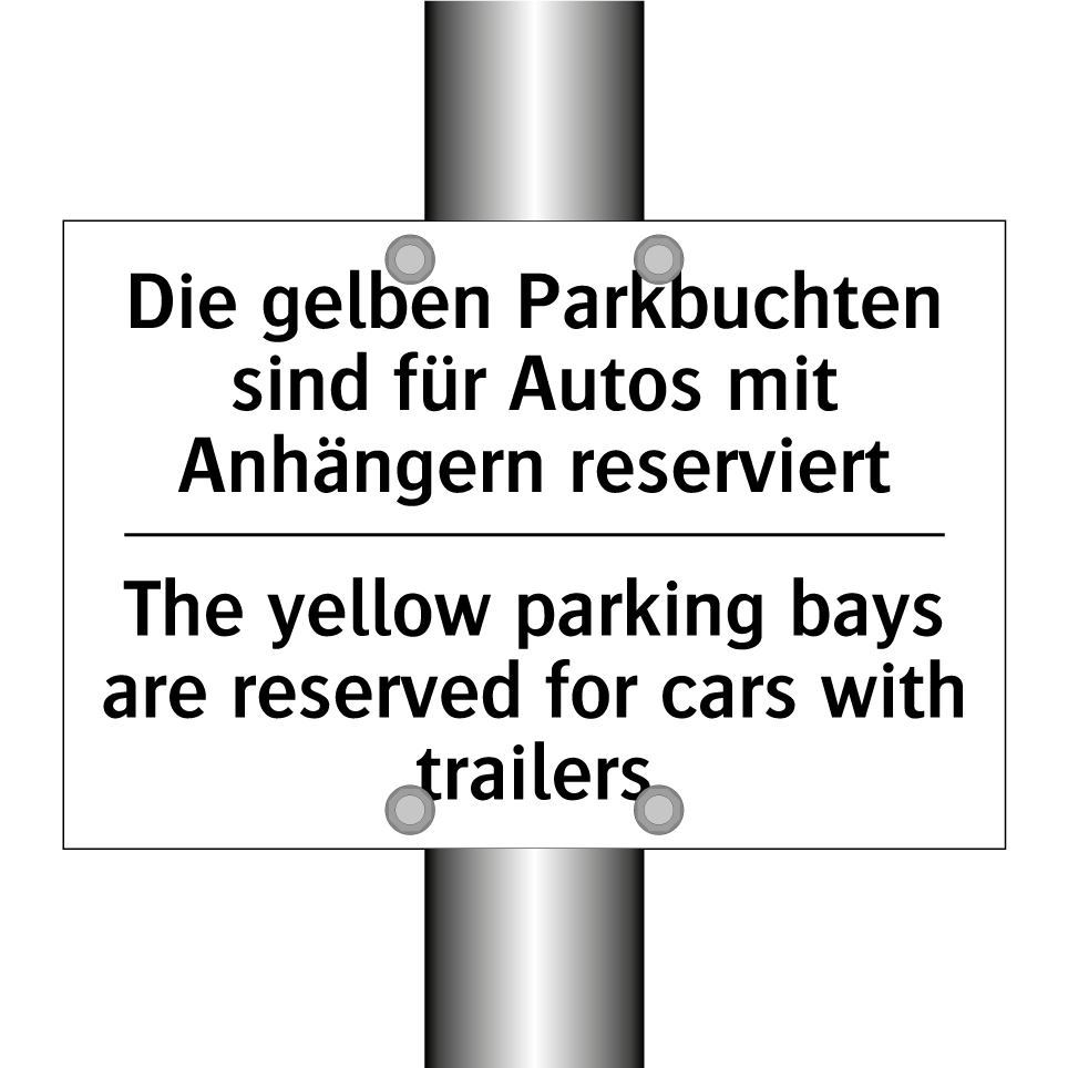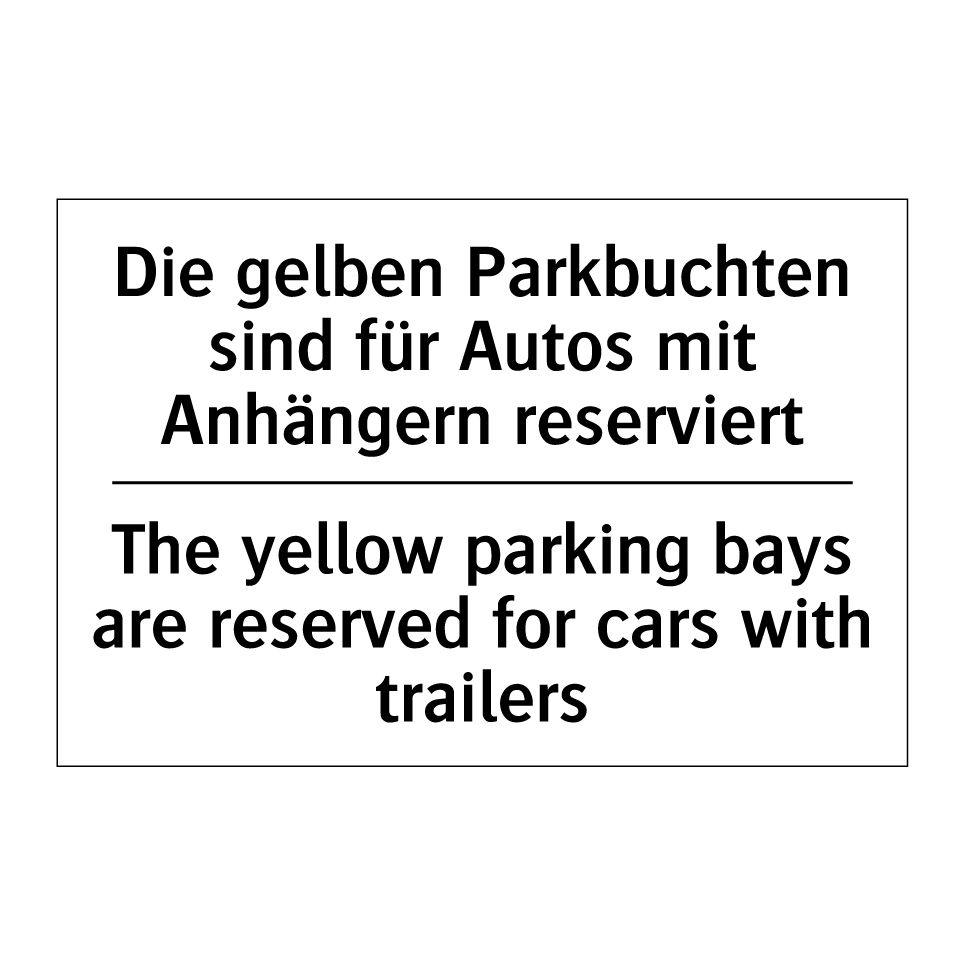 Zweisprachiges Verbotsschild mit deutschem Text Die gelben Parkbuchten sind für Autos mit Anhängern reserviert und englischem Text The yellow parking bays are reserved for cars with trailers