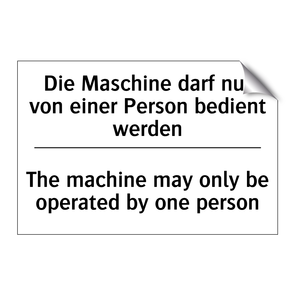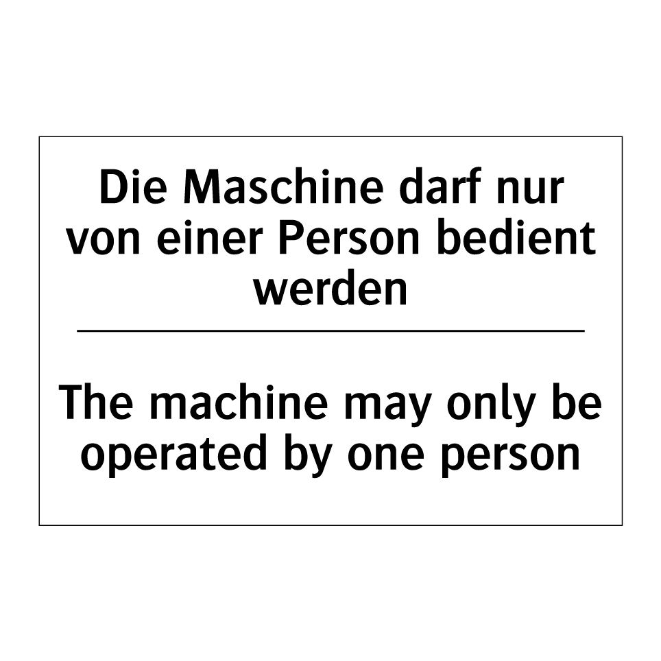 Zweisprachiges Verbotsschild mit deutschem Text Die Maschine darf nur von einer Person bedient werden und englischem Text The machine may only be operated by one person